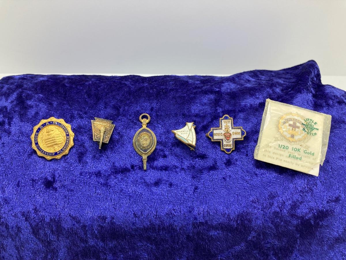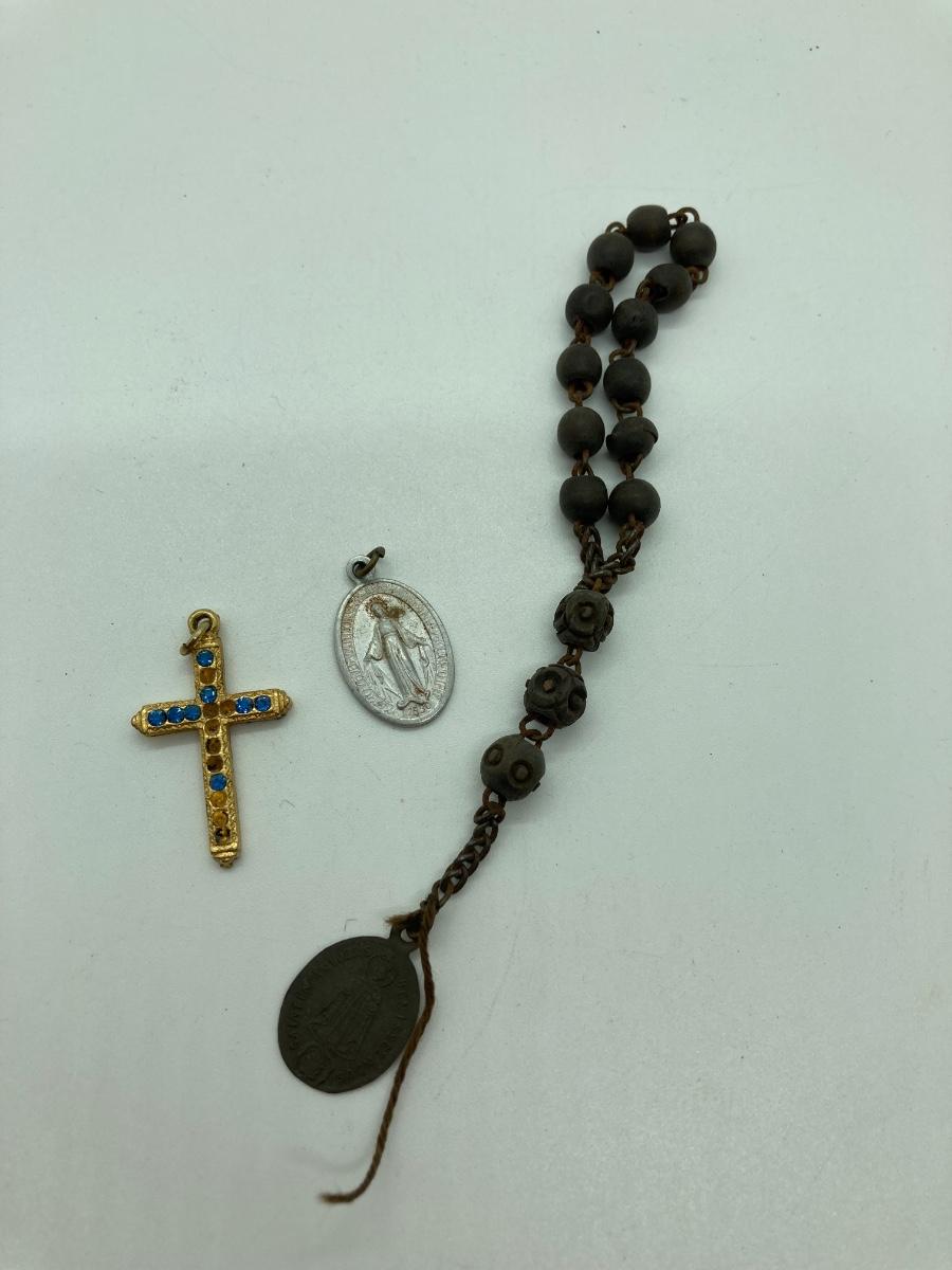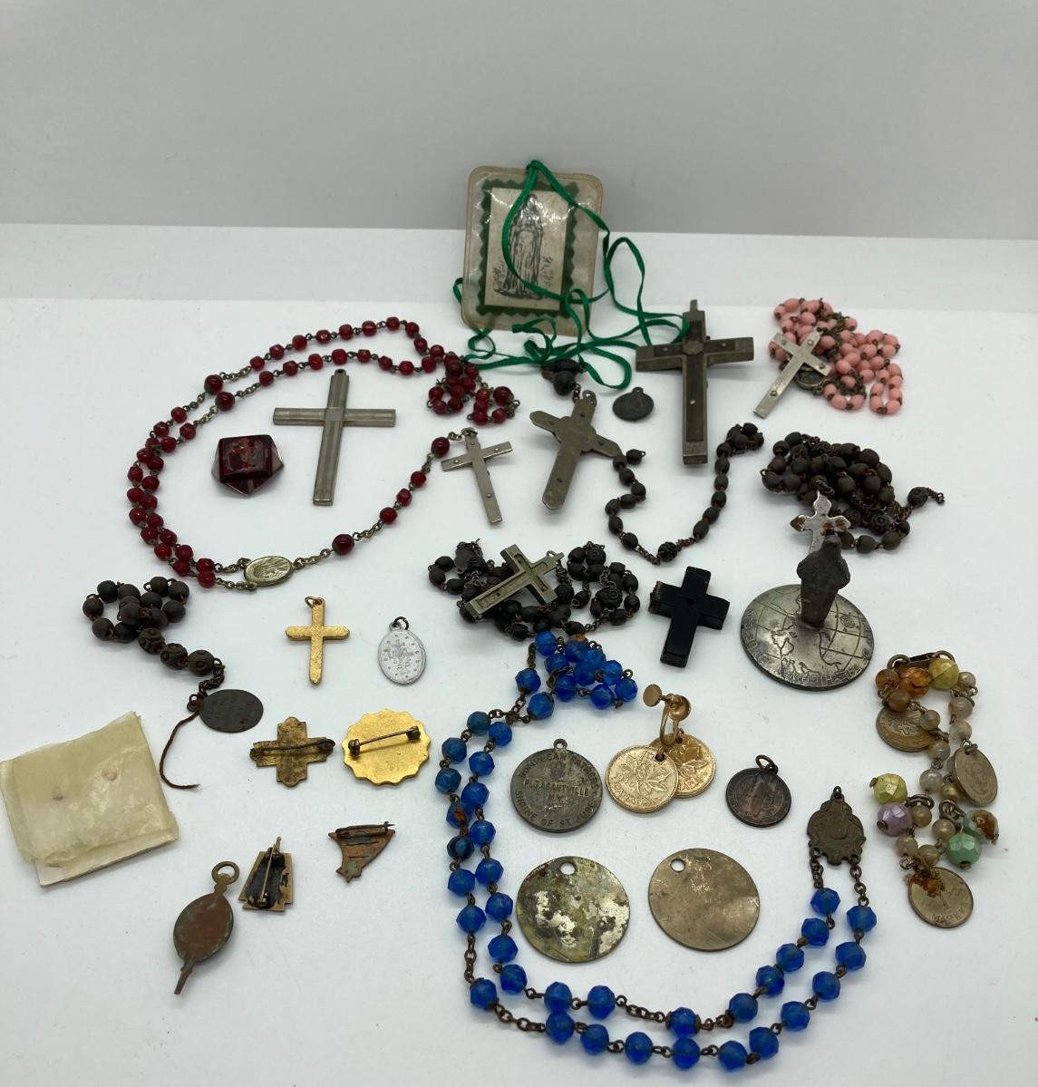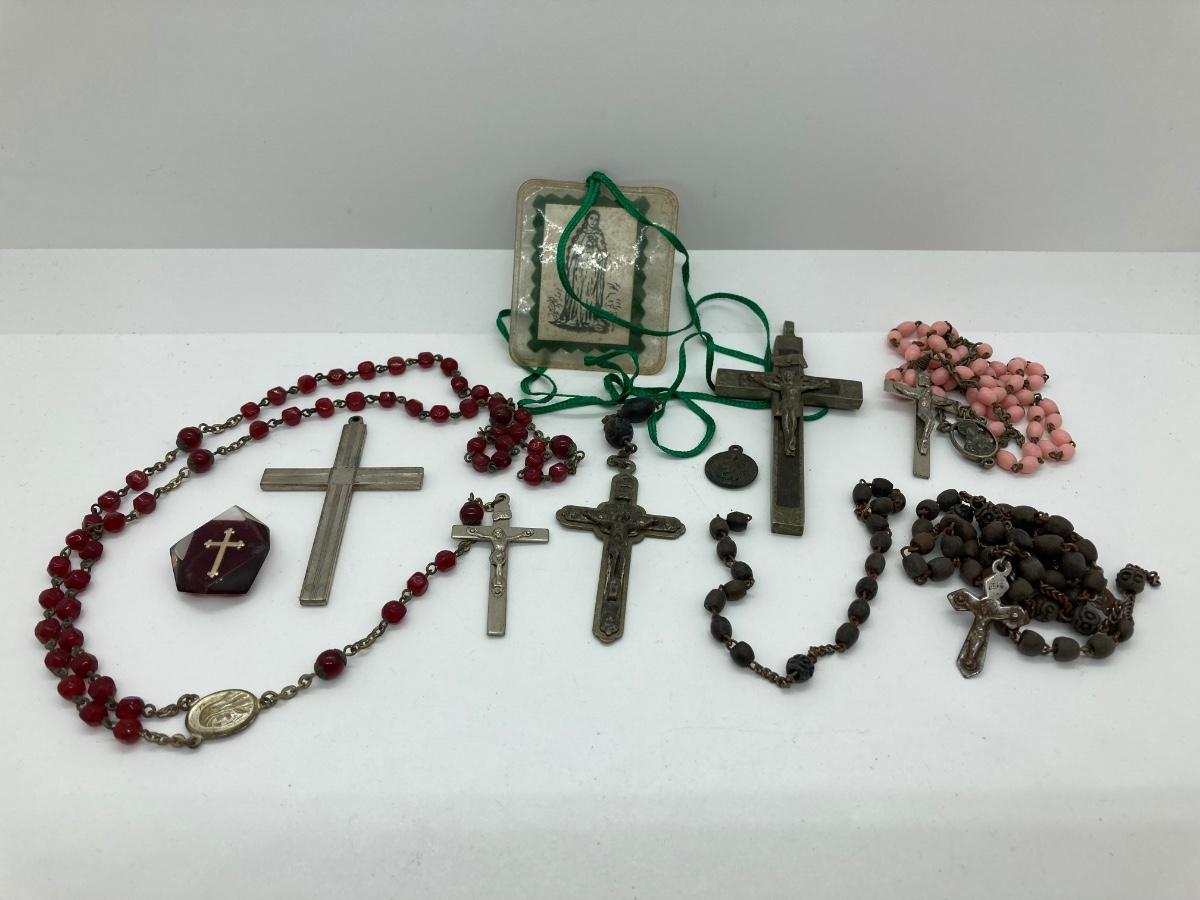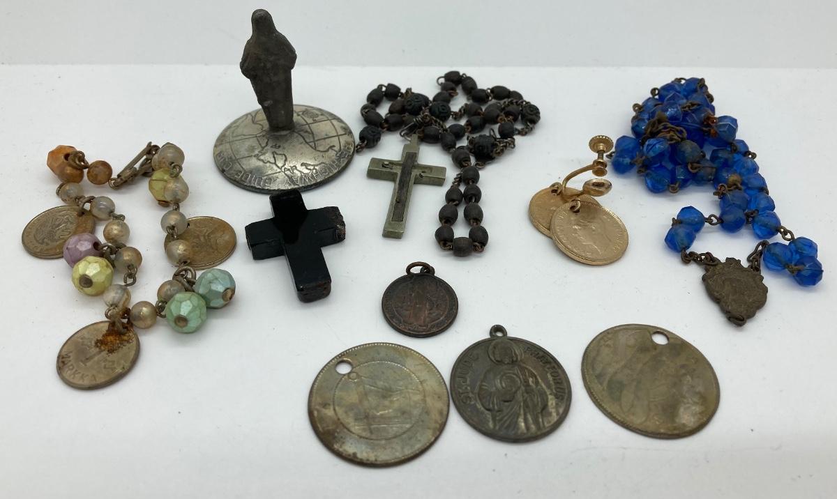 LOT 91J: Religious and Pin Lot: Atlantic City, Antique Wood/Metal Crucifixes, Rosary Beads and More.
