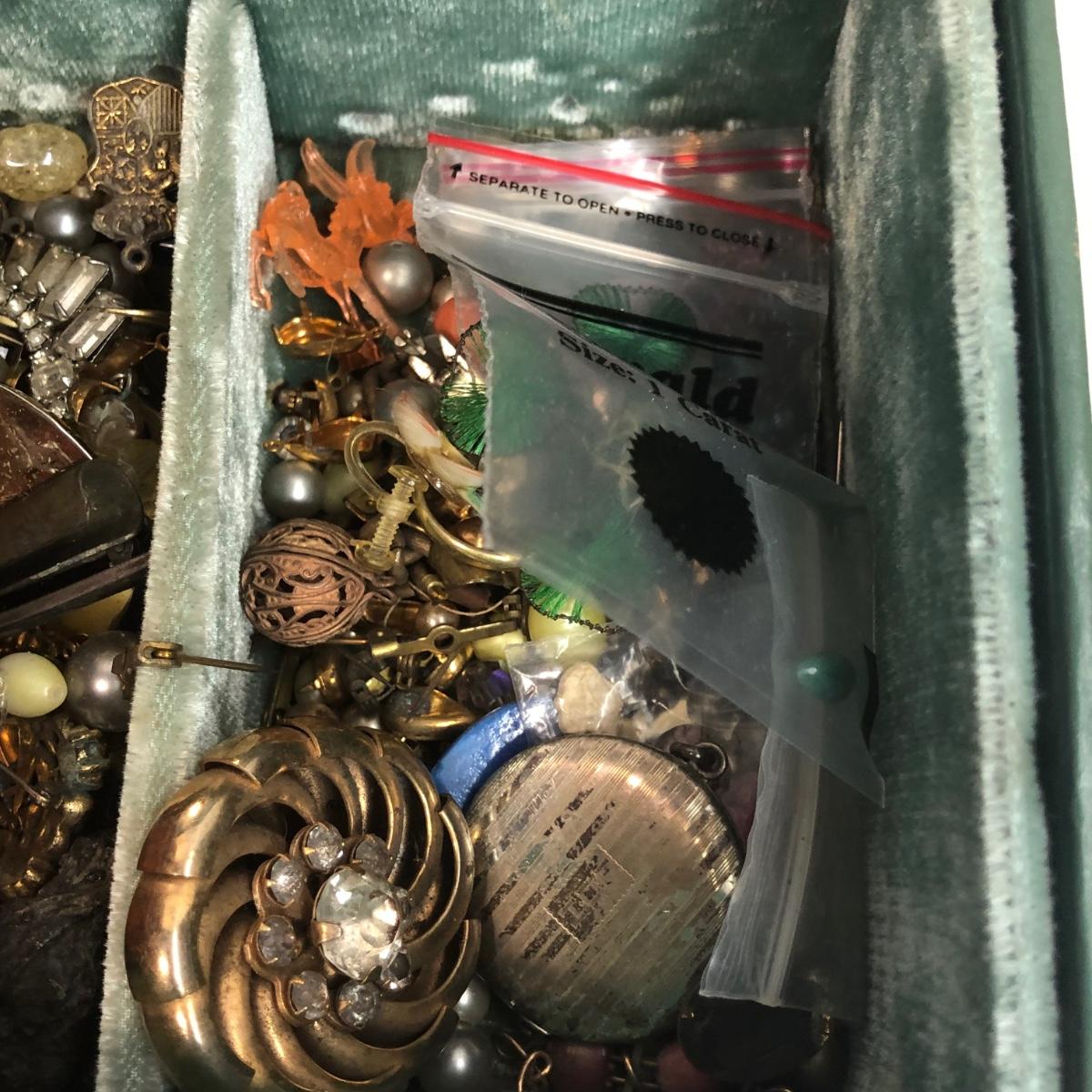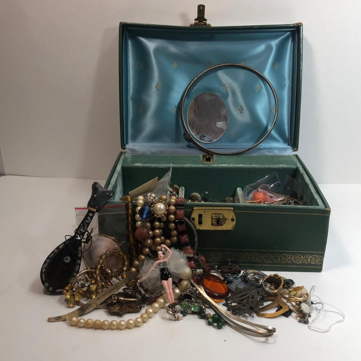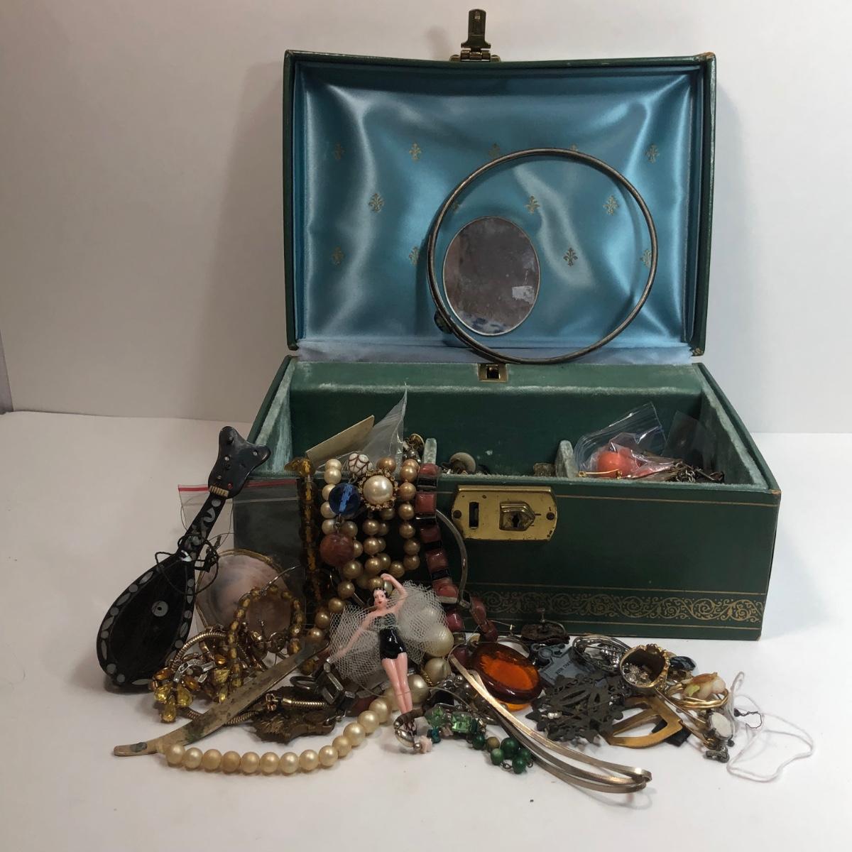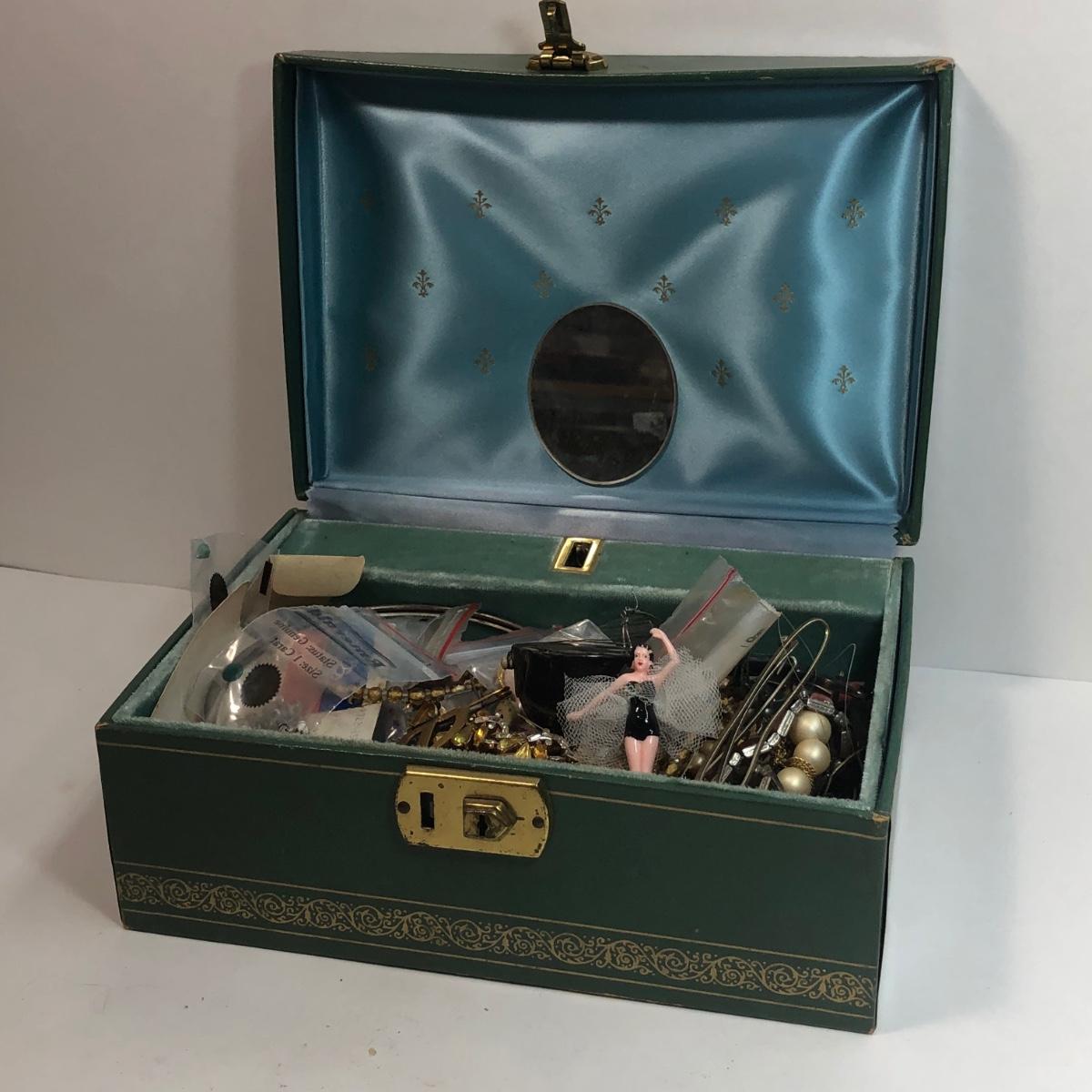 LOT 102: Vintage Jewelry Box w/ Mixed Jewelry & Crafting Pieces