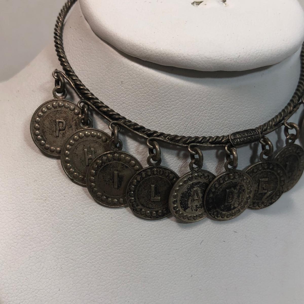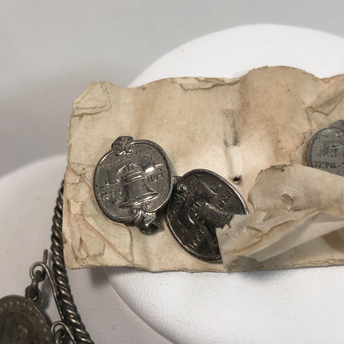LOT 113: Sterling Silver Philadelphia Charm Bangle Bracelet & Liberty Bell Pins (tw: 16.85g)