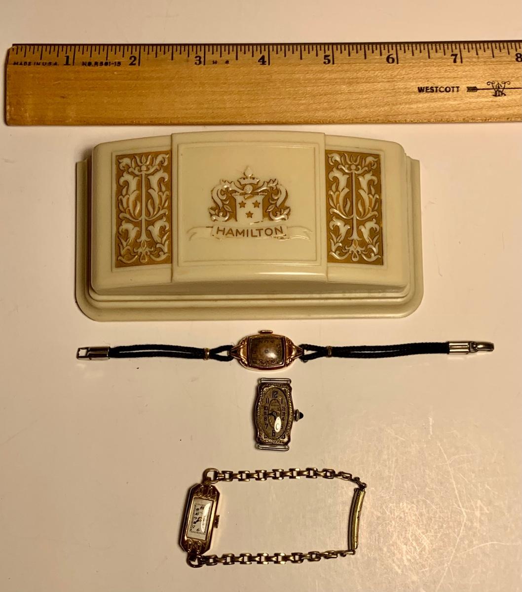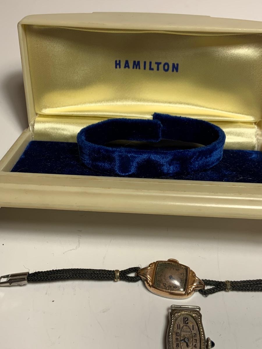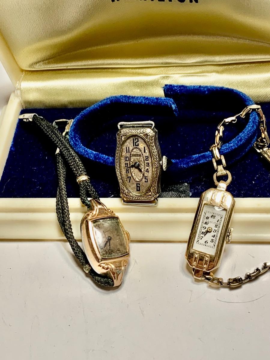 LOTJ10: Three Antique Ladies Watches With an Antique Hamilton Watch Case. Taylor Gold Fill Over Sterling, Bulova,