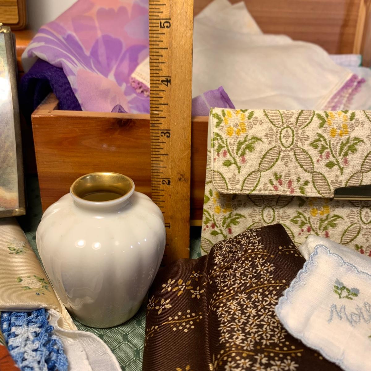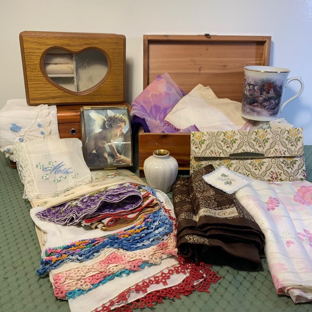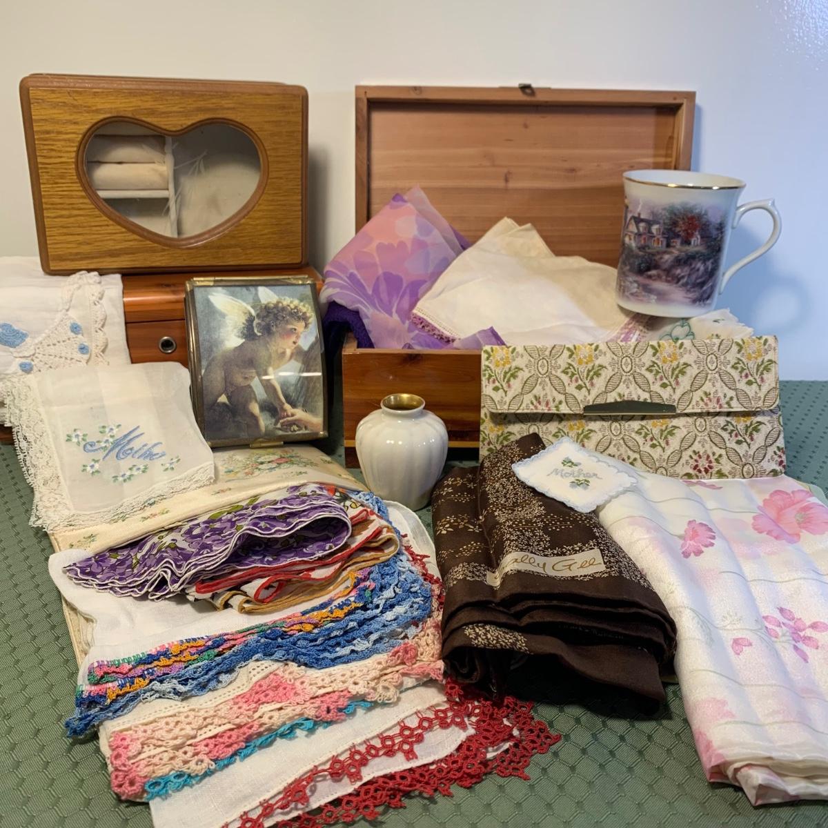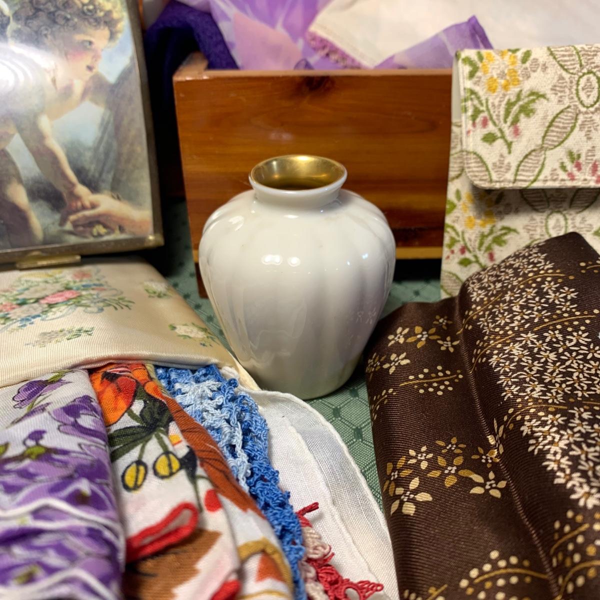 LOT 31: Vintage Ladies Handkerchiefs, Lenox Teacup & 24k Rimmed Vase, Lane Cedar Trinket Box, "Mother" Cedarn Trinket Box & More