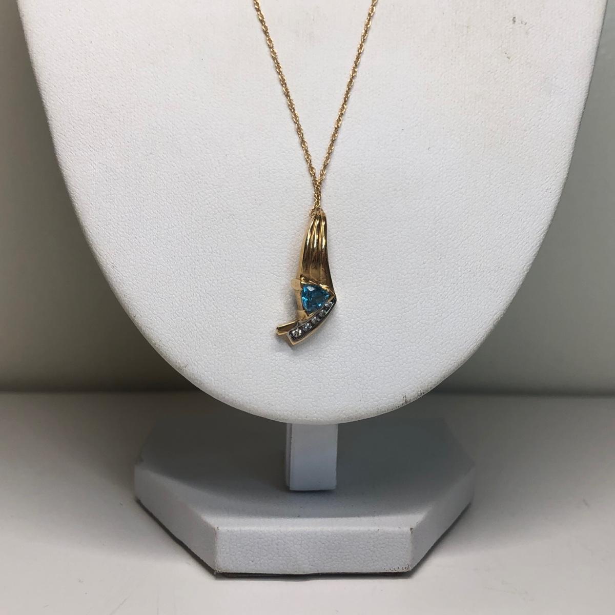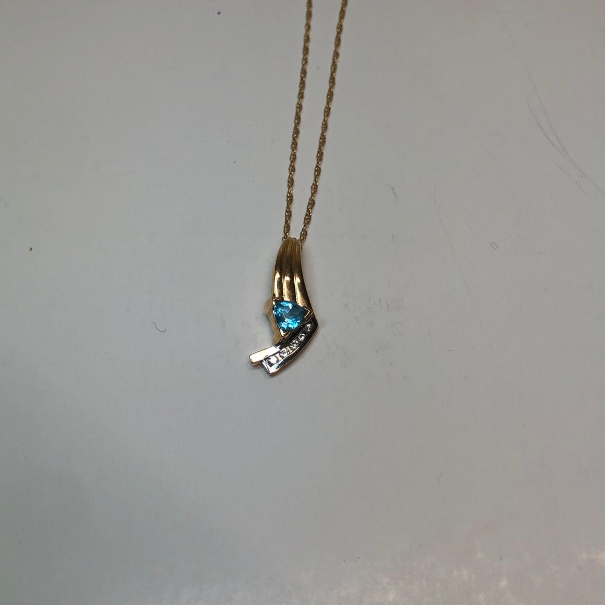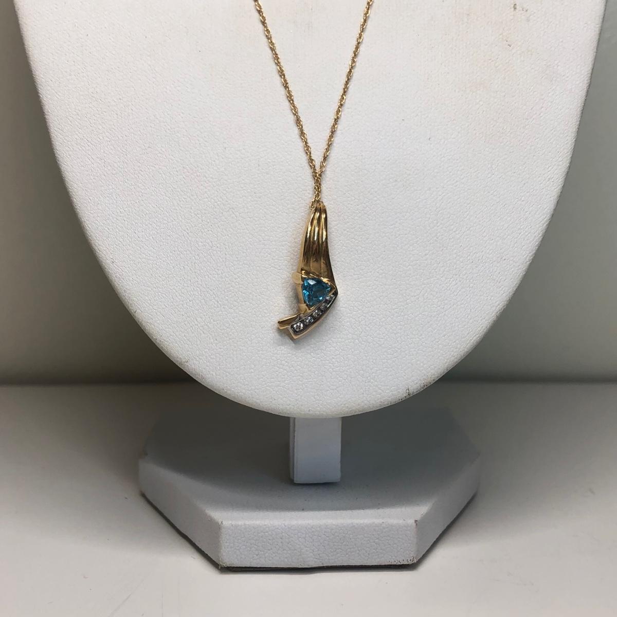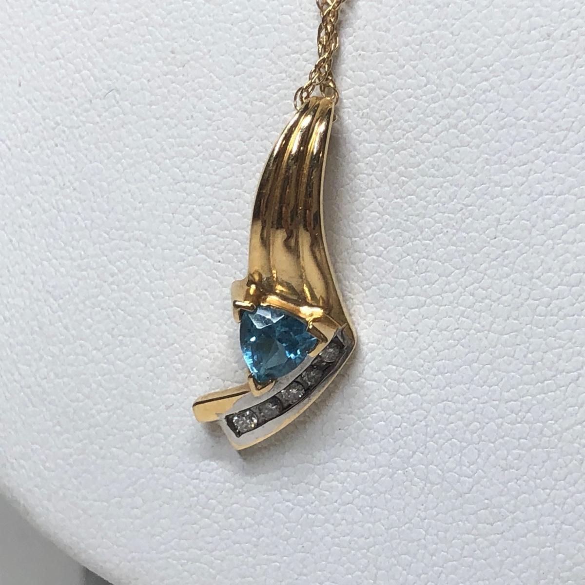 LOT 42M: 14K Gold Blue Topaz & Diamond Chip Pendant Necklace (tw: 2.88g)