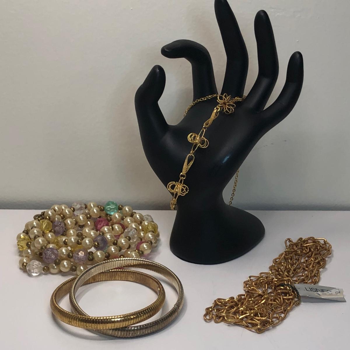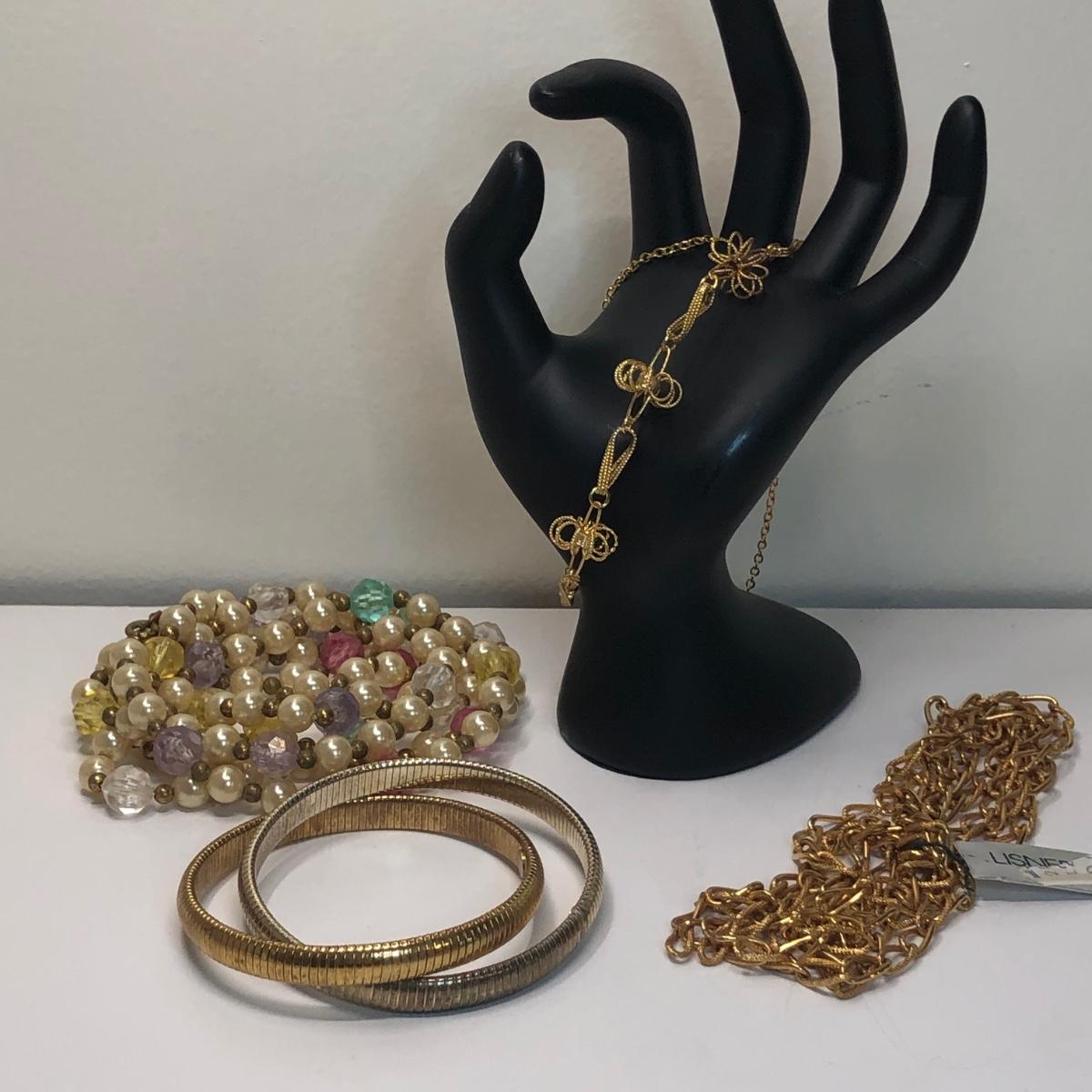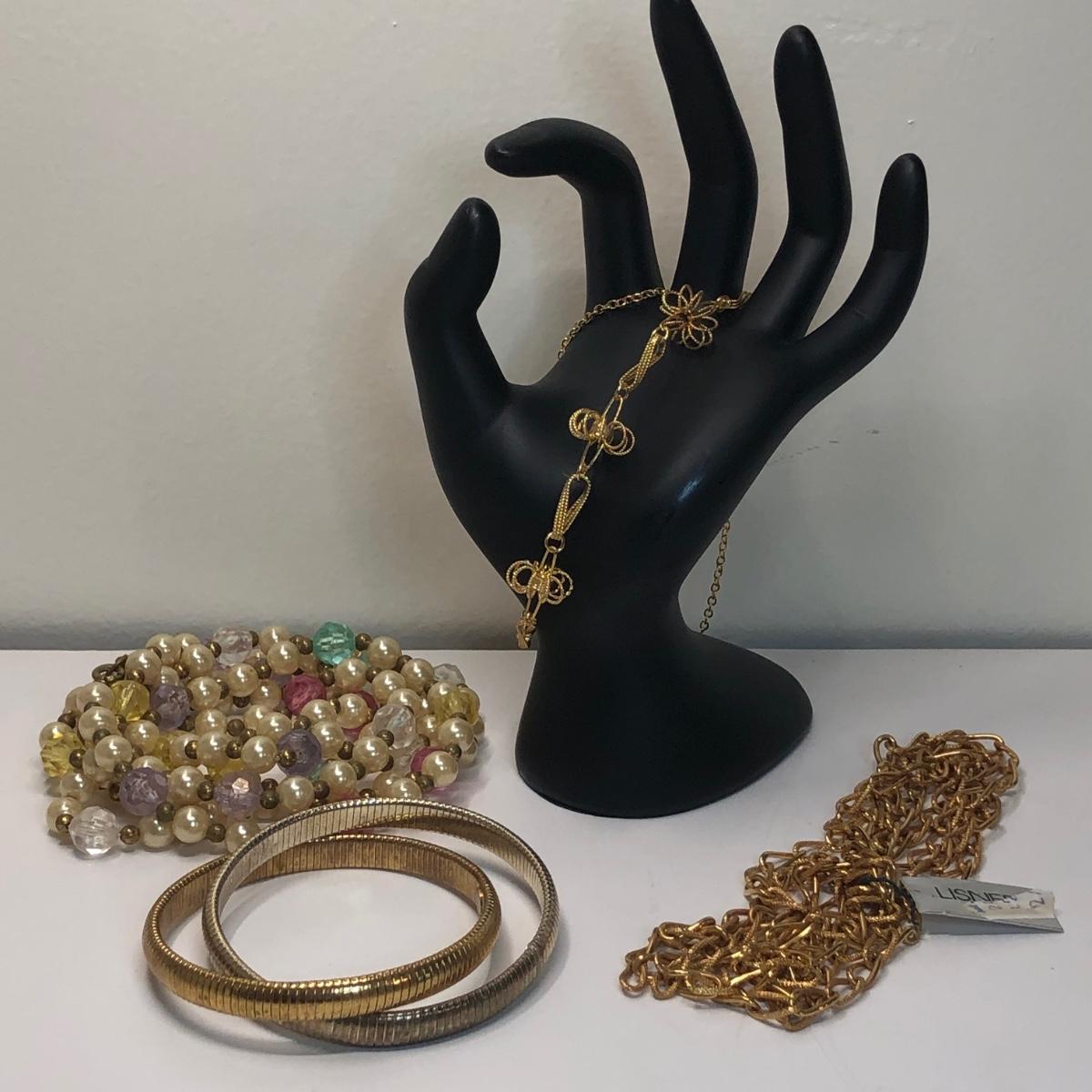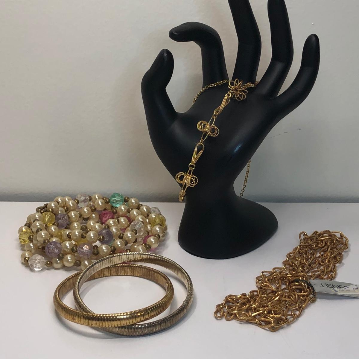 LOT 52M: Faux Pearl & Bead Necklace, Gold Tone Knotted Necklace, Chain Link Gold Ton & Bangles