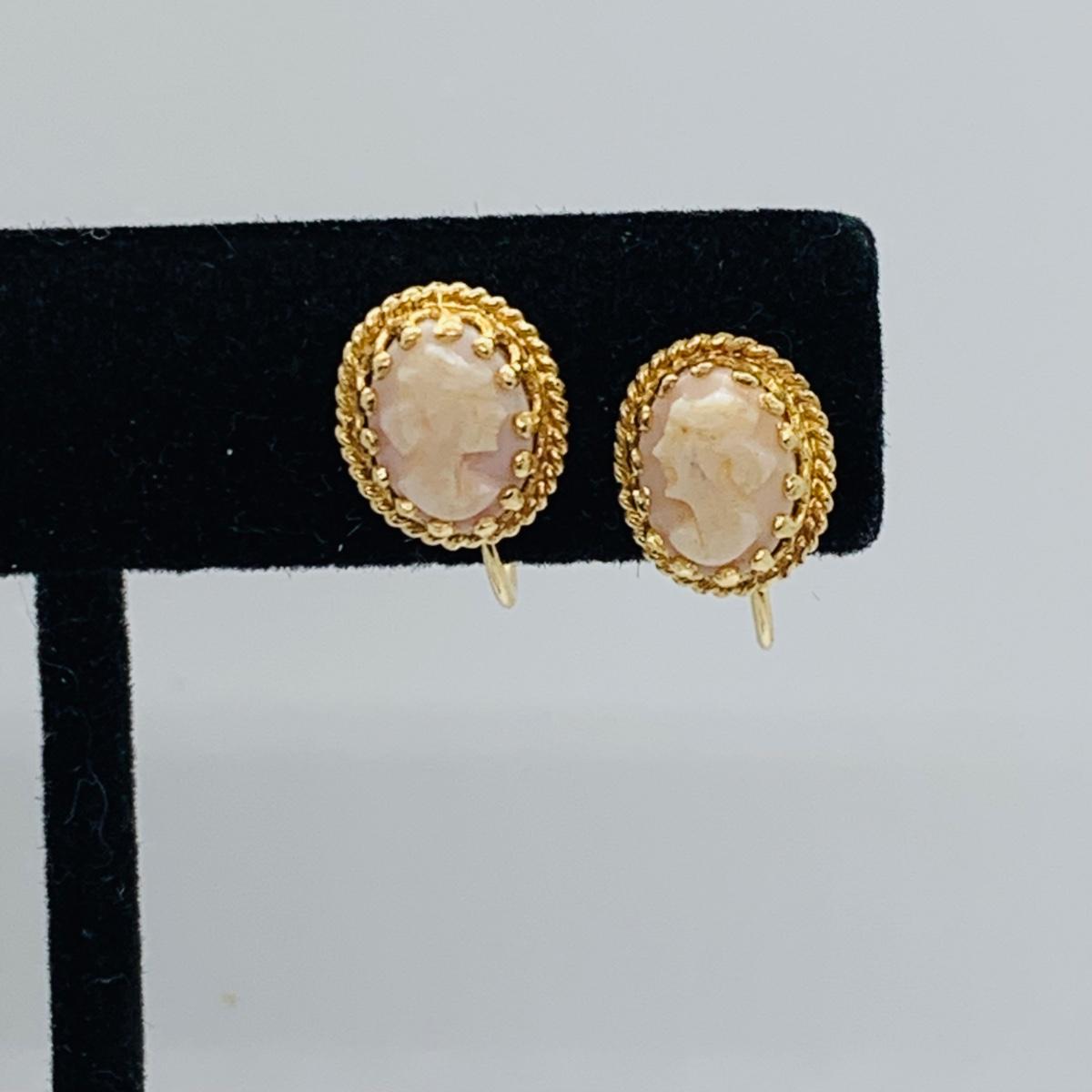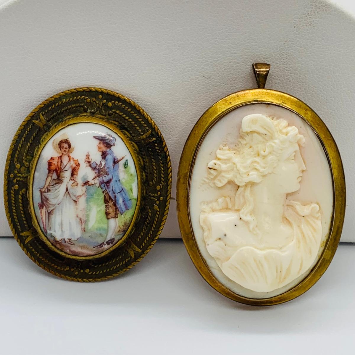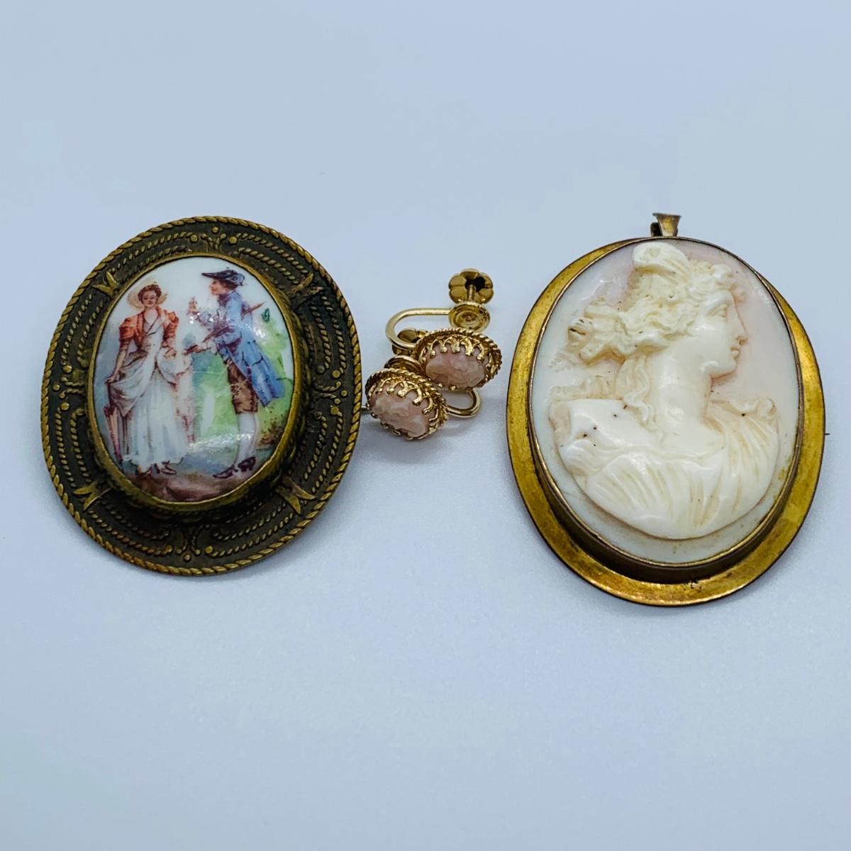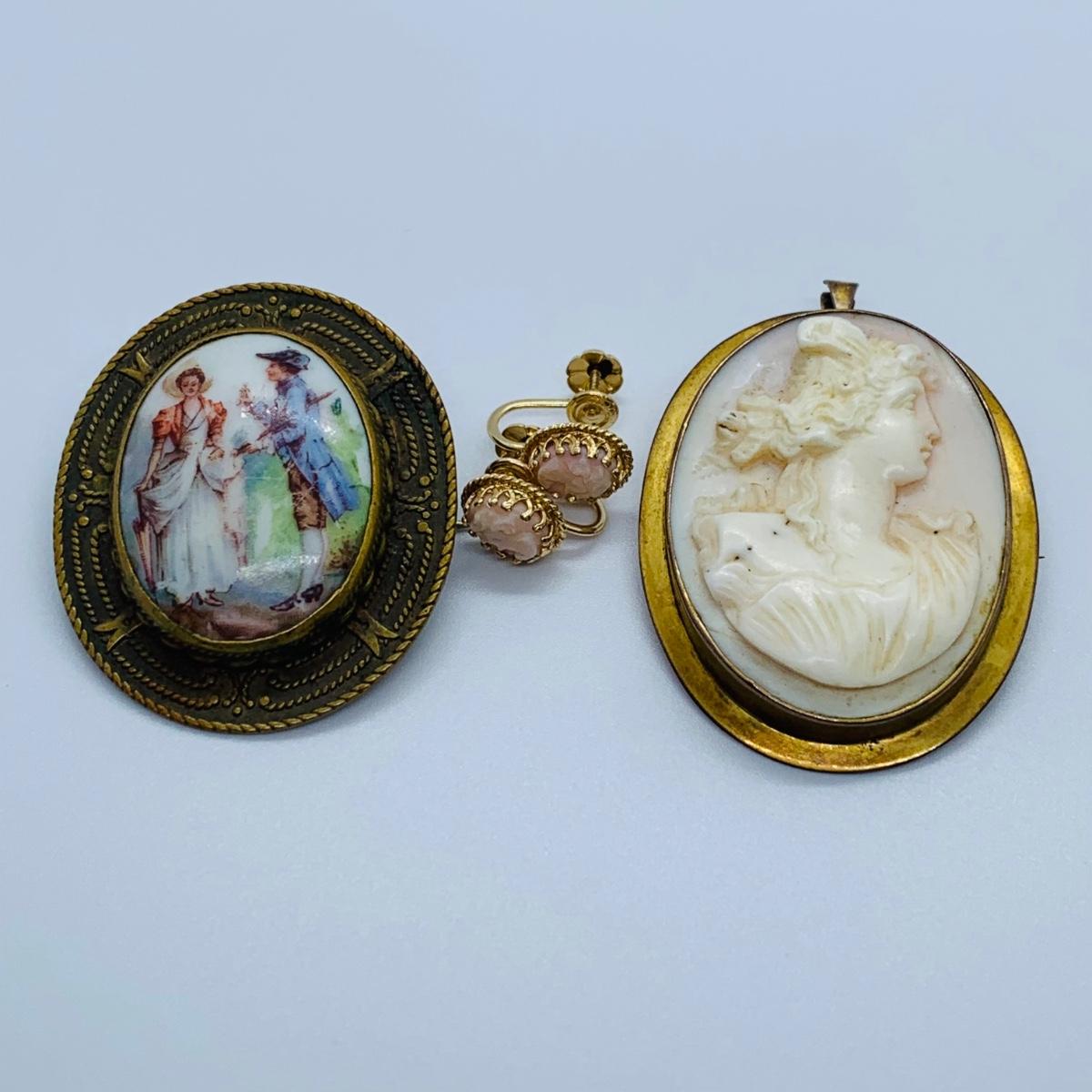 LOT 60: 14K Cameo Screwback Earrings, Antique Hand Painted Porcelain Victorian Brooch, Cameo Pendant