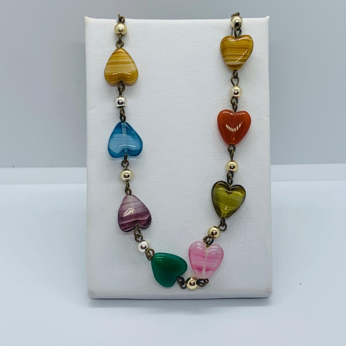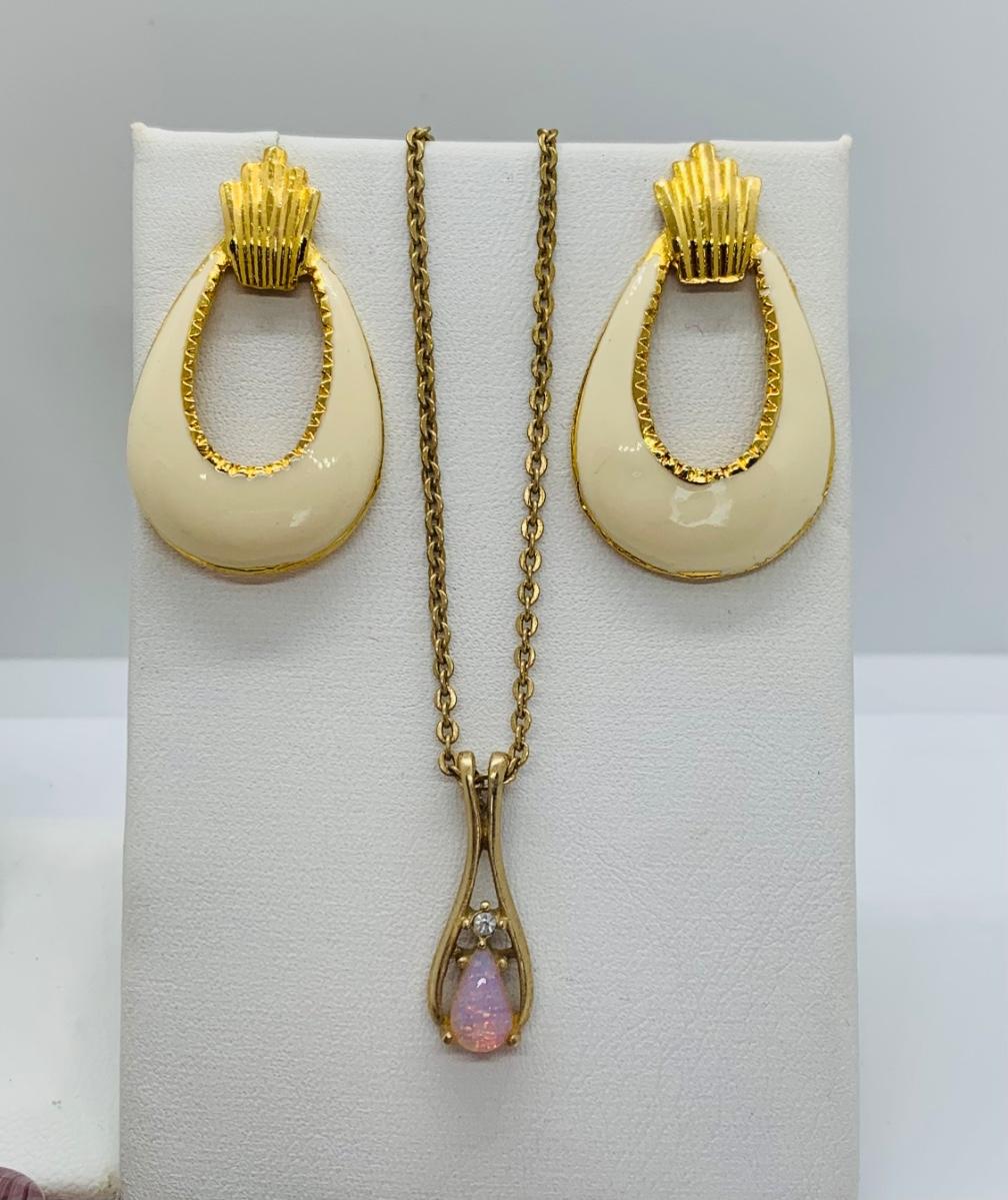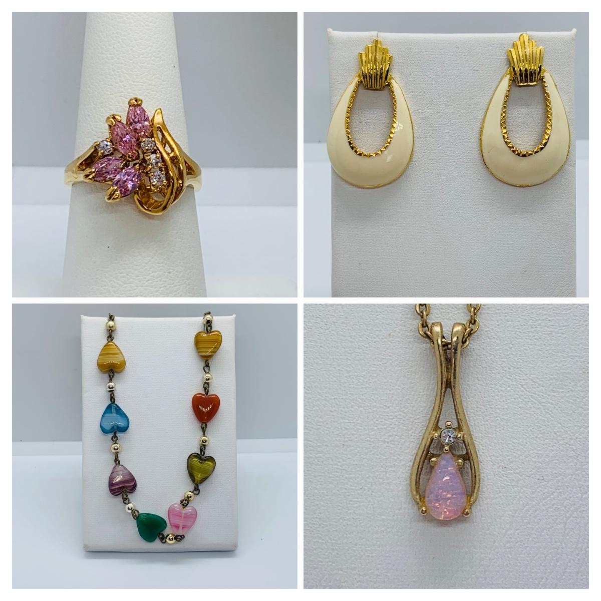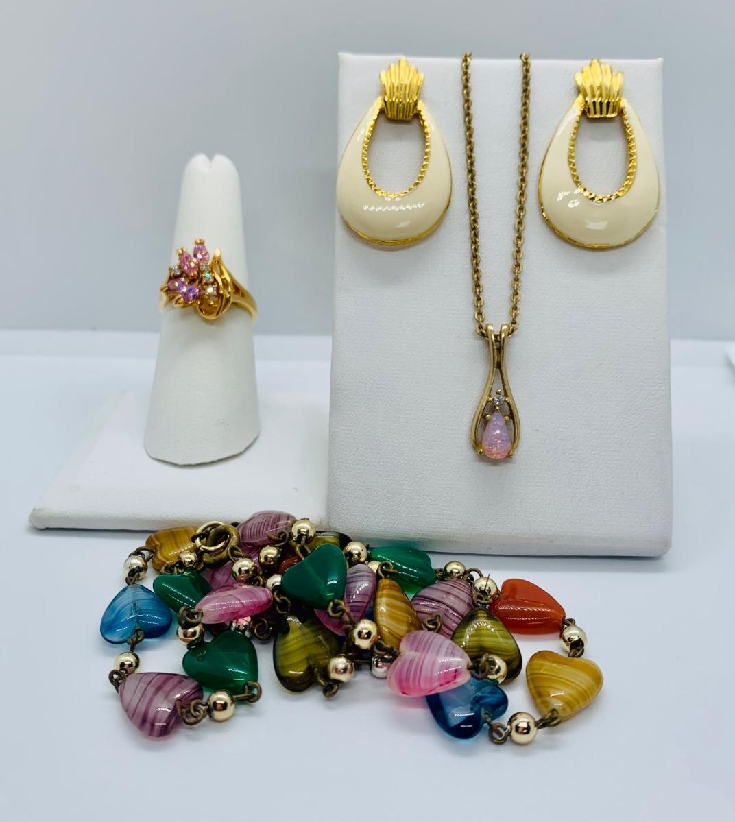 LOT 66: 18k Gold Filled Ring, 20" Heart Beaded Necklace, 16" Avon Opal Necklace, Pierced Enamel Fashion Earrings