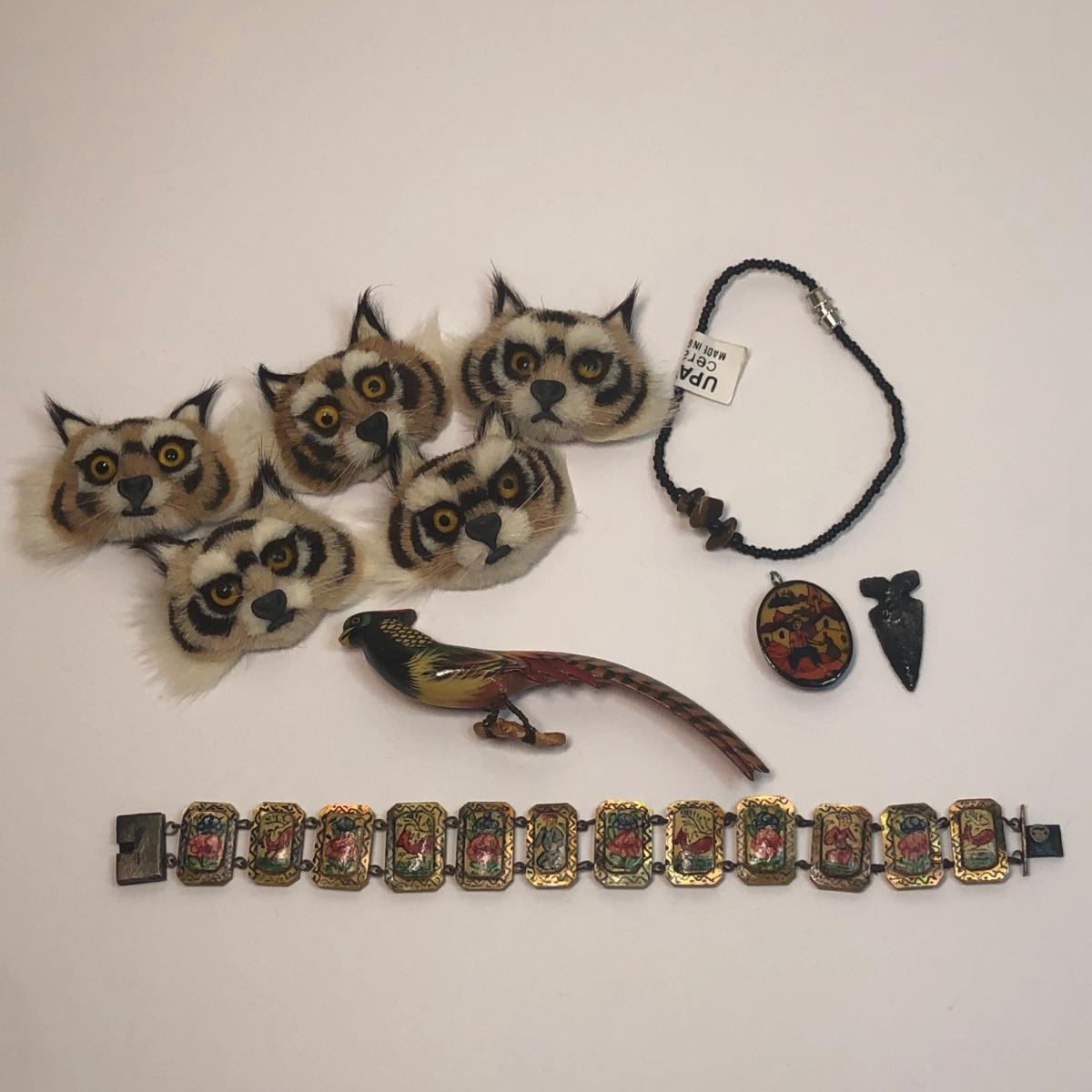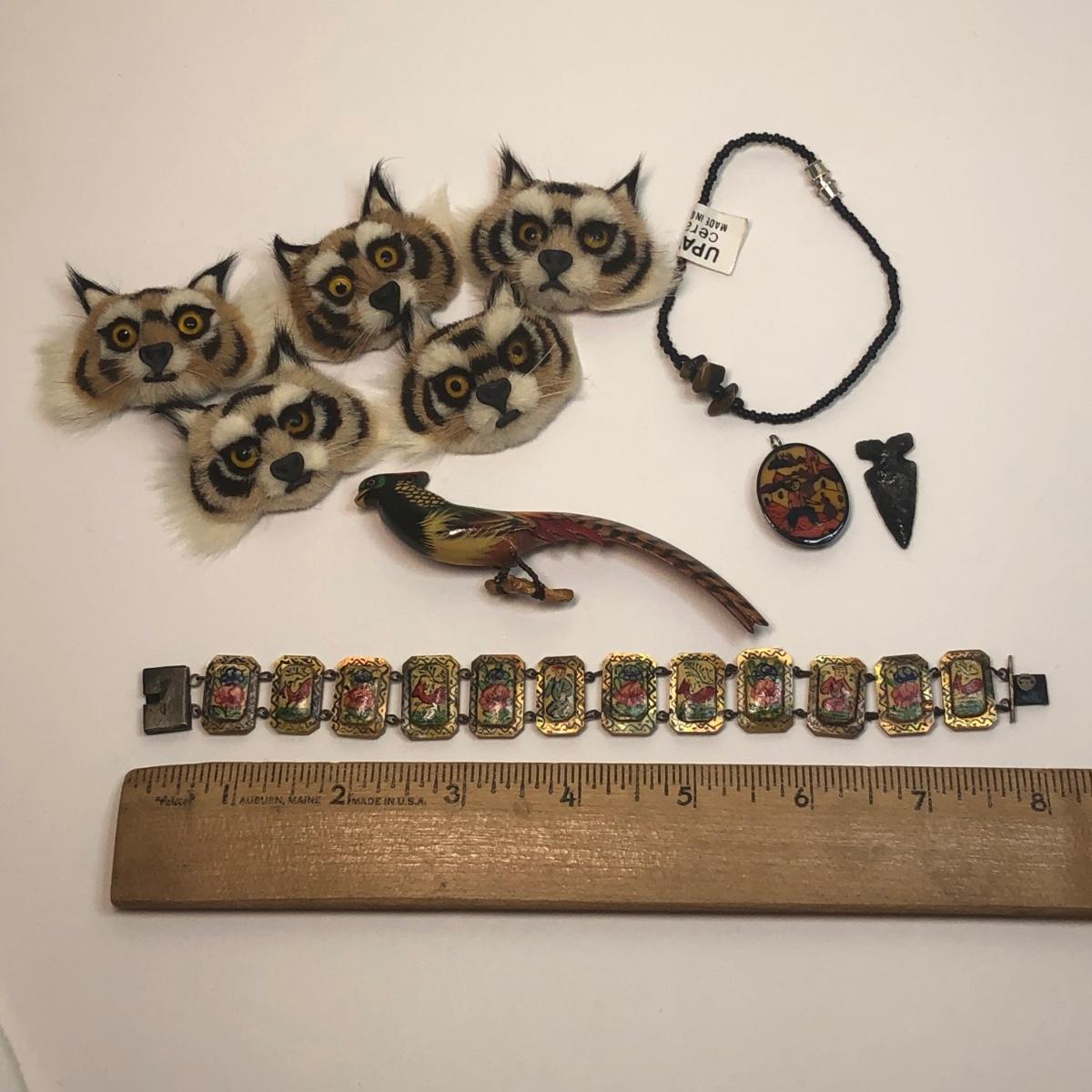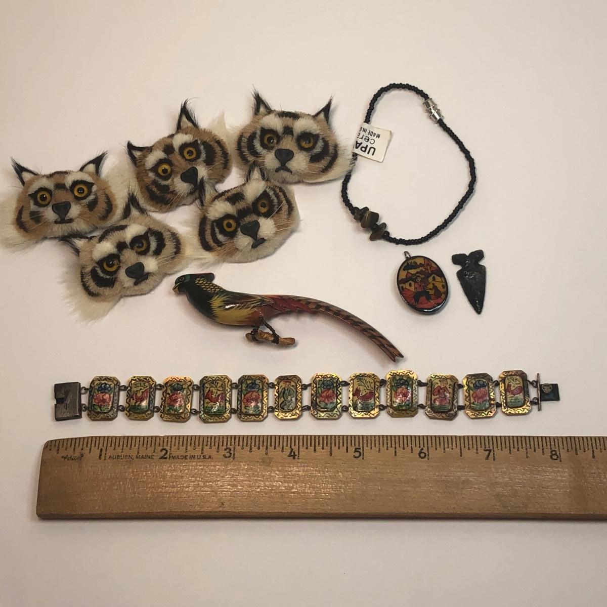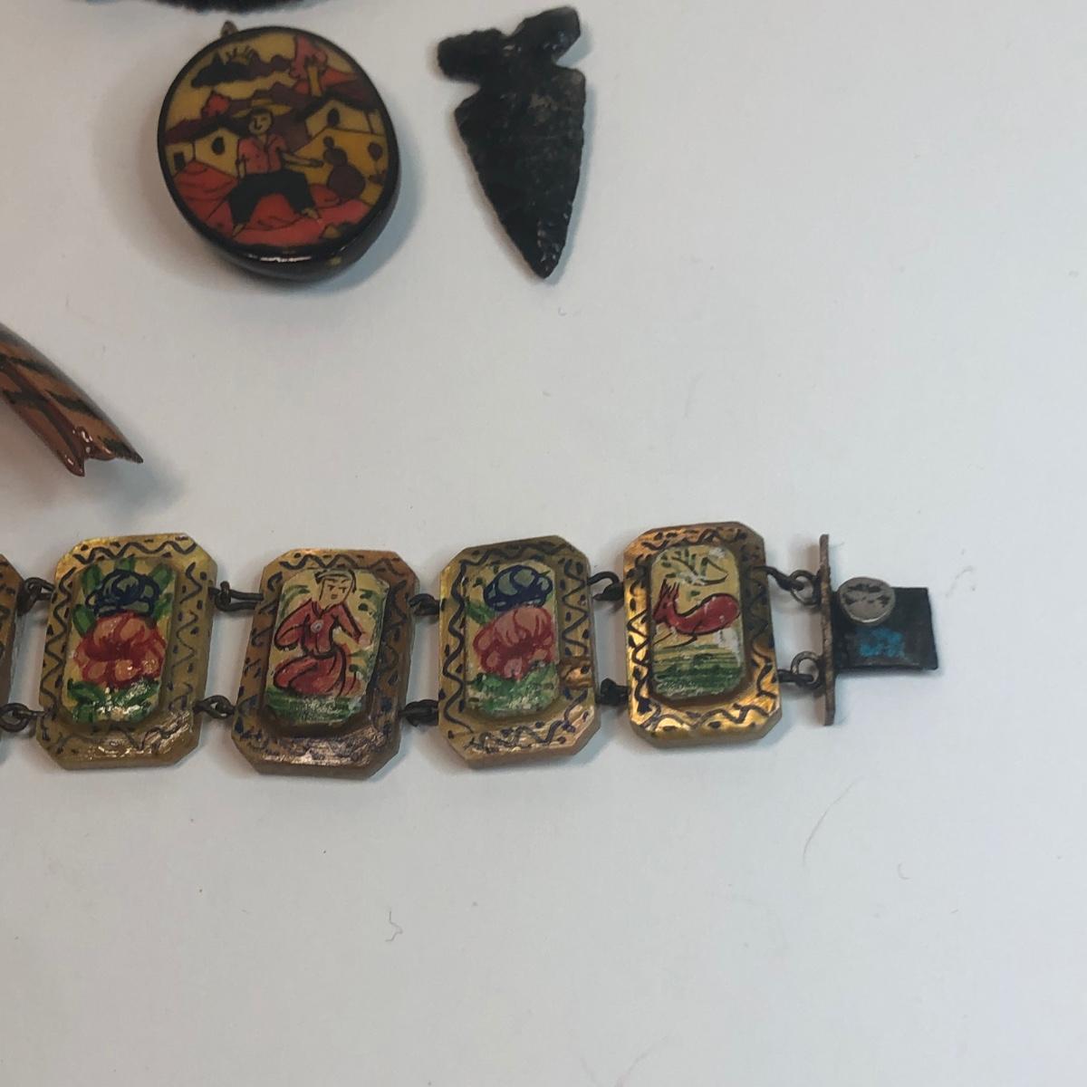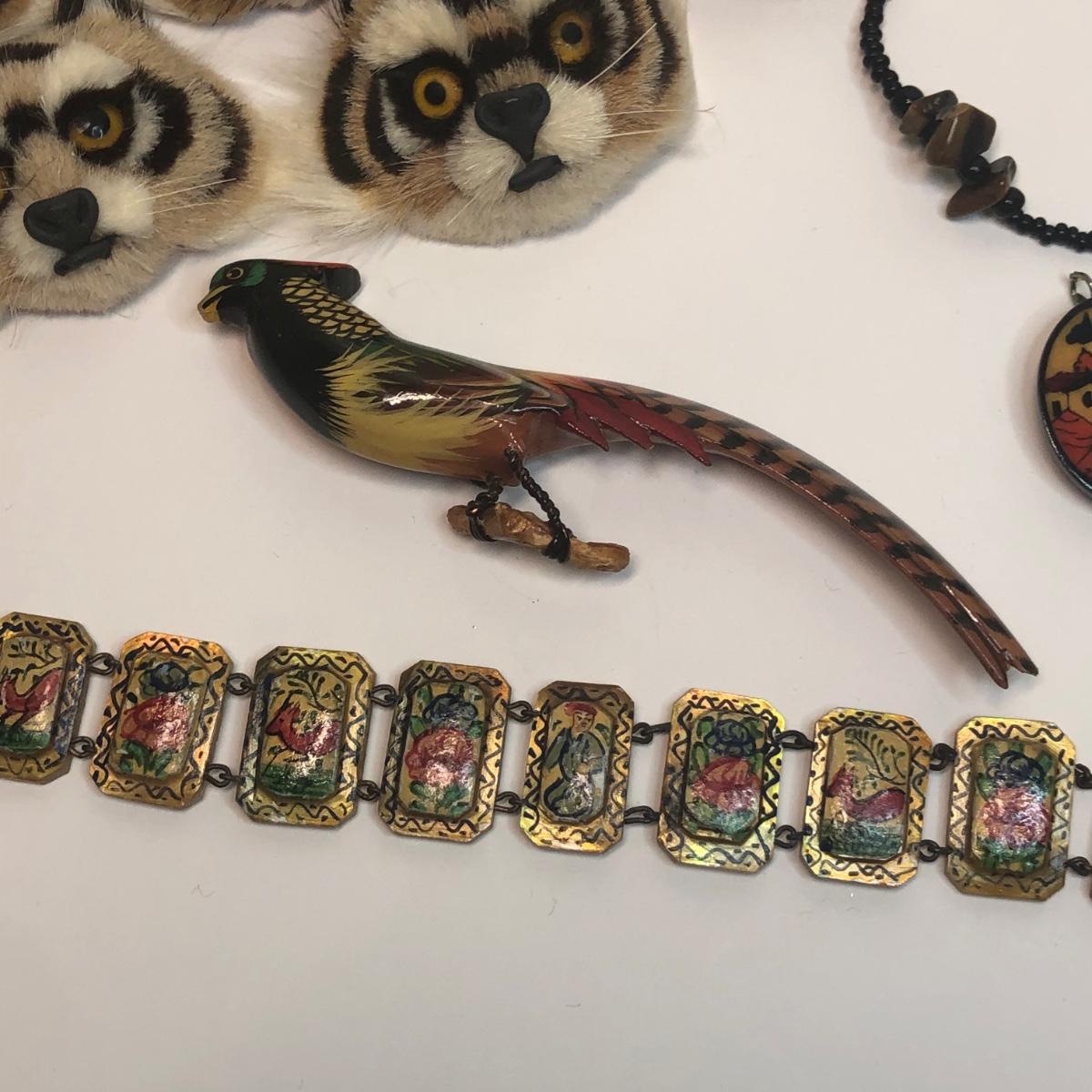 LOT 88M: Vintage Handpainted Mother of Pearl Bracelet w/ Non-metallic Clasp, Carved Pheasant Pin & More