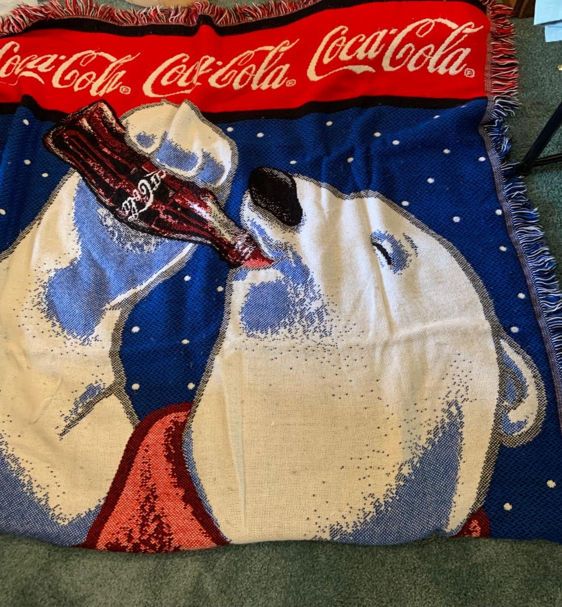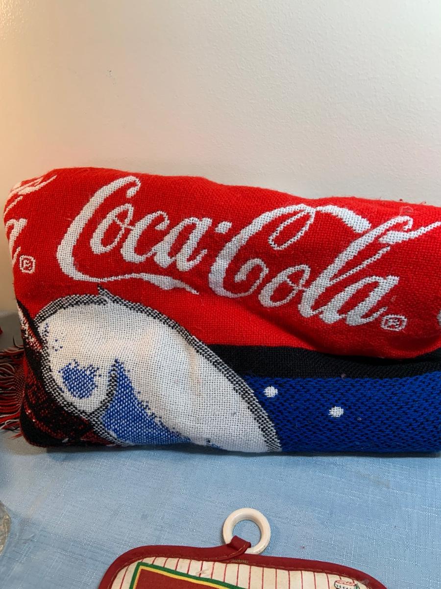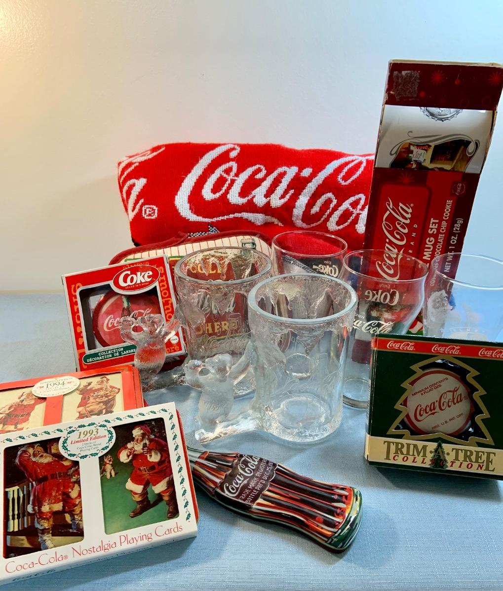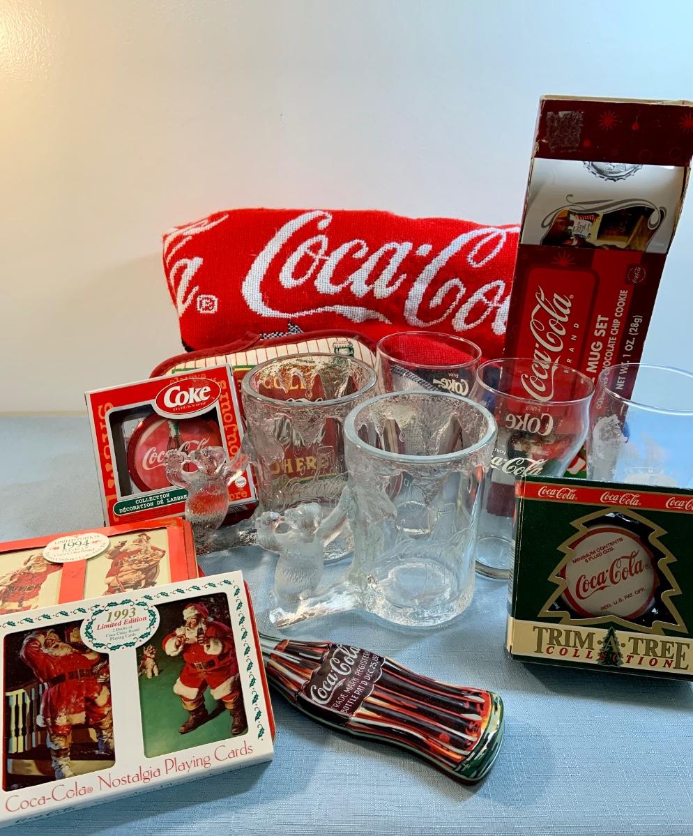 LOT145G: Coca Cola Collection Including a Coke Polar Bear Blanket and Mugs, Holiday Ornaments, and Playing Cards, and More.