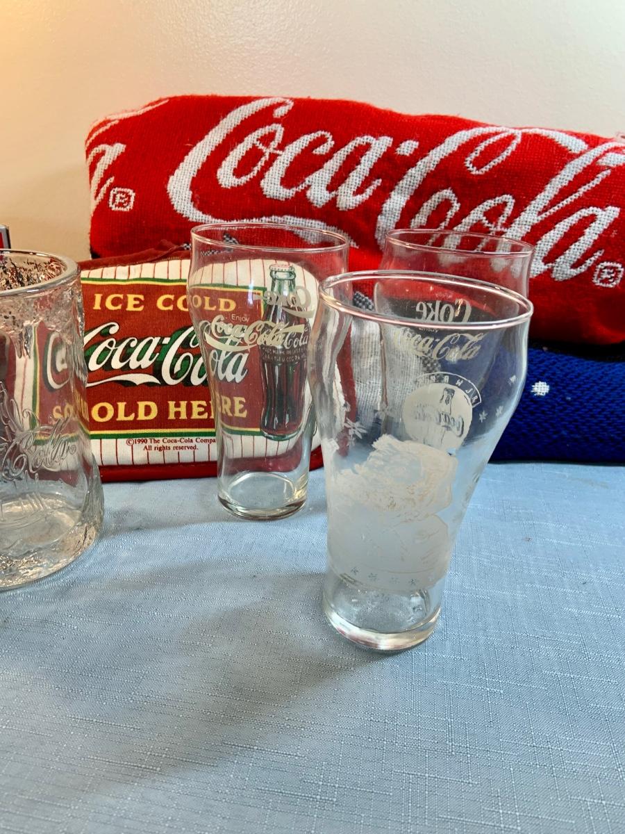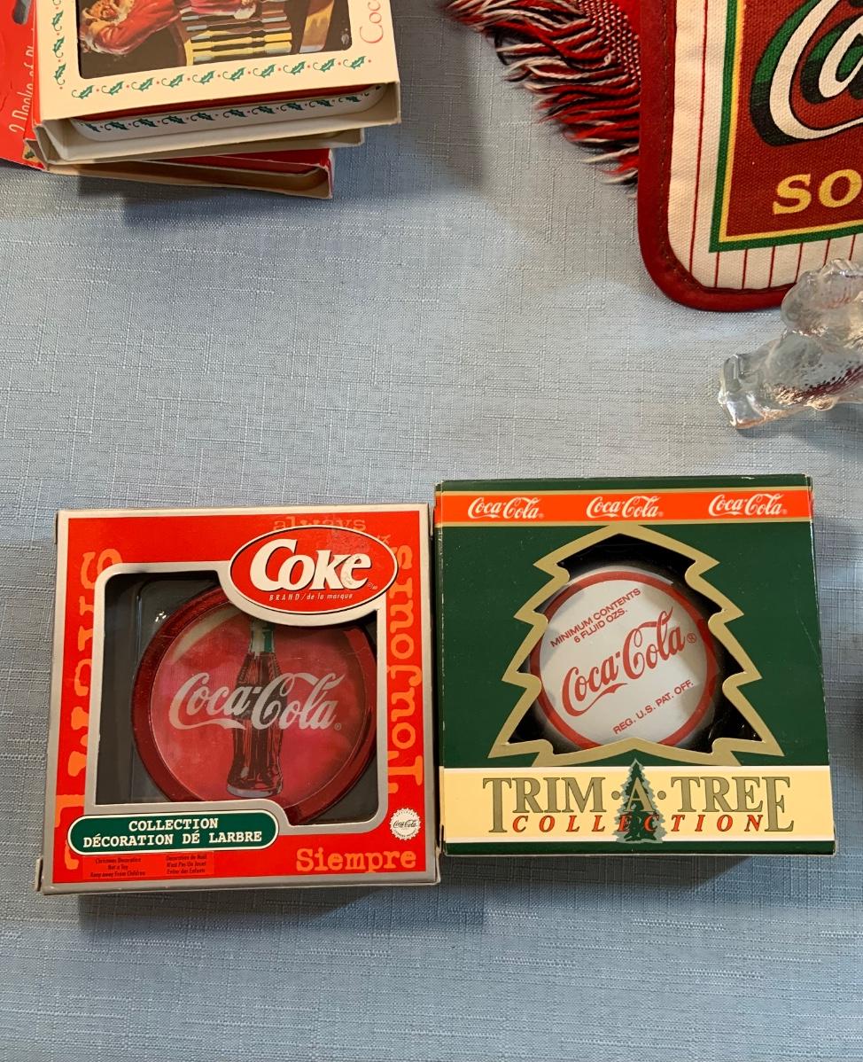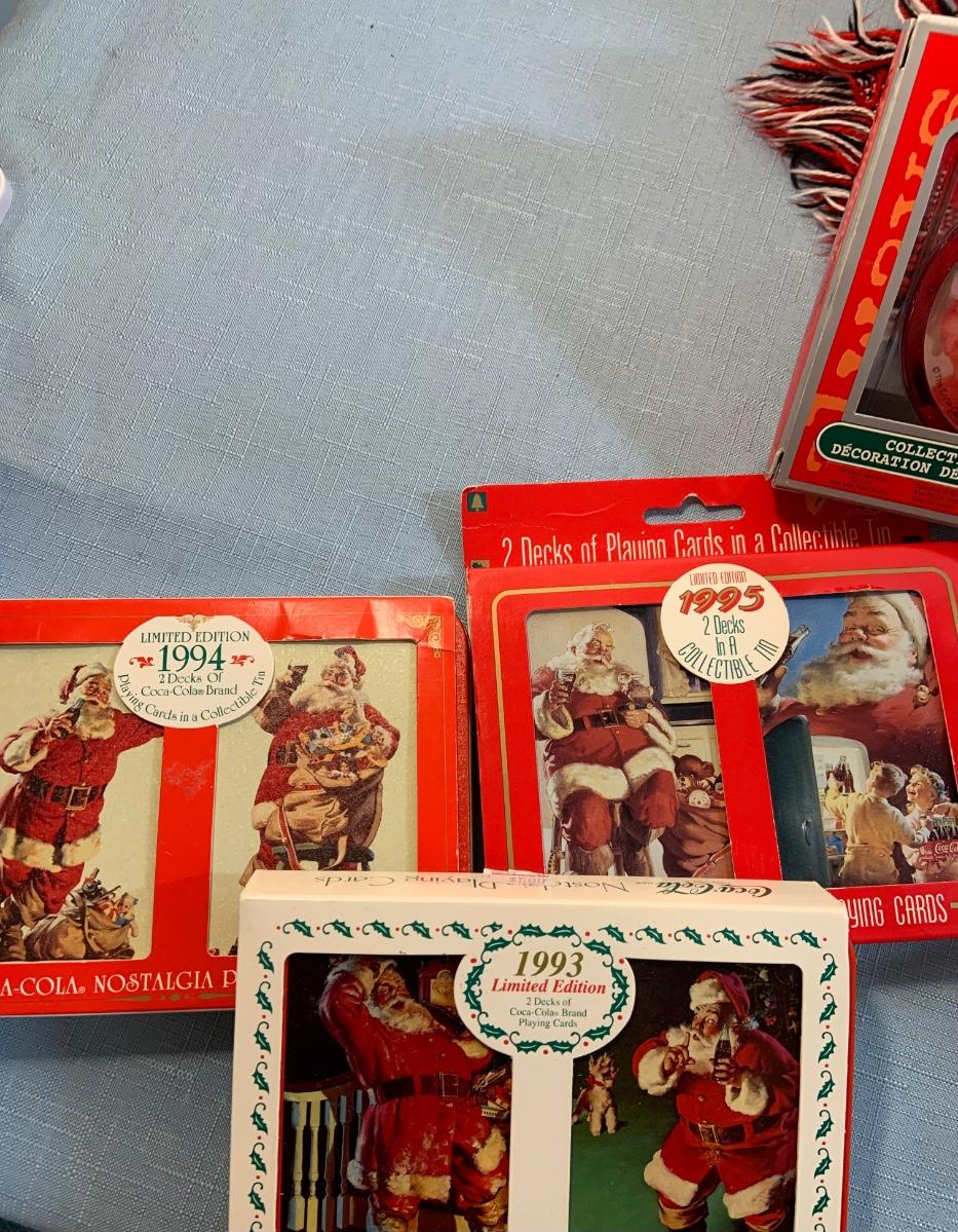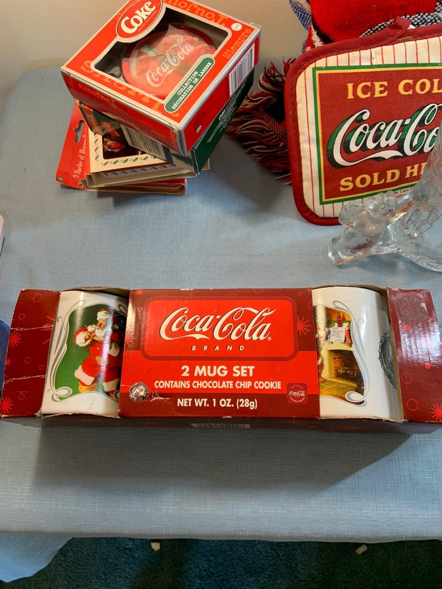 LOT145G: Coca Cola Collection Including a Coke Polar Bear Blanket and Mugs, Holiday Ornaments, and Playing Cards, and More.