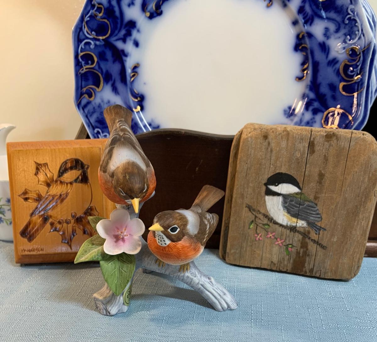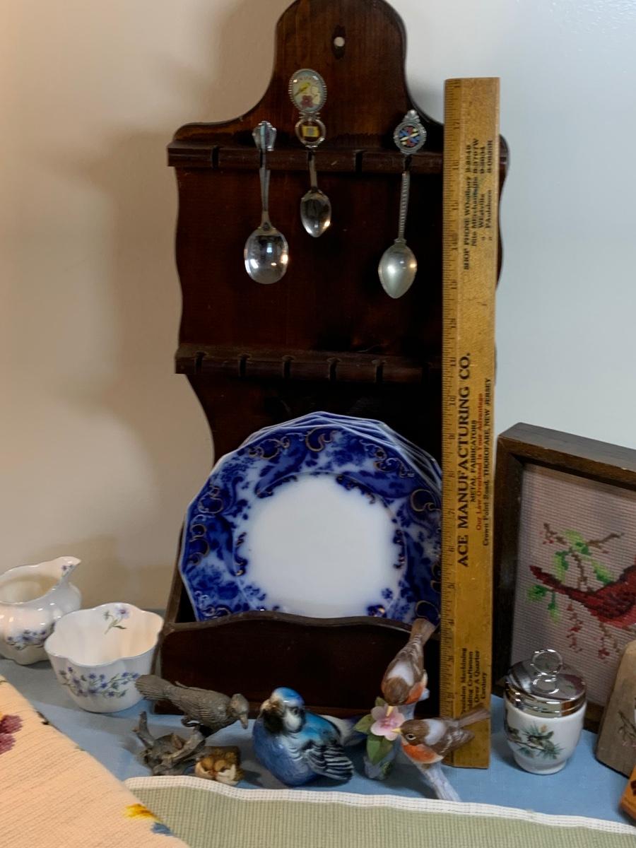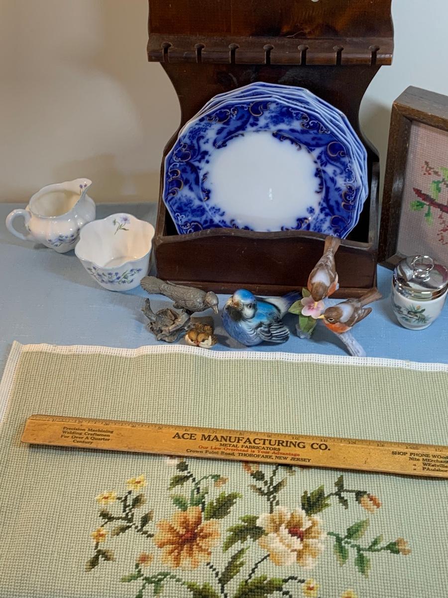 LOTJ146G: Handmade Needlework, Spoons & Spoon Rest, Bird Figurines Including Goebel and Hamilton Mint: Blue China Plates; a Shelly China Cup & Creamer and More