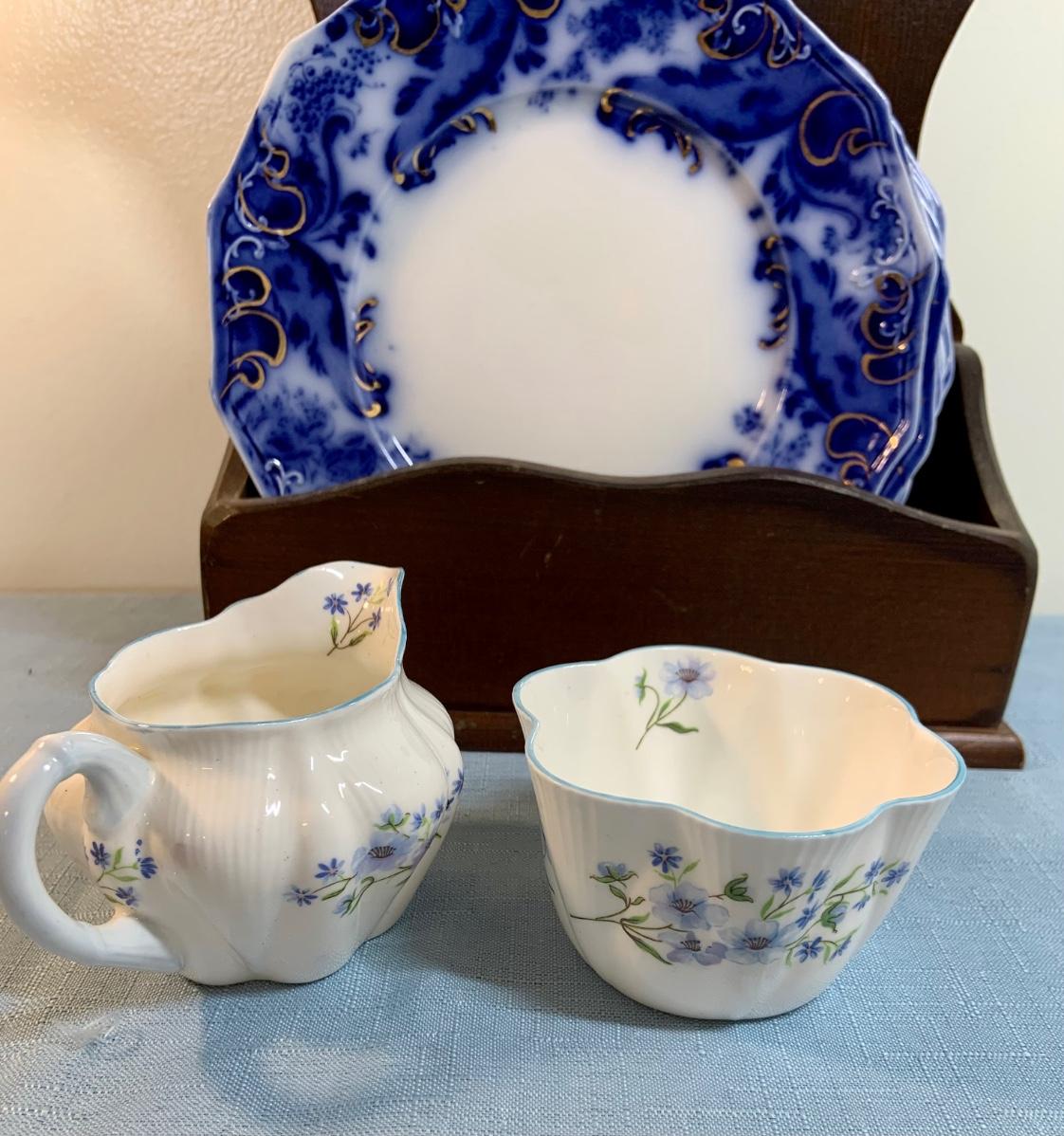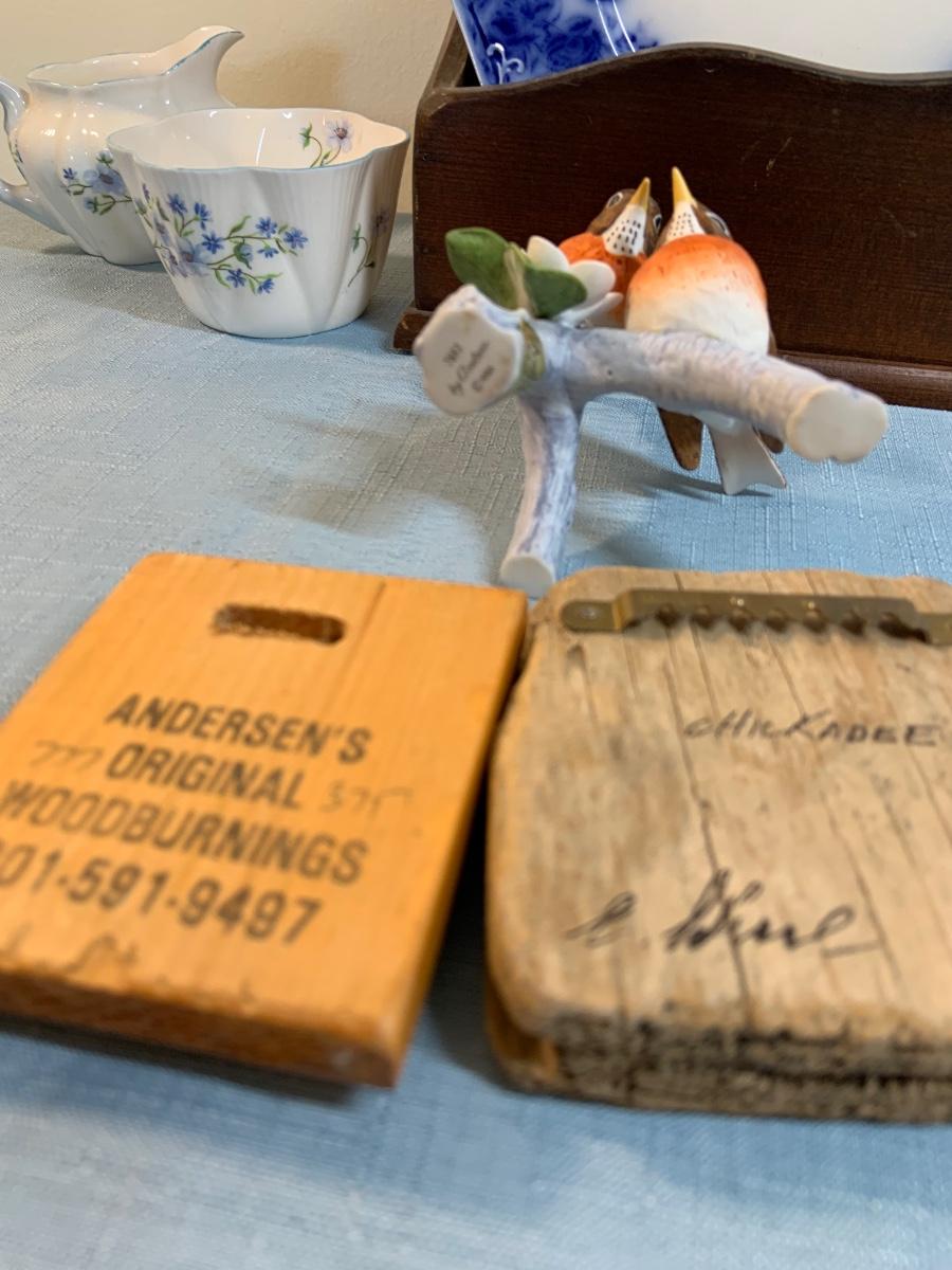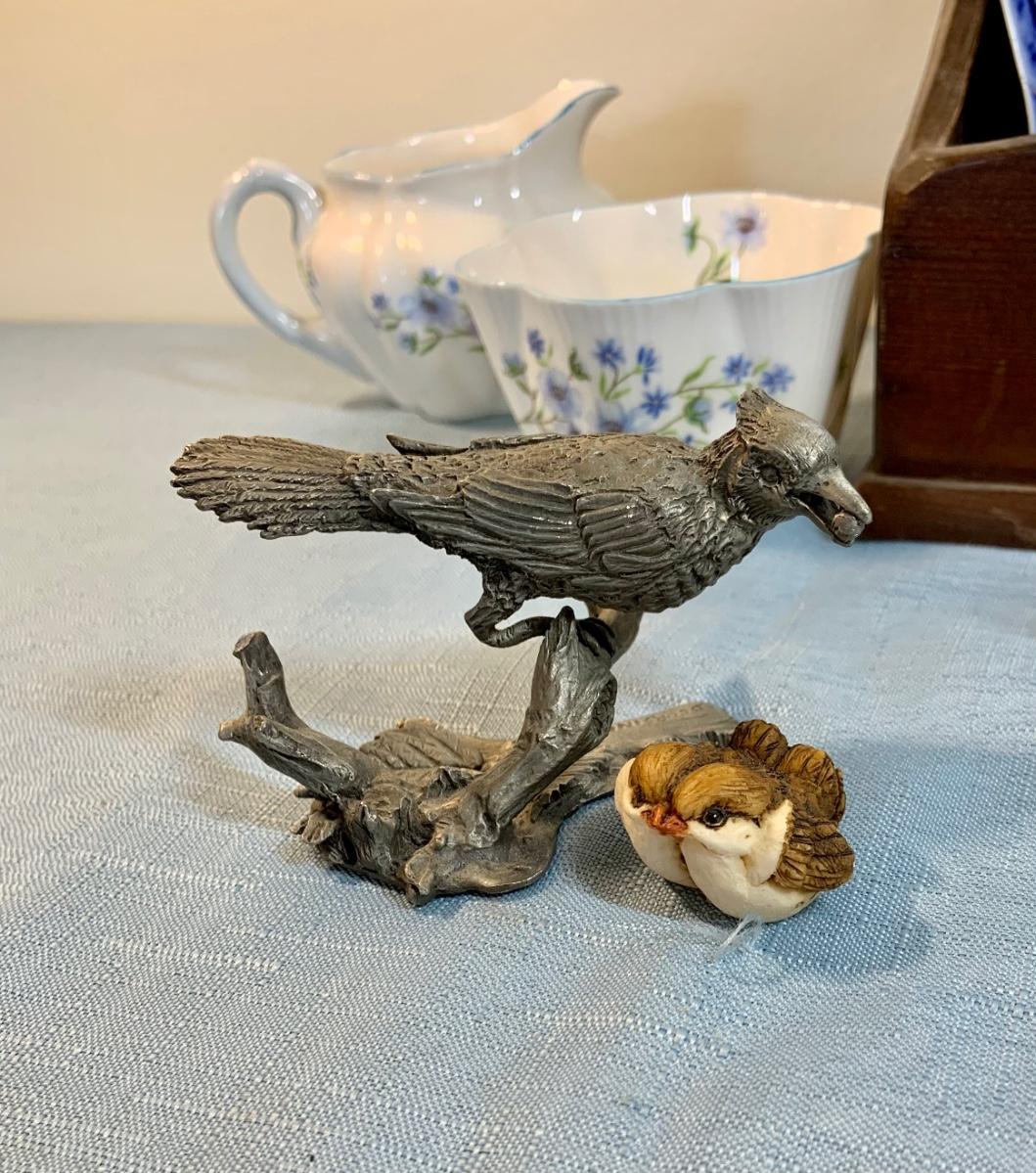 LOTJ146G: Handmade Needlework, Spoons & Spoon Rest, Bird Figurines Including Goebel and Hamilton Mint: Blue China Plates; a Shelly China Cup & Creamer and More
