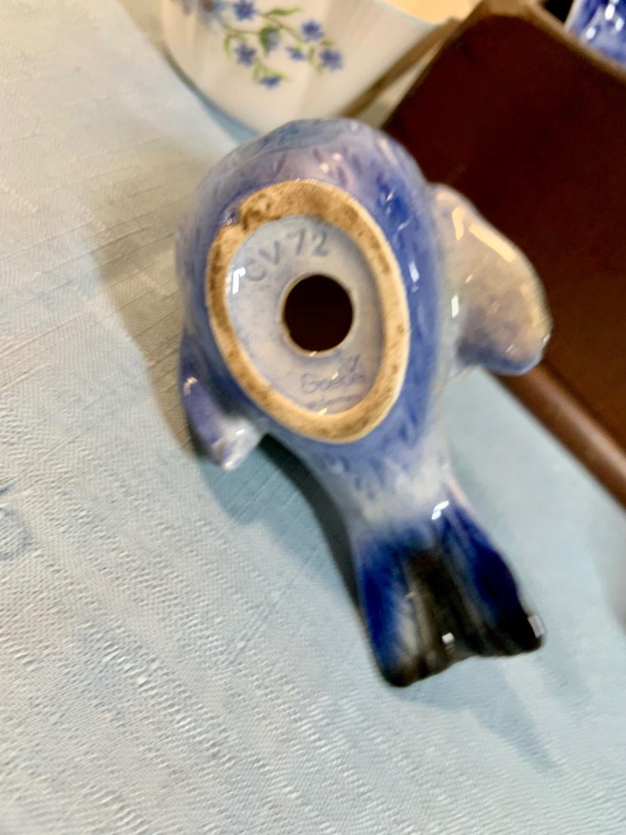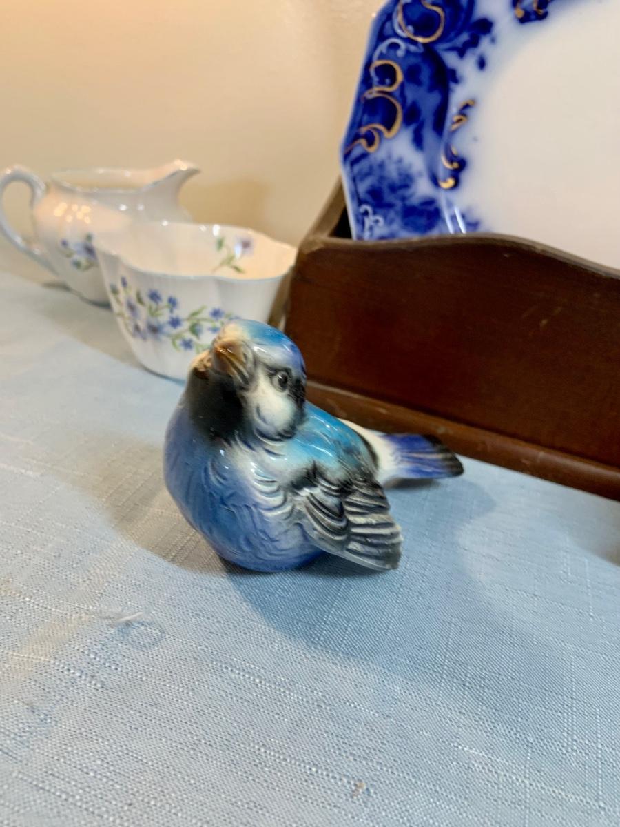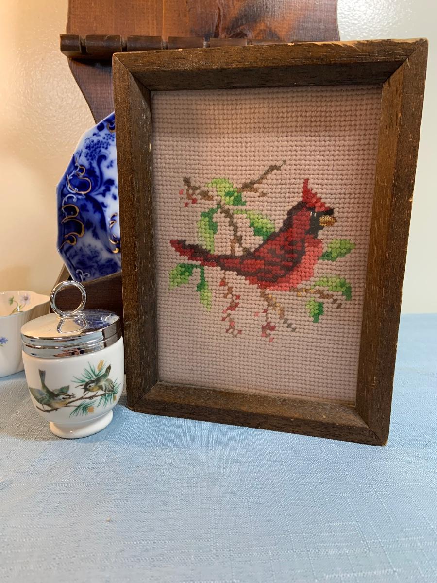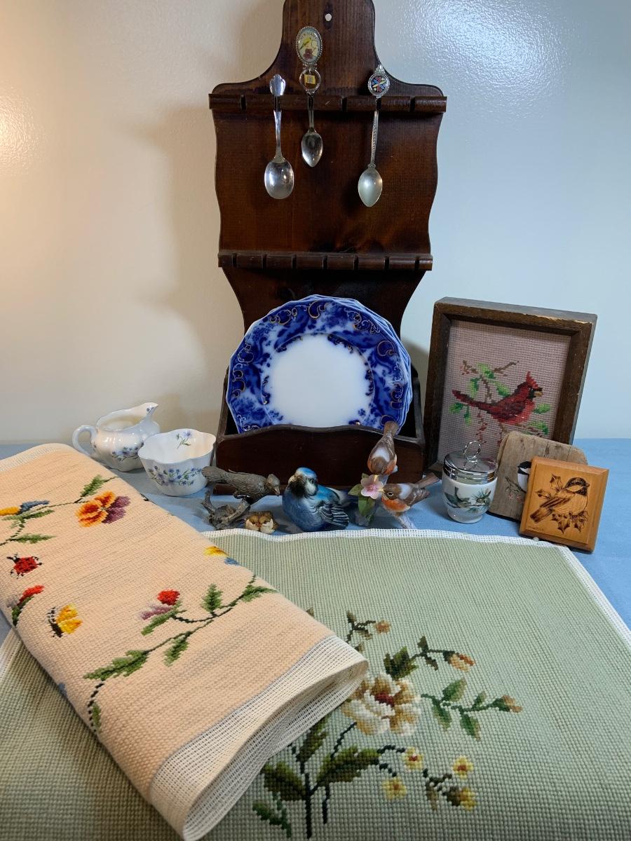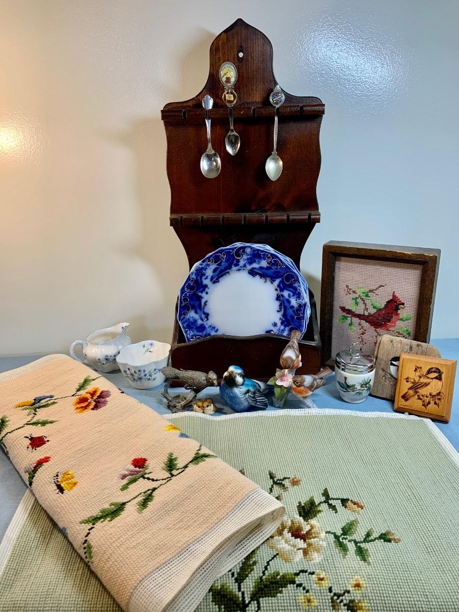 LOTJ146G: Handmade Needlework, Spoons & Spoon Rest, Bird Figurines Including Goebel and Hamilton Mint:  Blue China  Plates; a Shelly China Cup & Creamer and More
