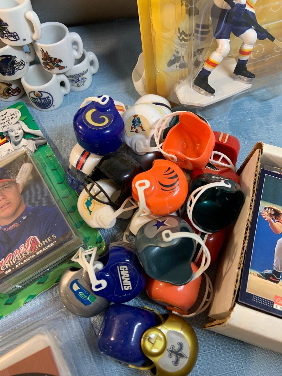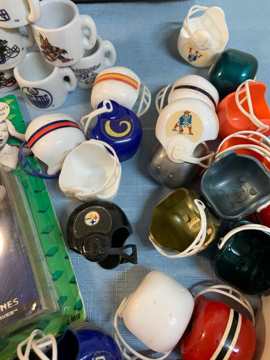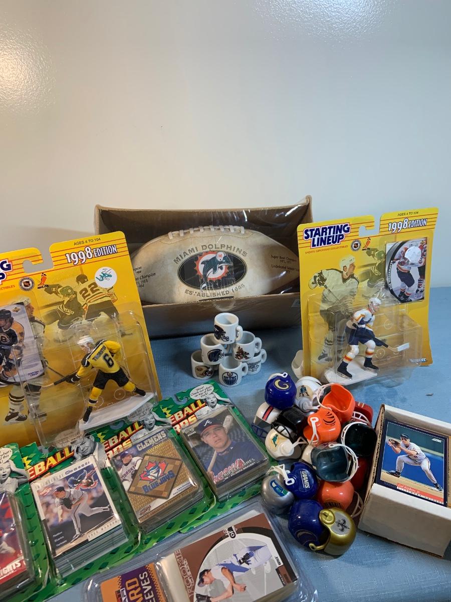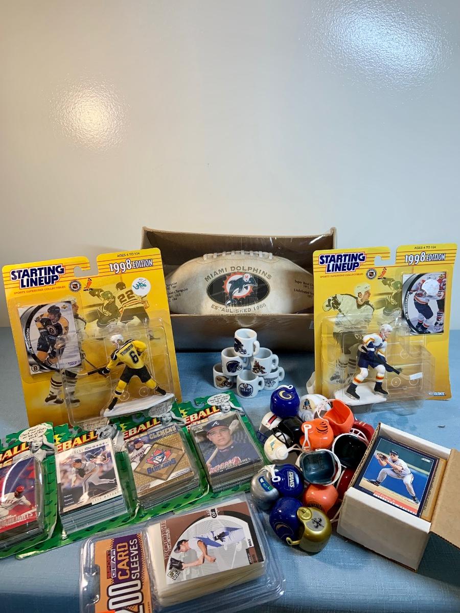 LOT 150G: Sports Memorabillia Including a Vintage Miamia Dophines Football, Hockey Figures, Mini Helmets and Mugs  Unopened Packs of Cards and More