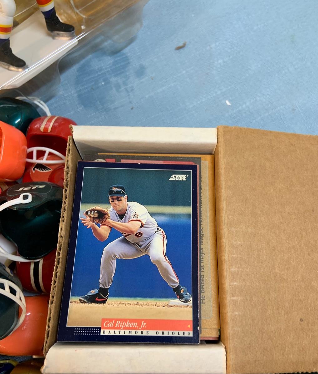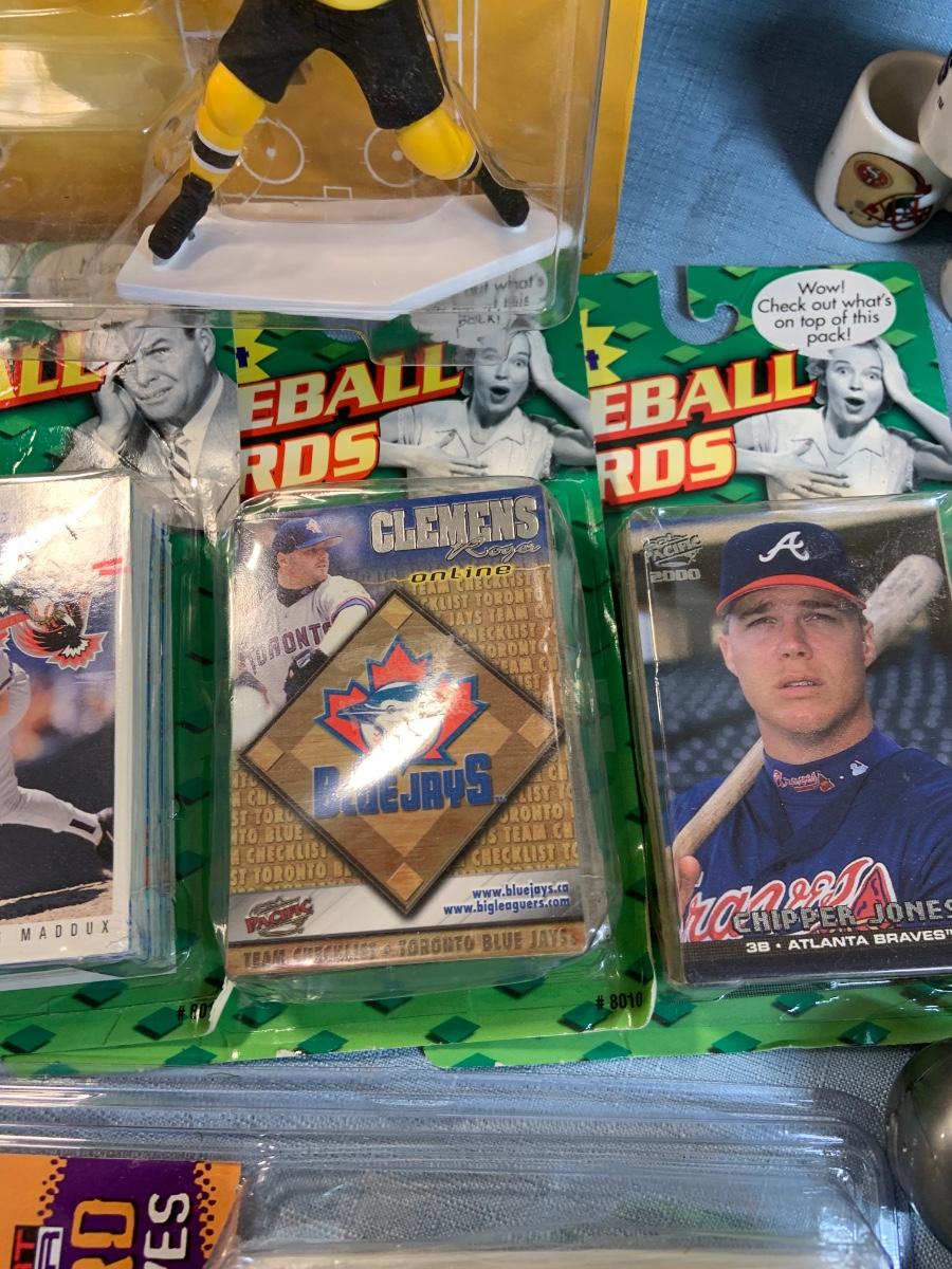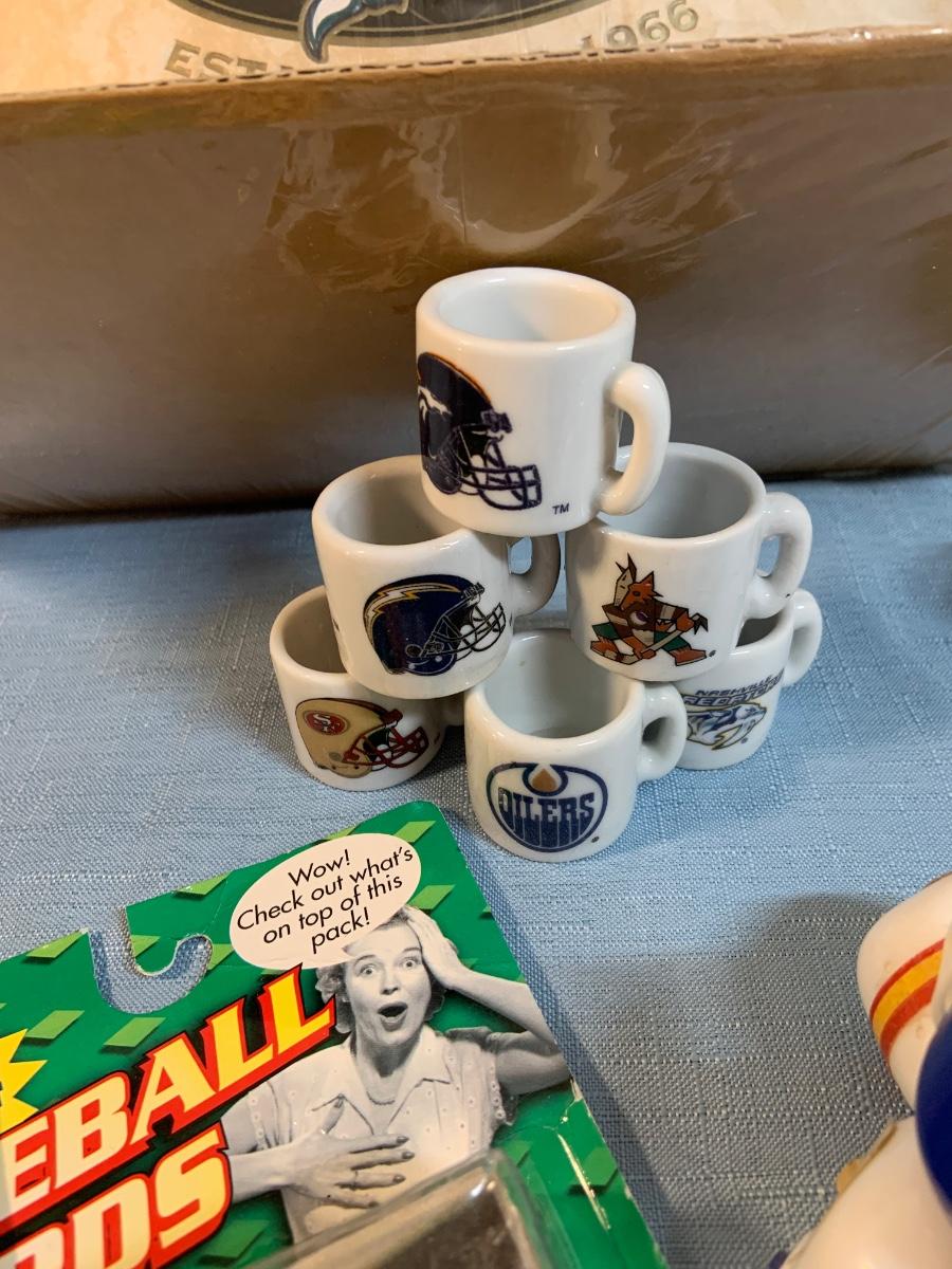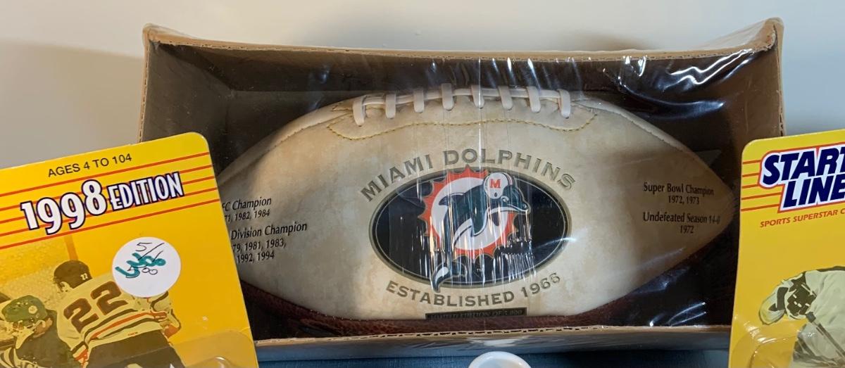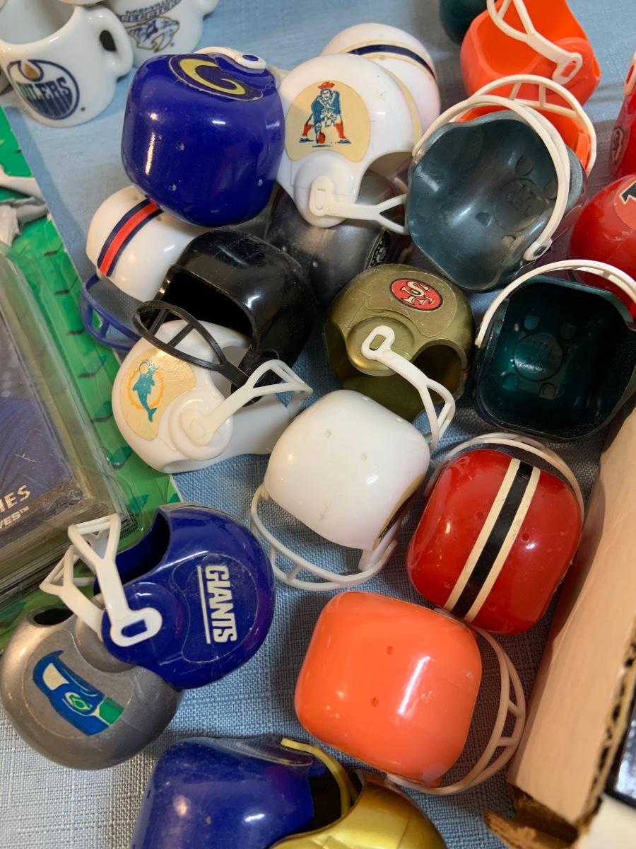 LOT 150G: Sports Memorabillia Including a Vintage Miamia Dophines Football, Hockey Figures, Mini Helmets and Mugs  Unopened Packs of Cards and More
