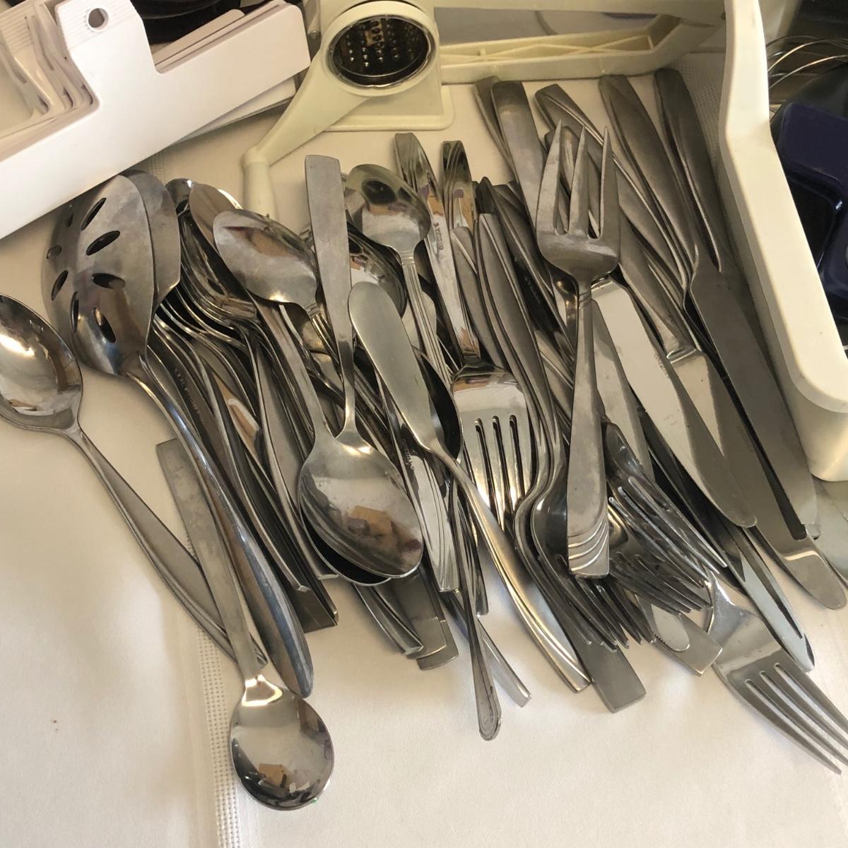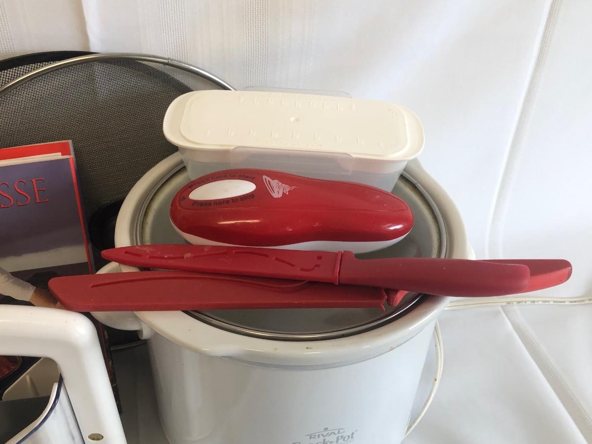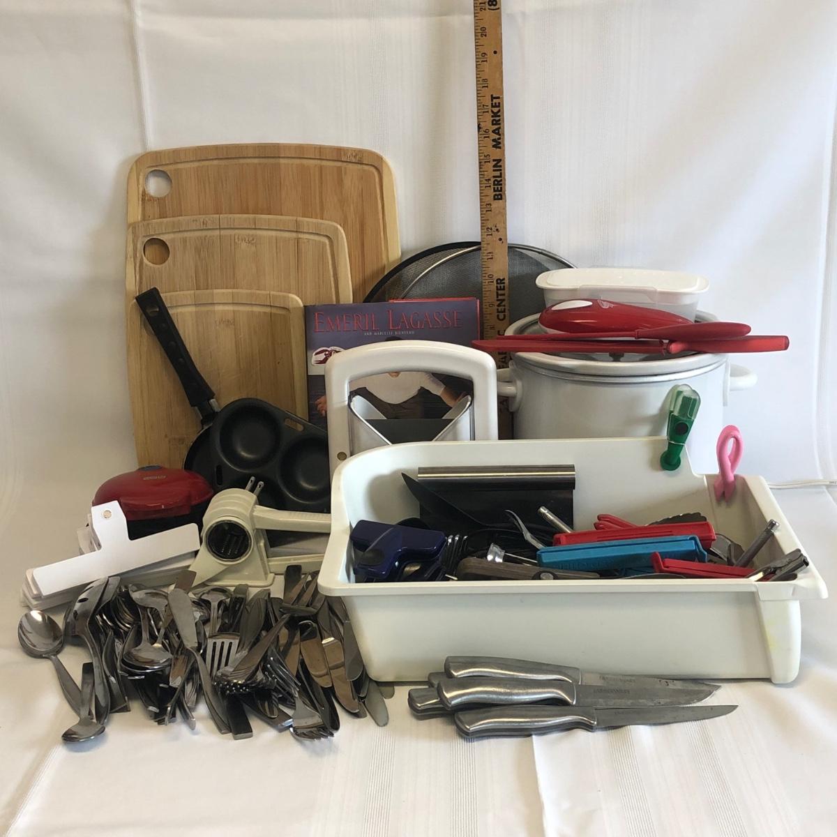 LOT 6: Kitchen Essentials - Rival Crockpot, Dash Mini Maker Griddle Model DMS001RD, Cutting Boards, Farberware Knives, Oneida Cutlery, & More!