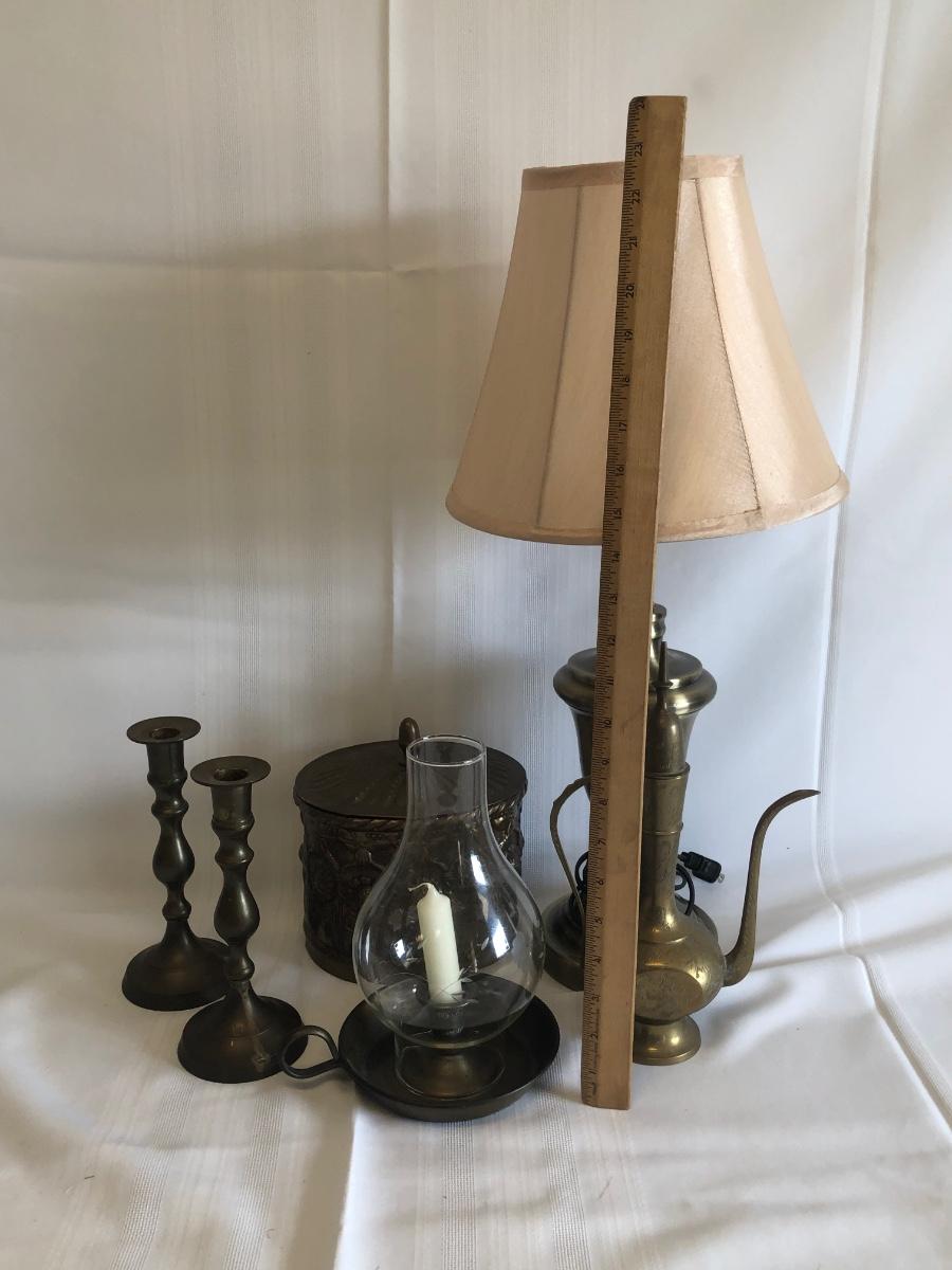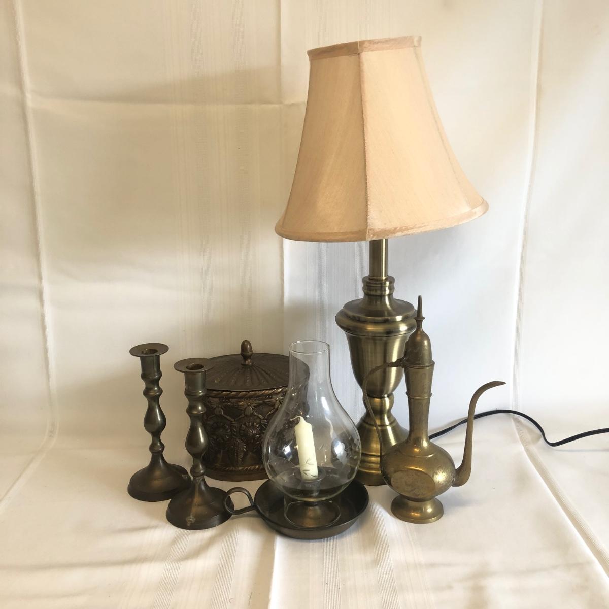 LOT 15: Brass Candlesticks, Decorative Jar, Glass Lamp & More