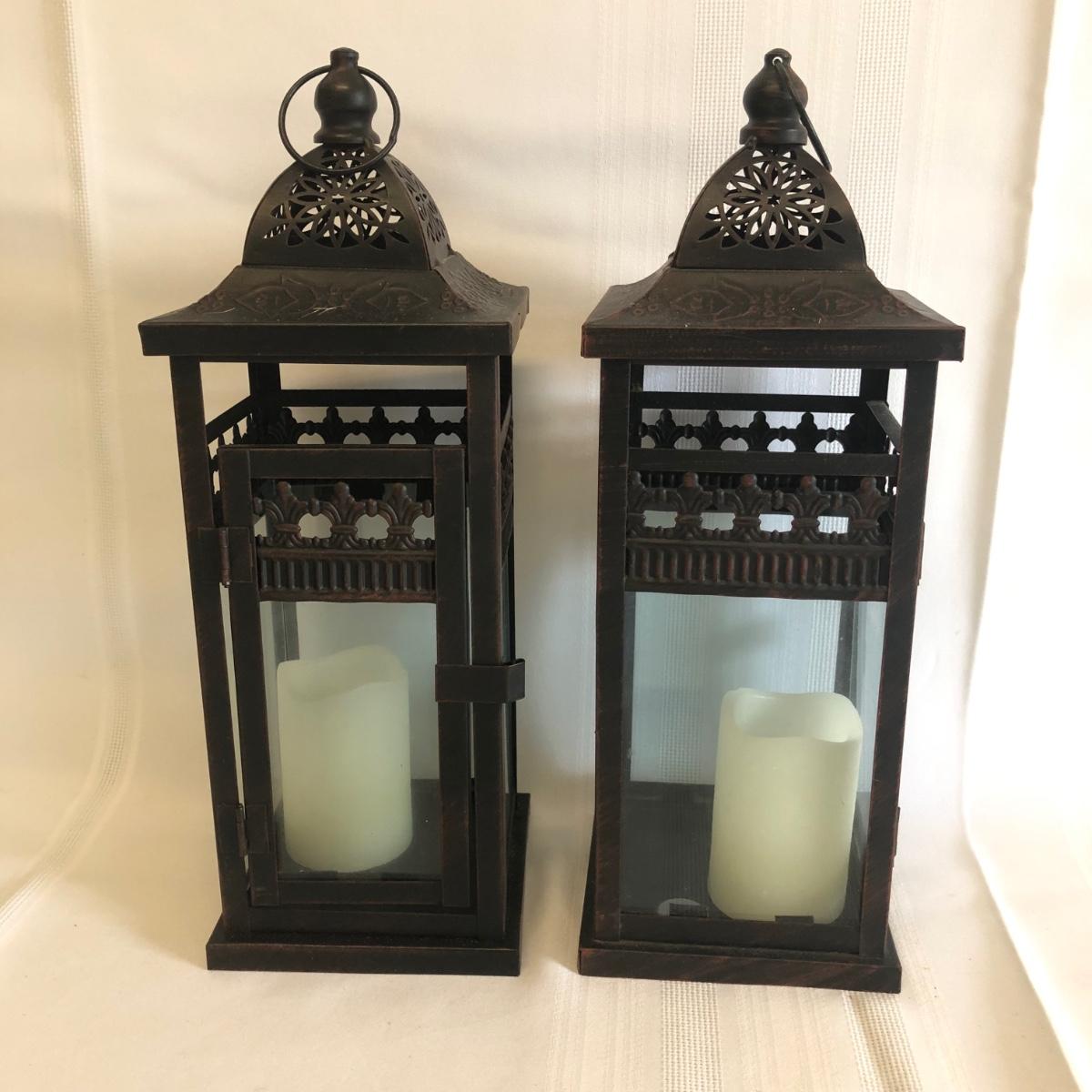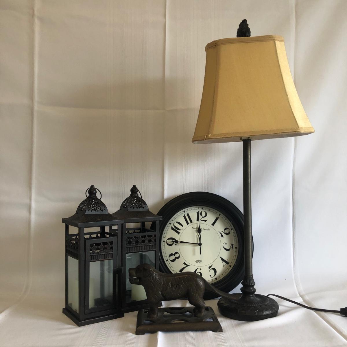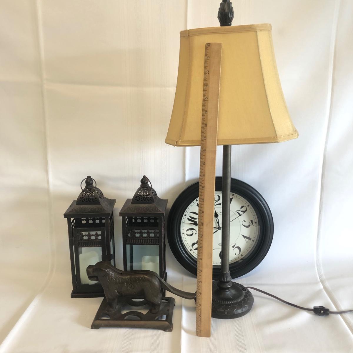 LOT 16: Home Decor Collection - Lamp, Lanterns, Sterling & Noble Wall Clock & Newfoundland Dog Nutcracker