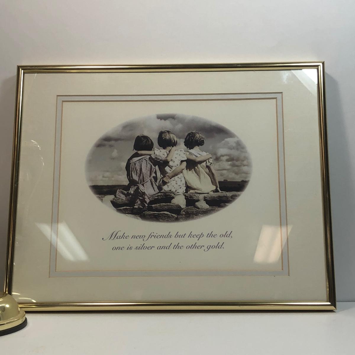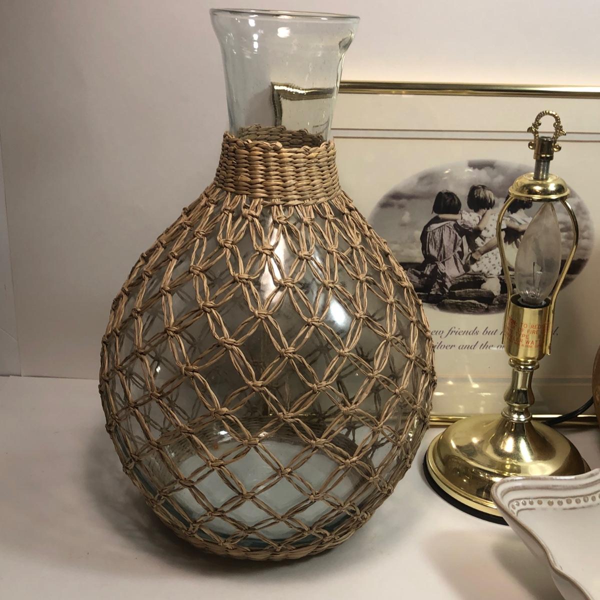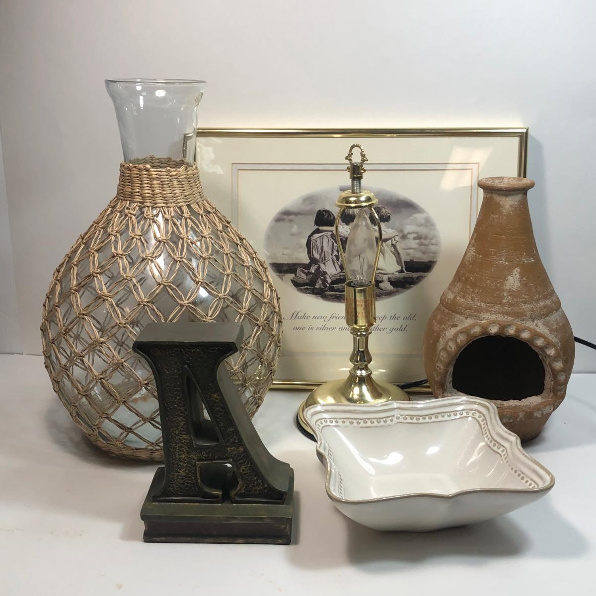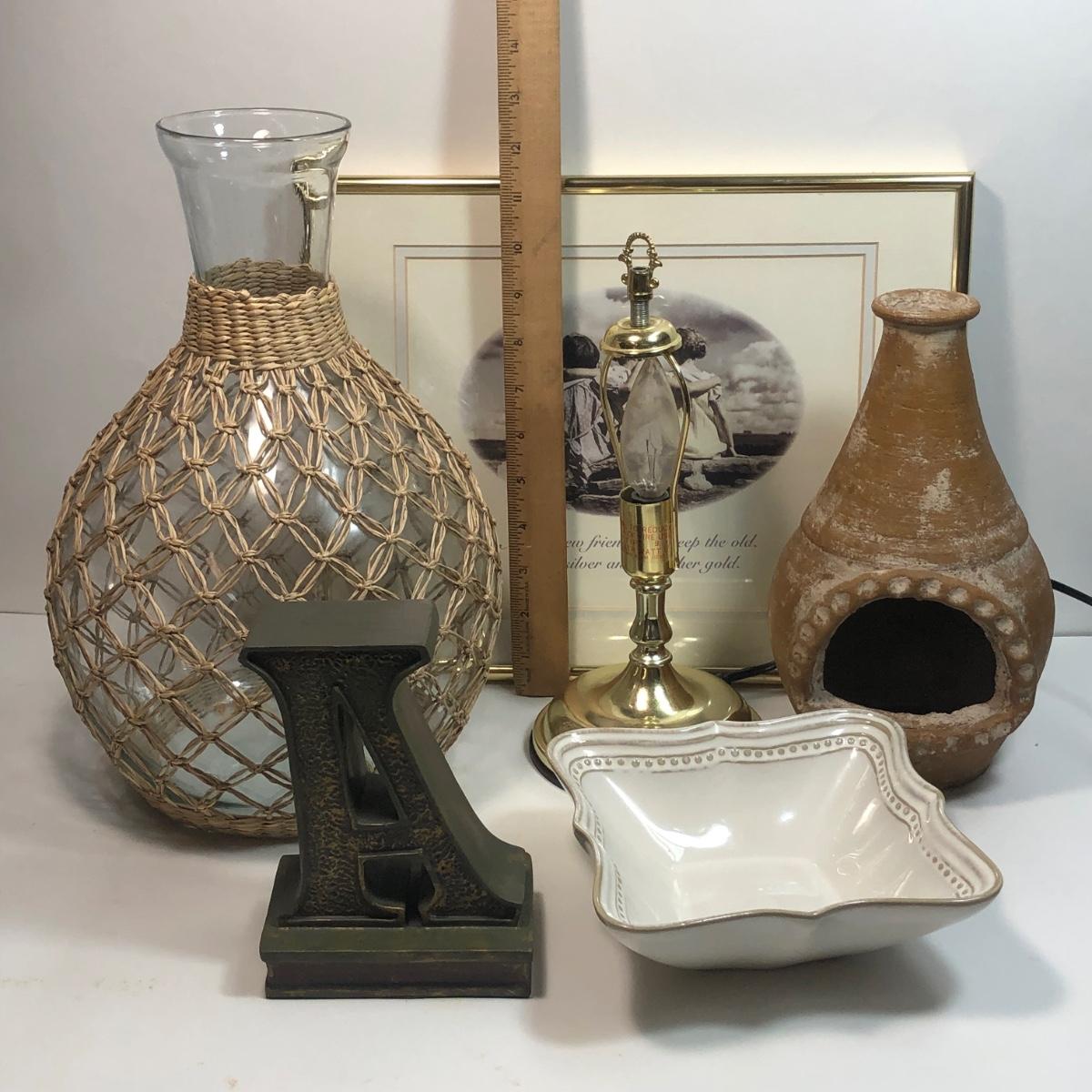 LOT 18: Miniature Chimenea, Roscher Stoneware Bowl, Glass Vase w/ Rope Design, Small Lamp & Framed "Friendship" Print