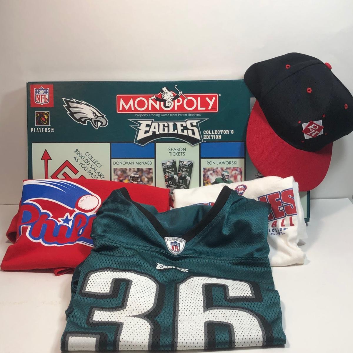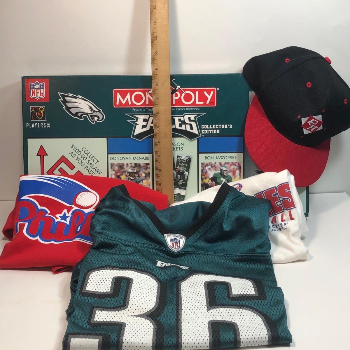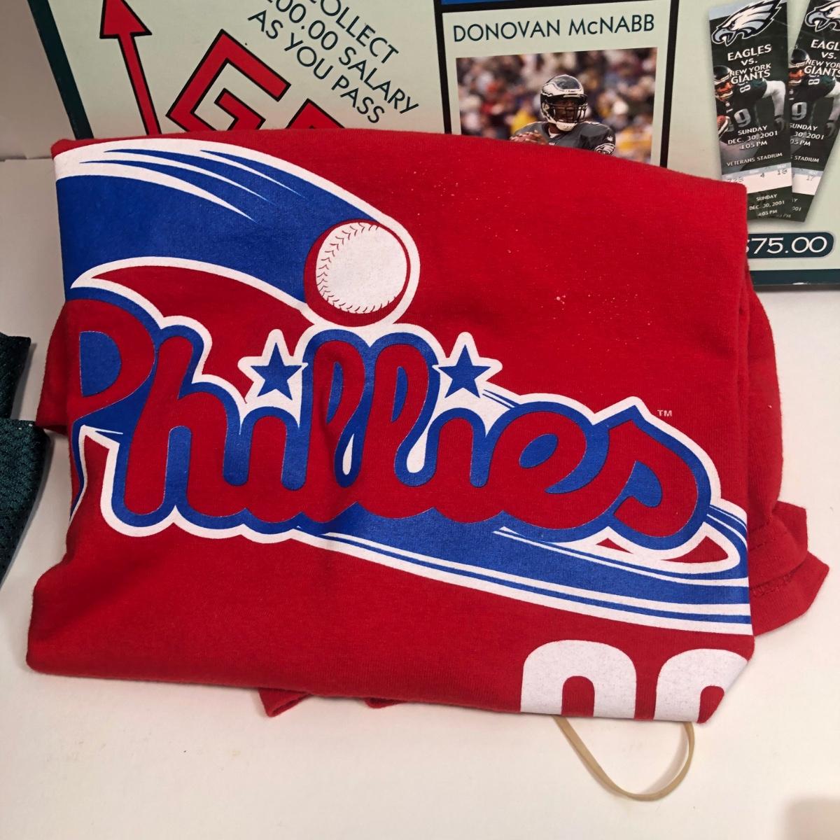 LOT 19: Eagles Monopoly, Westbrook Jersey (XL), 2 Phillies T-shirts (M &L), 1997 Masters Golf Chair