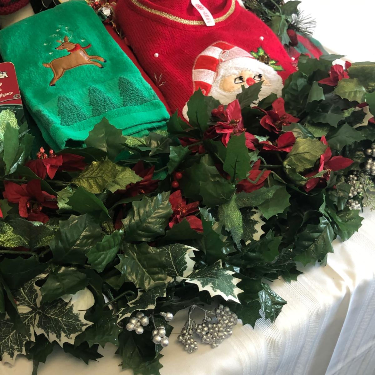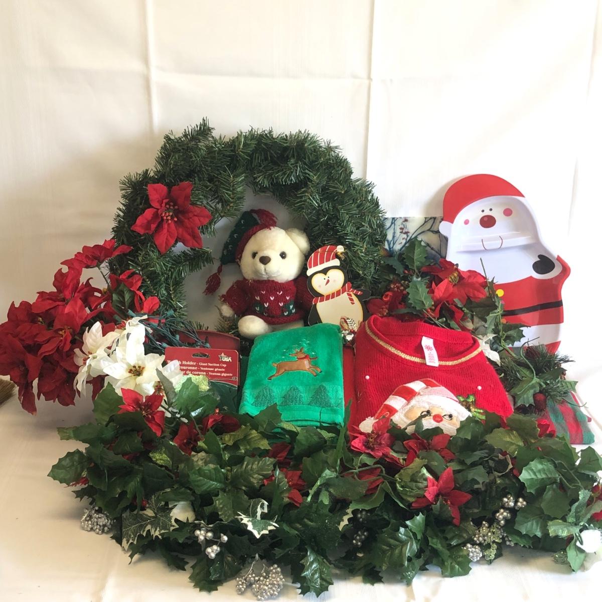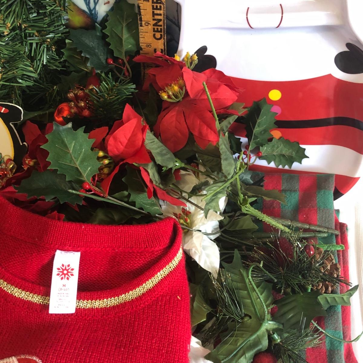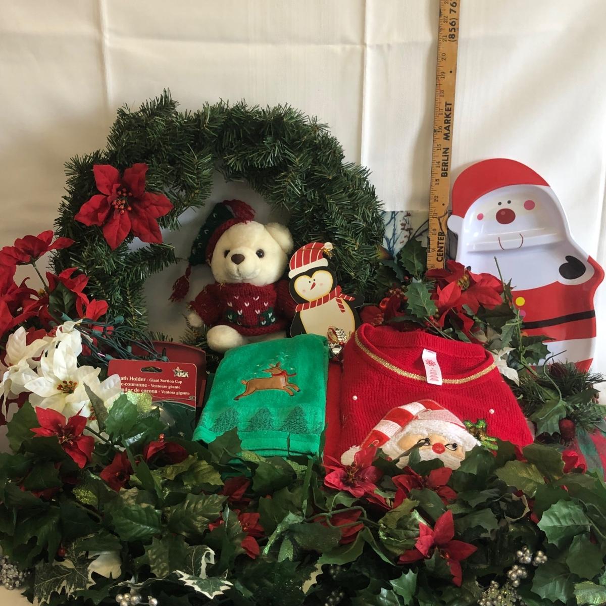 LOT 24: Christmas Collection - Sweater, Wreath, Santa Plate, Kitchen Towels & More