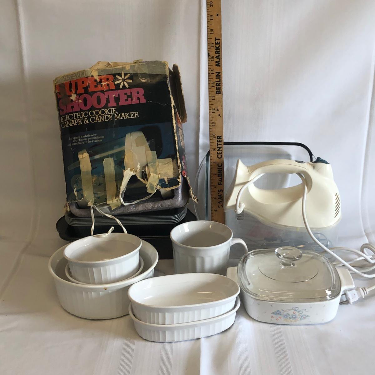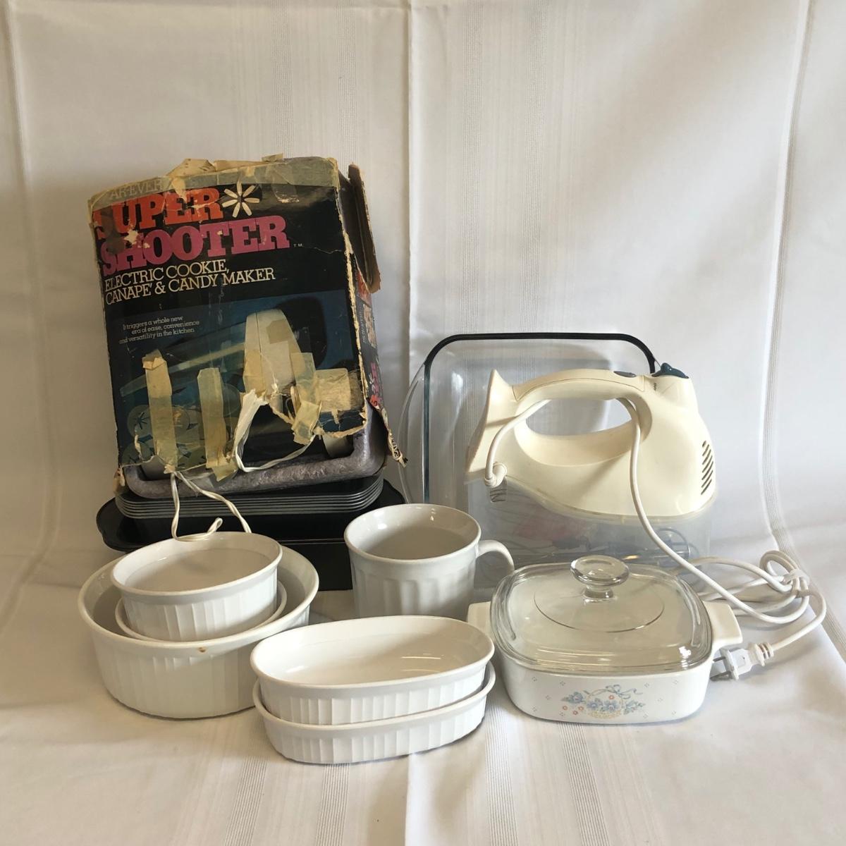 LOT 25: Vintage Super Shooter Electric Cookie Canape & Candy Maker, Hamilton Beach Bowl Rest Hand Mixer, Corning Ware Baking Dishes & More