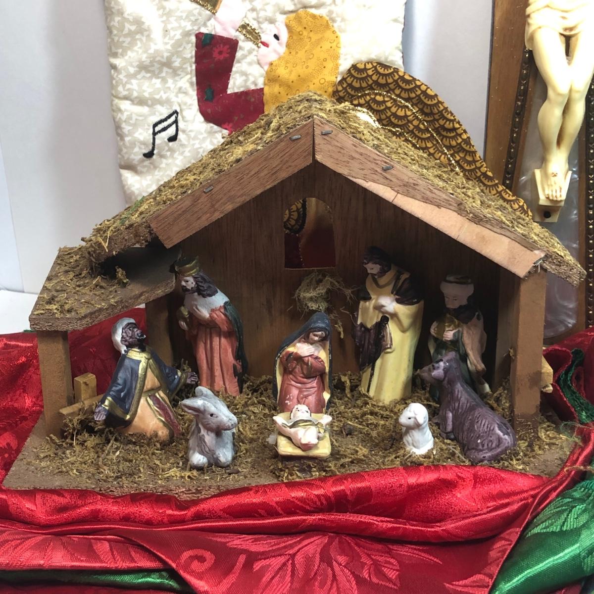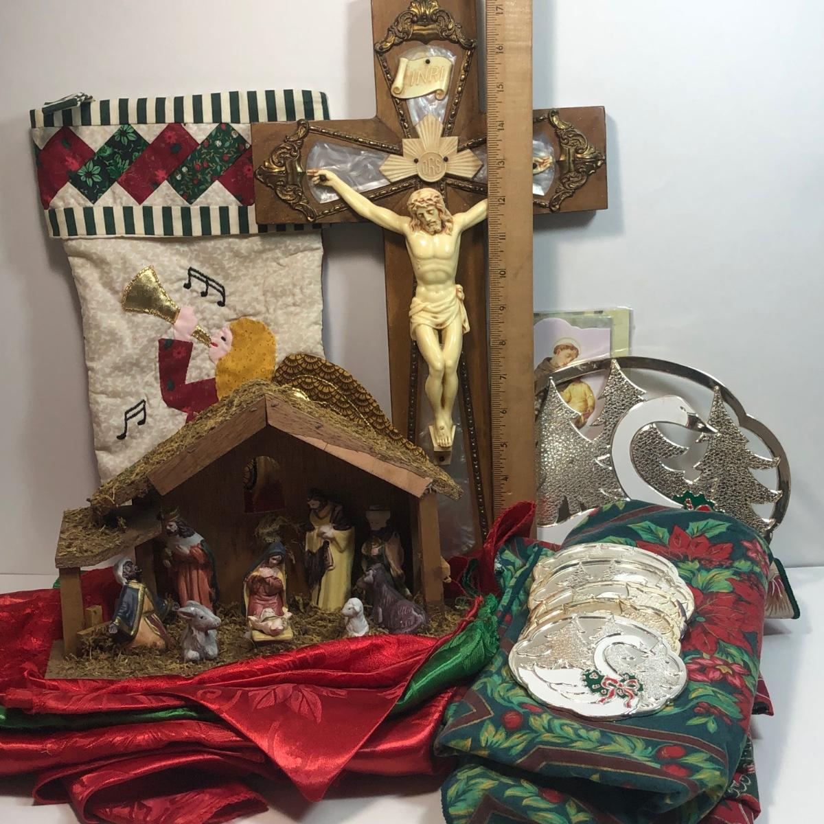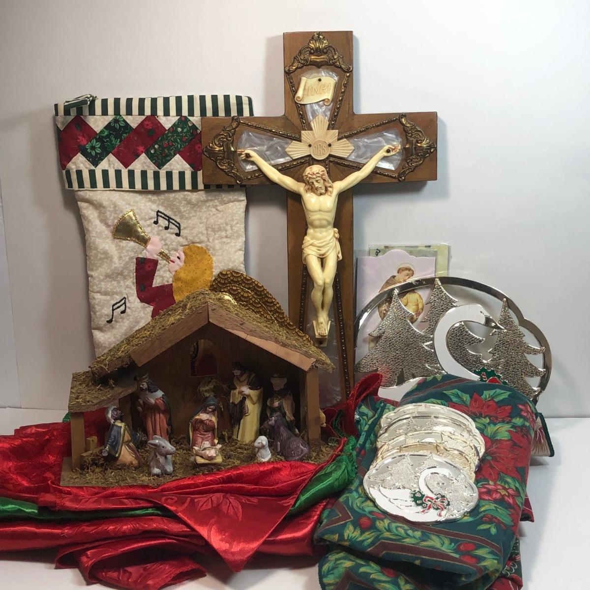 LOT 26: Inlayed Crucifix, Nativity Scene, Angel Stocking, St. Anthony Charm Necklaces, Linens & More