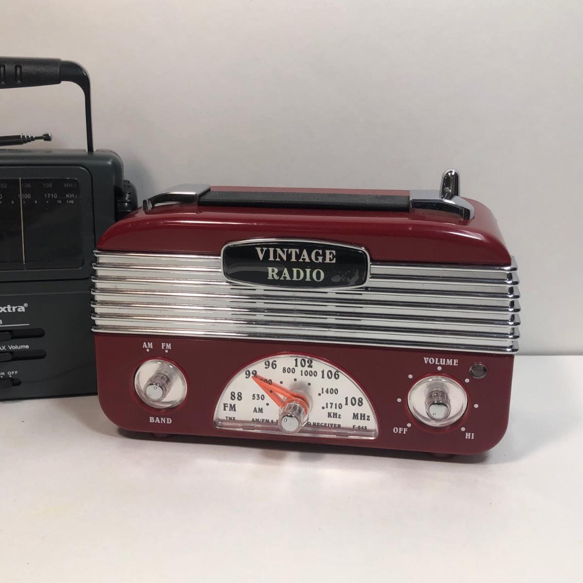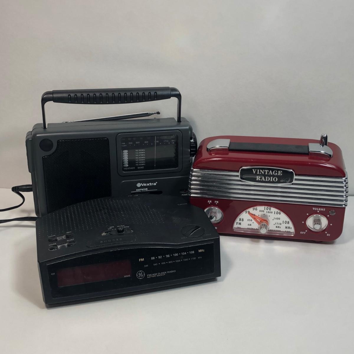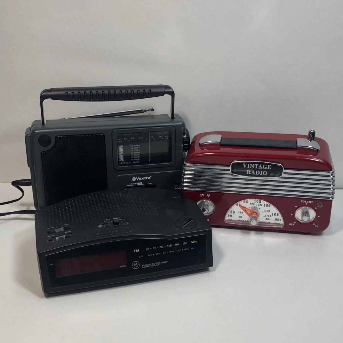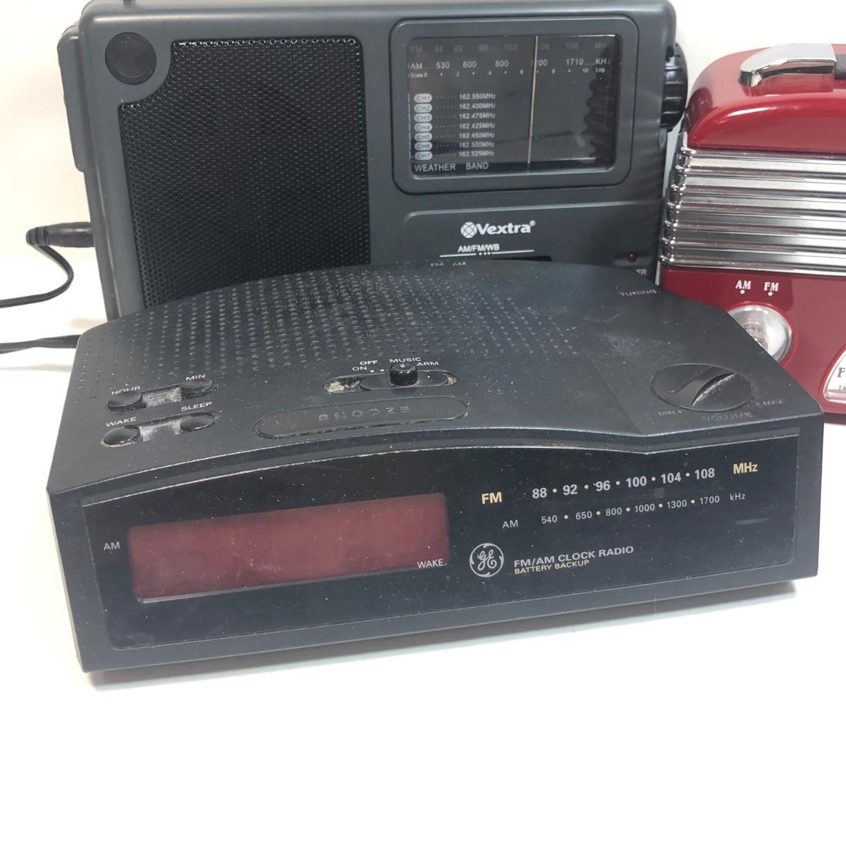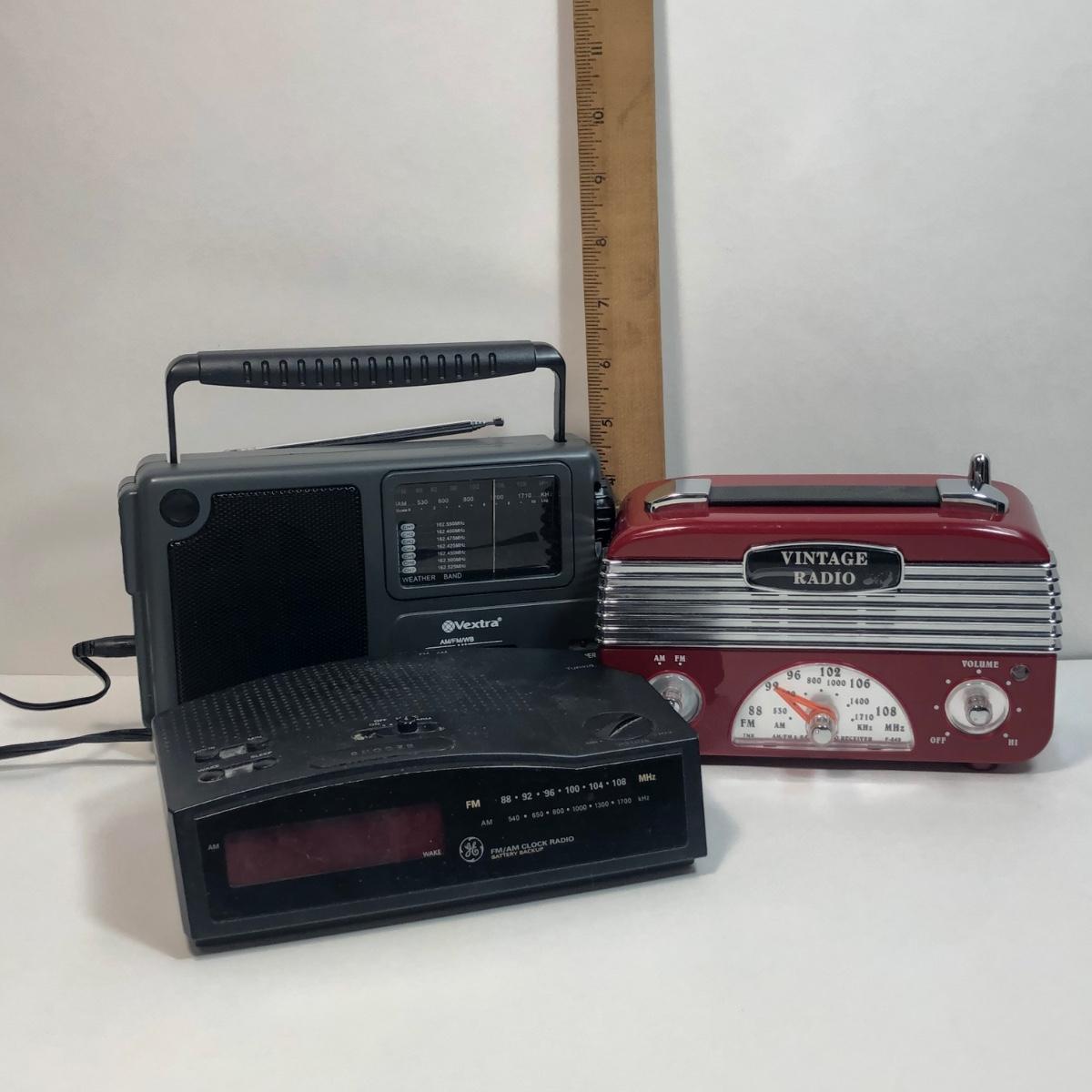 LOT 30: GE FM/AM Clock Radio Model 7-4813B, Vextra Portable AM/FM Radio w/ Weather Band Model VR4181 & Vintage-Style Radio