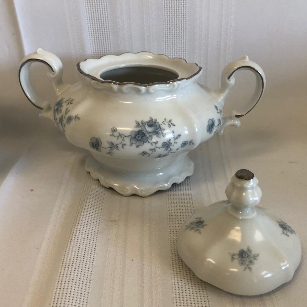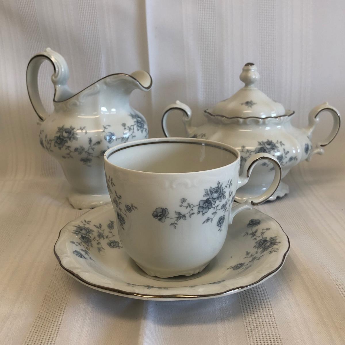 Set serves 6 and includes a sugar bowl and creamer.
