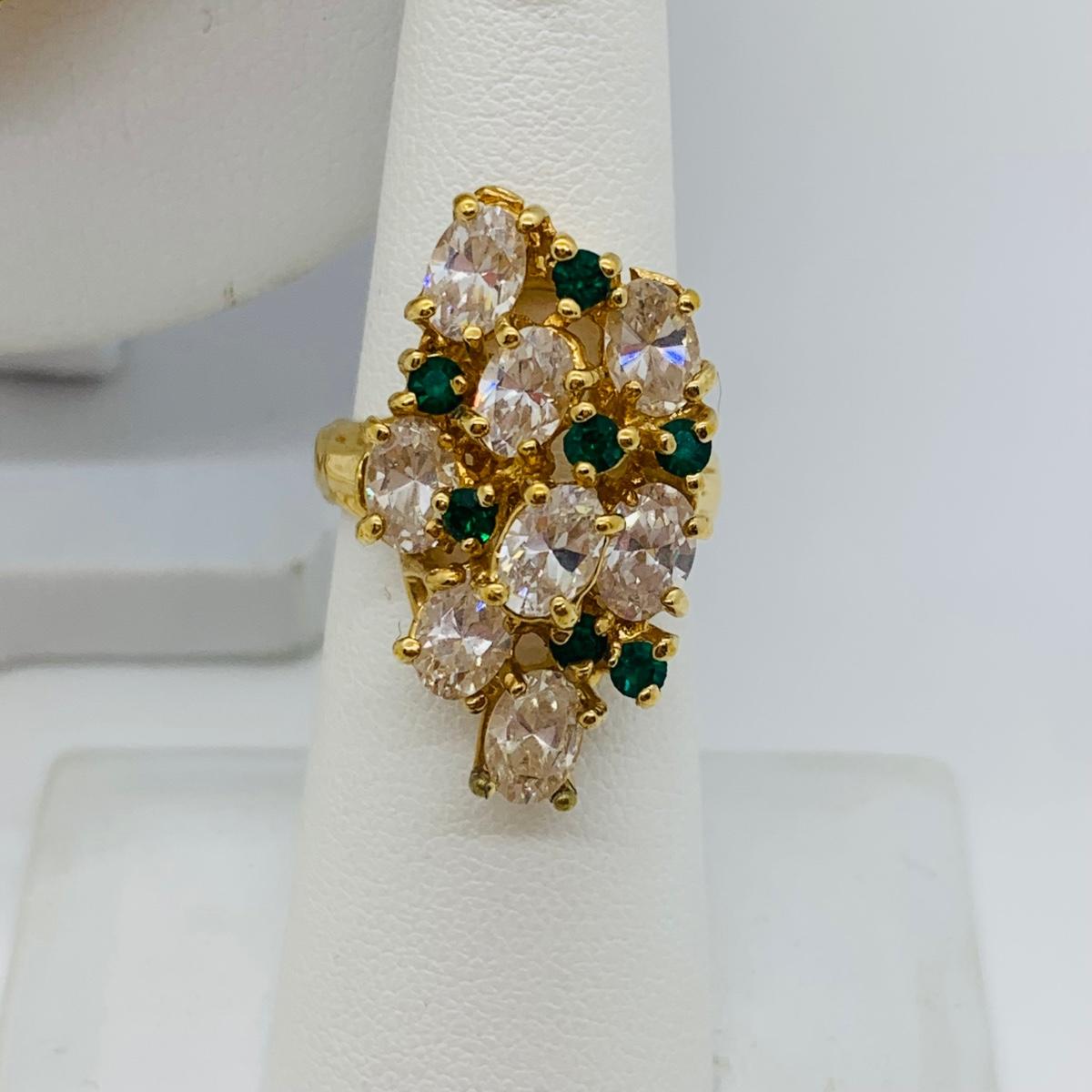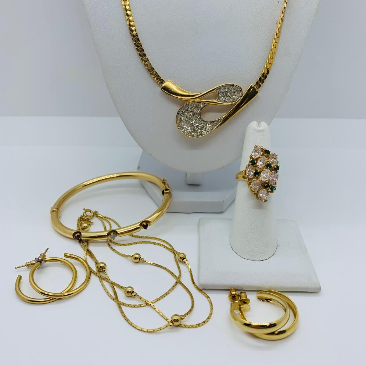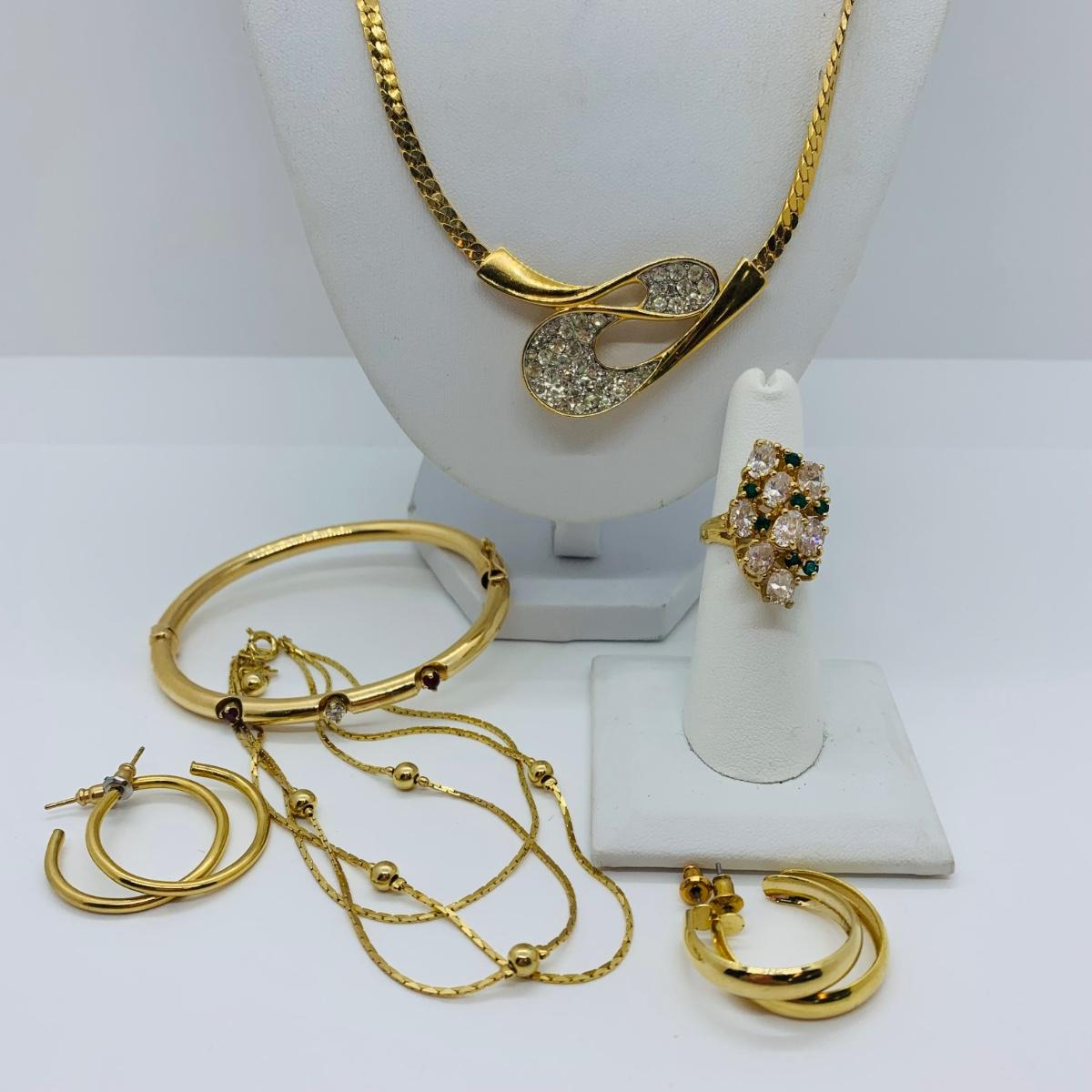 LOTJ 60R: 18k Gold Filled Cocktail Ring sz6, Trifari Necklace & Gold Tone Bracelets & Hoop Earrings