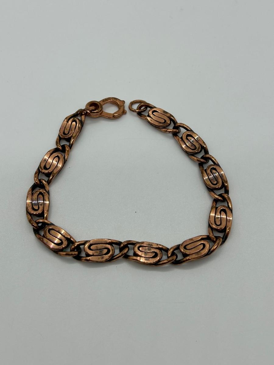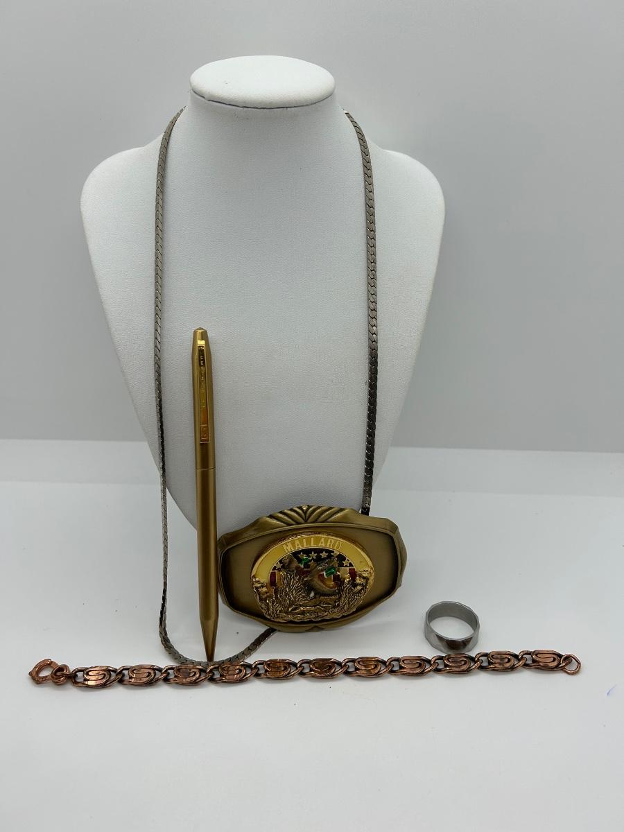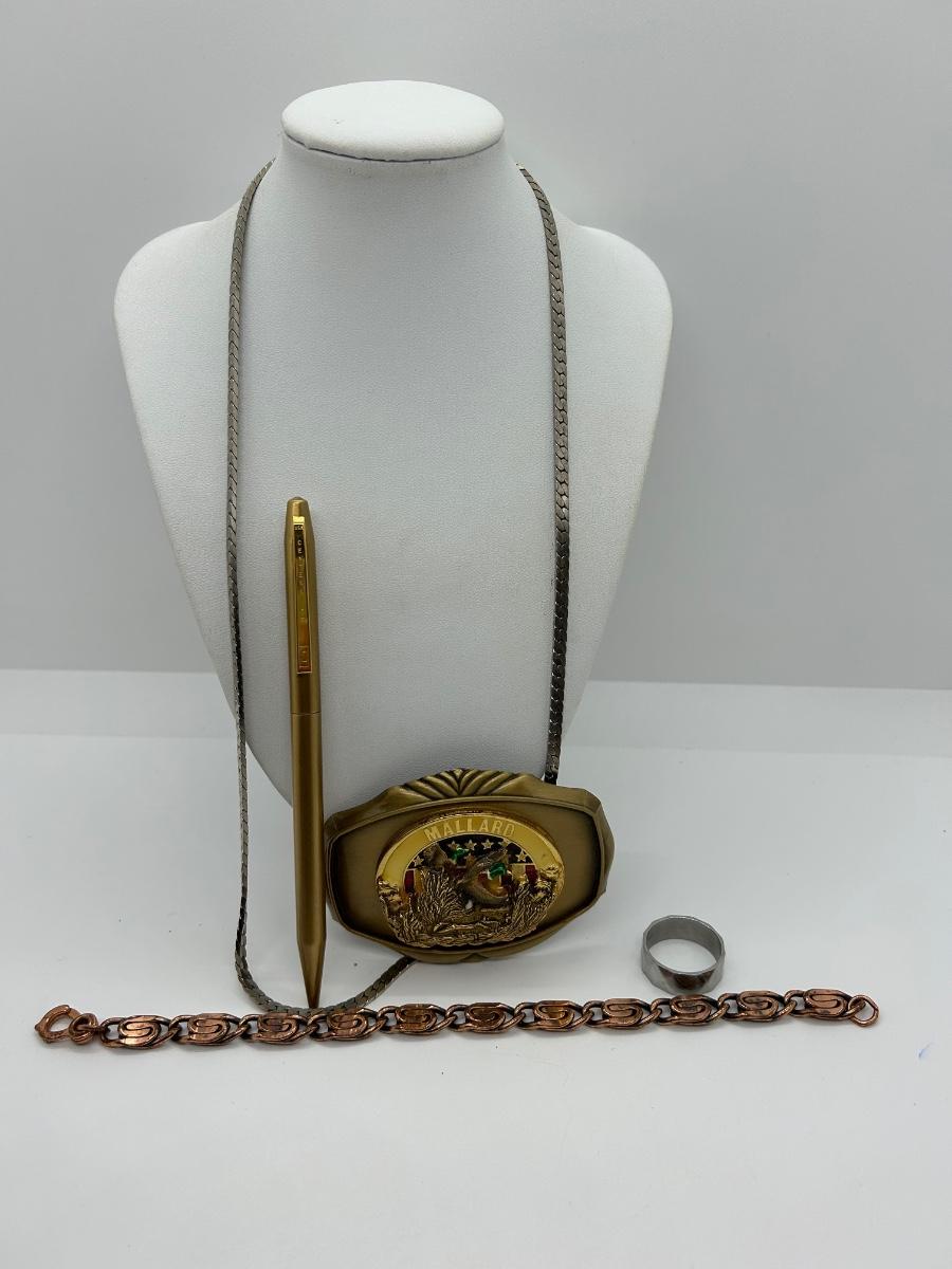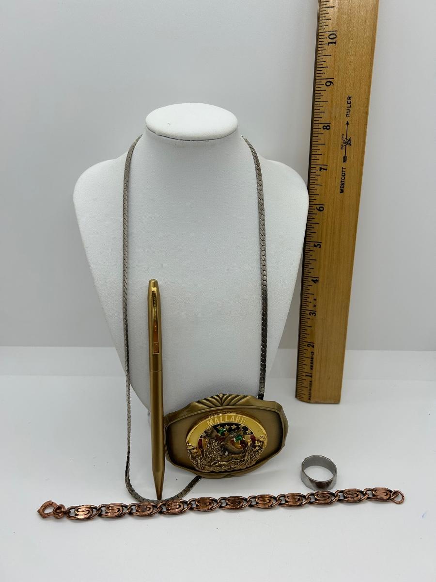 Stainless steel Necklace and ring, copper 8” bracelet, Mallard belt buckle and gold pen.