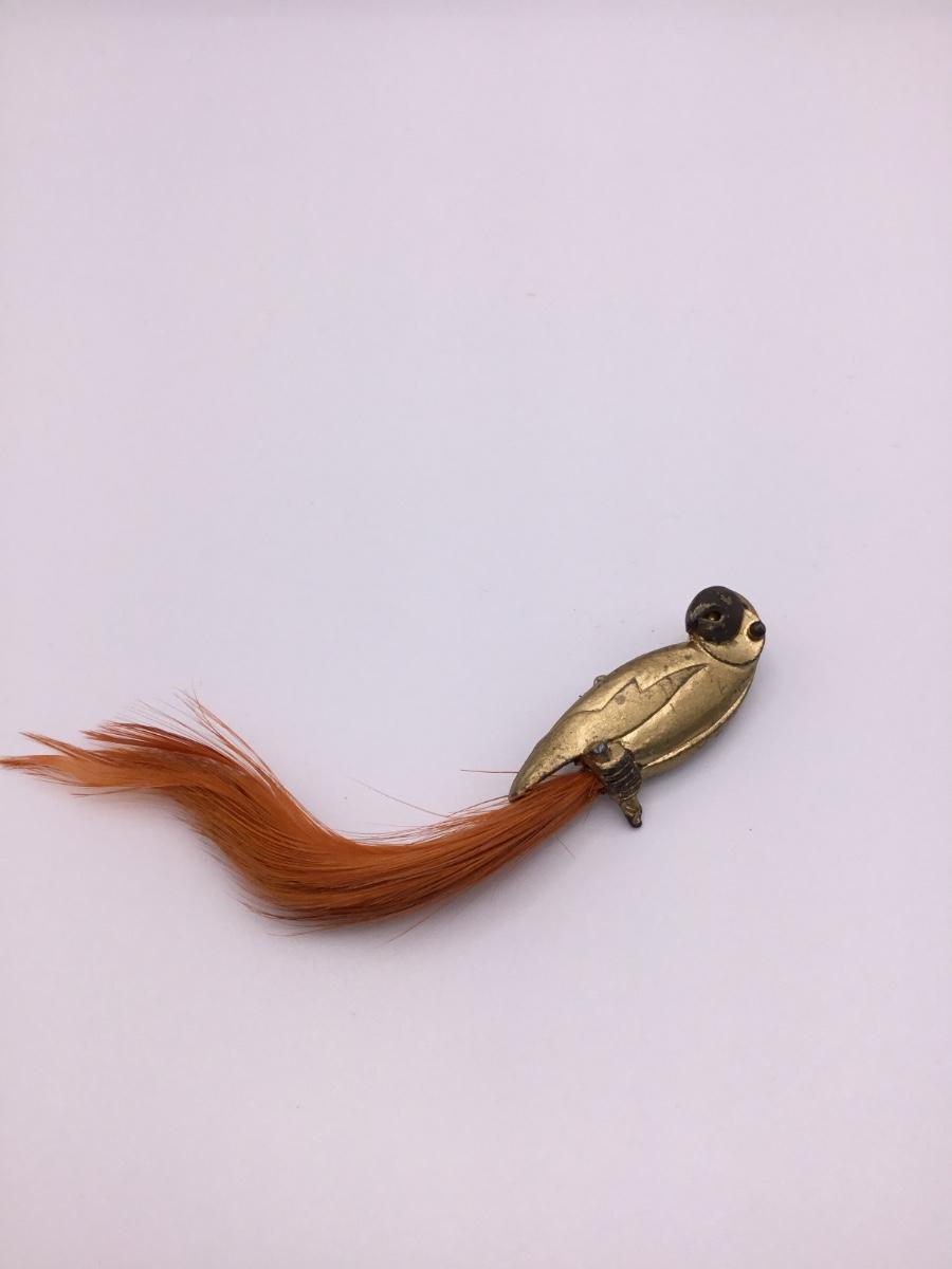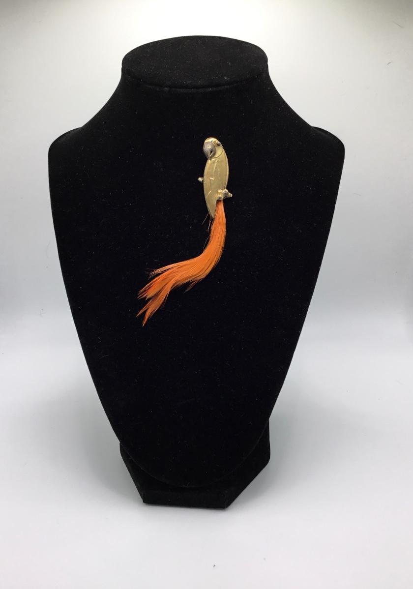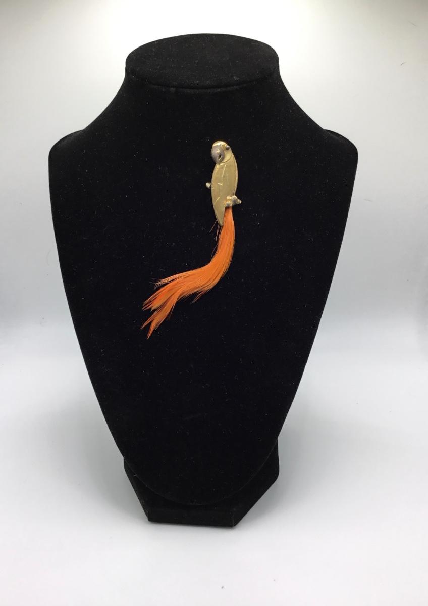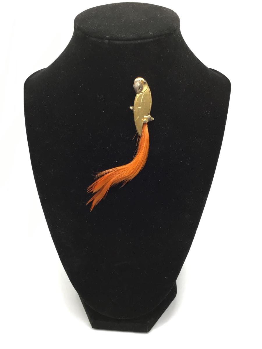 LOTJ122: Hallmarked Vintage Brass Parrot Brooch with Long Feather Tail