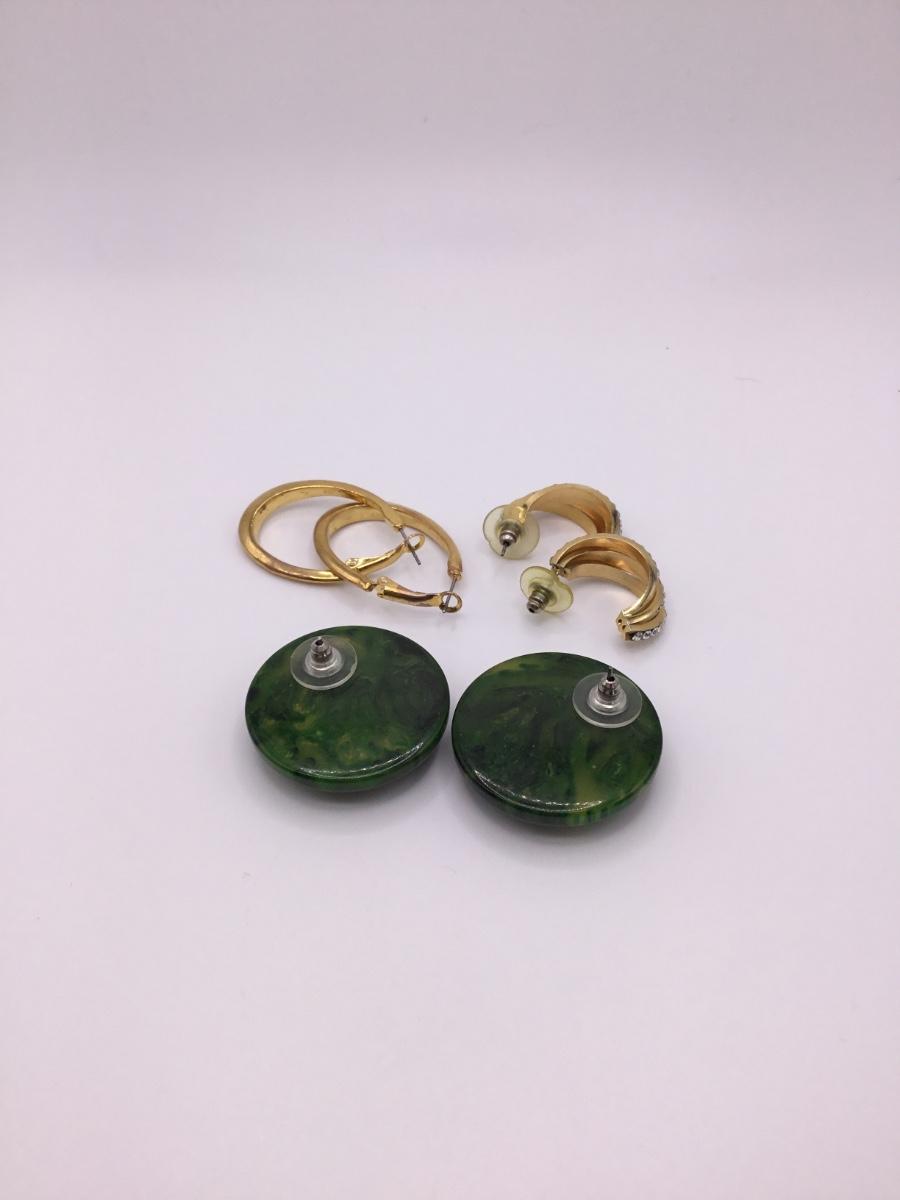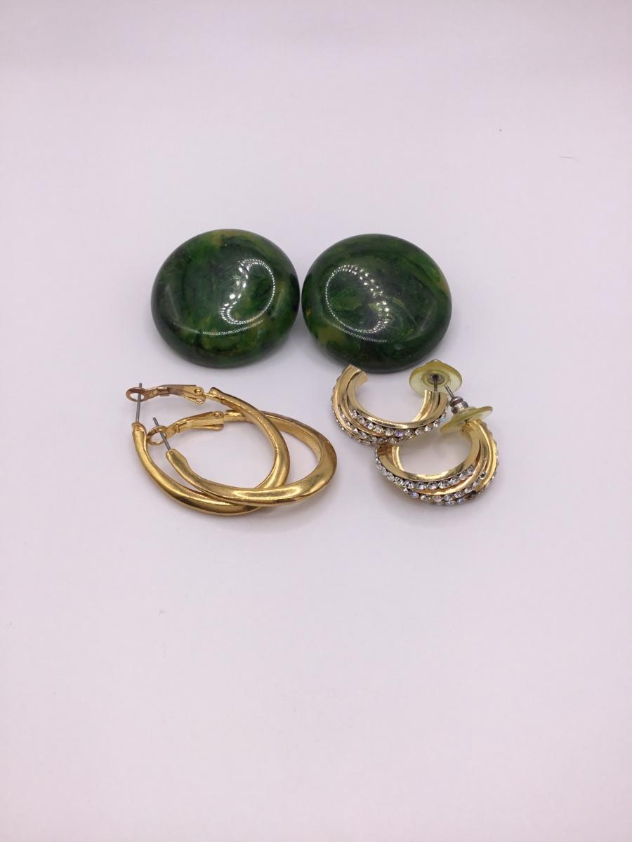 LOTJ154: Three Pair Fashion Earrings Green Plastic, Goldtone, Rhinestones