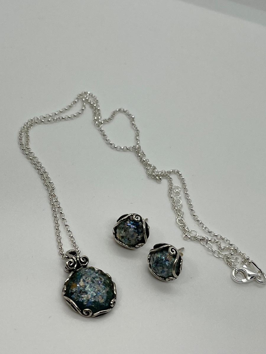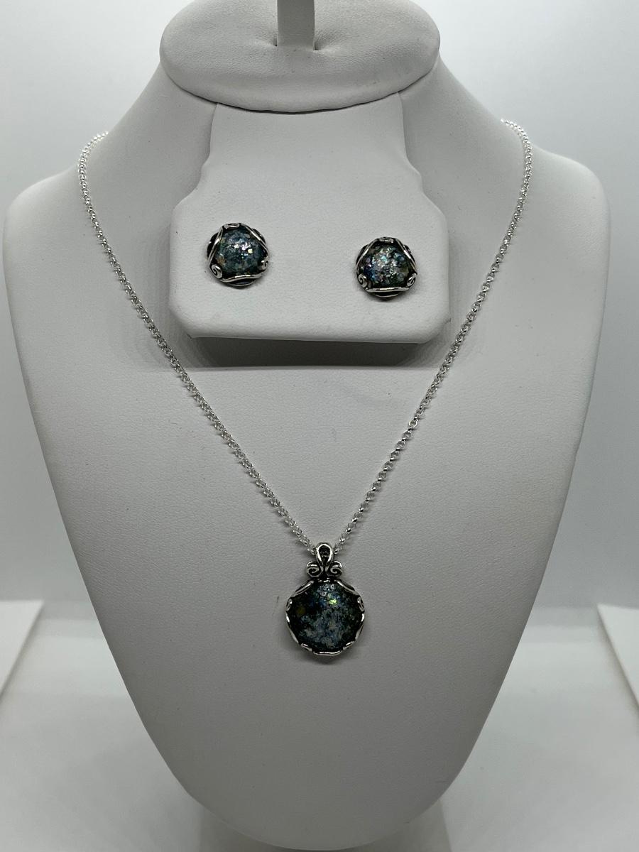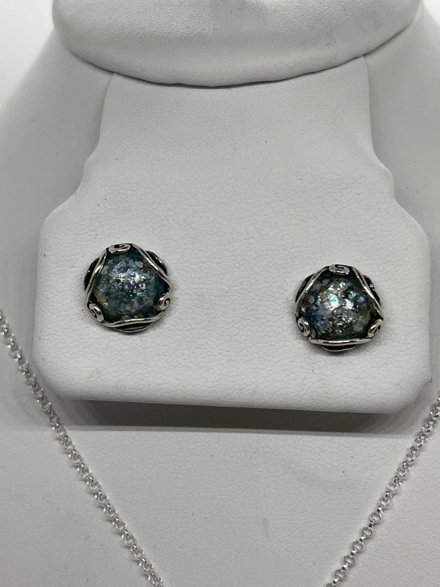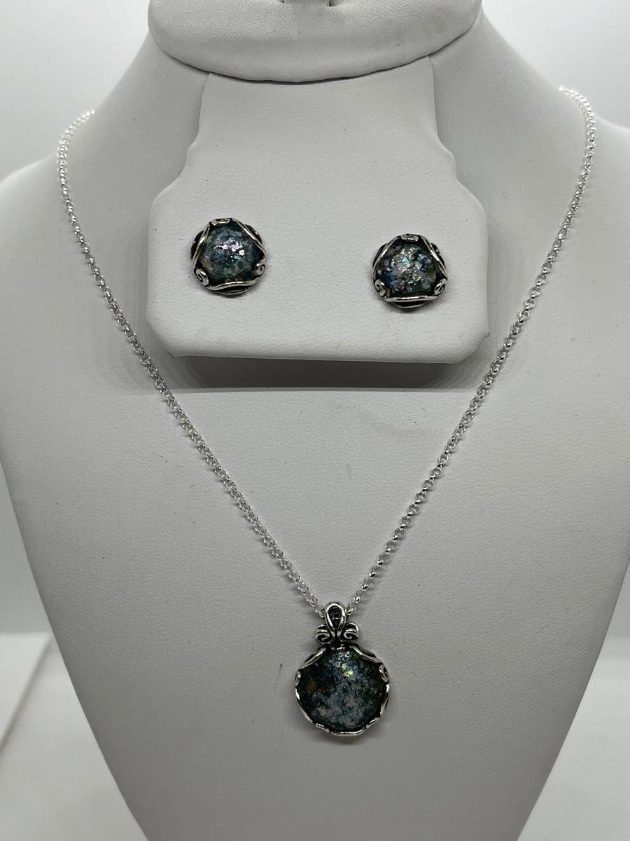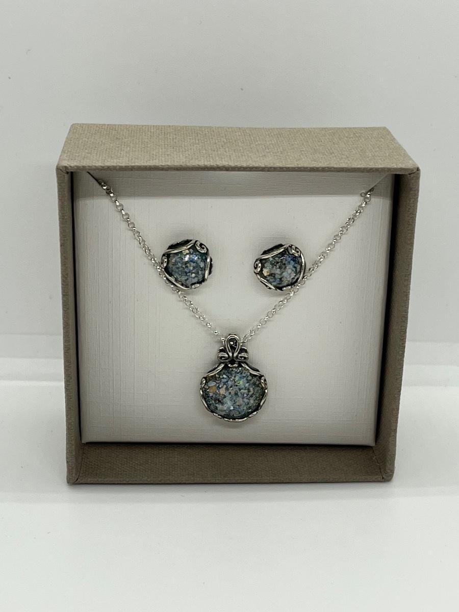 LOTJ161: New in Box Or Paz Sterling Silver Roman glass on 18" Necklace and Pierced Earrings Set from Israel