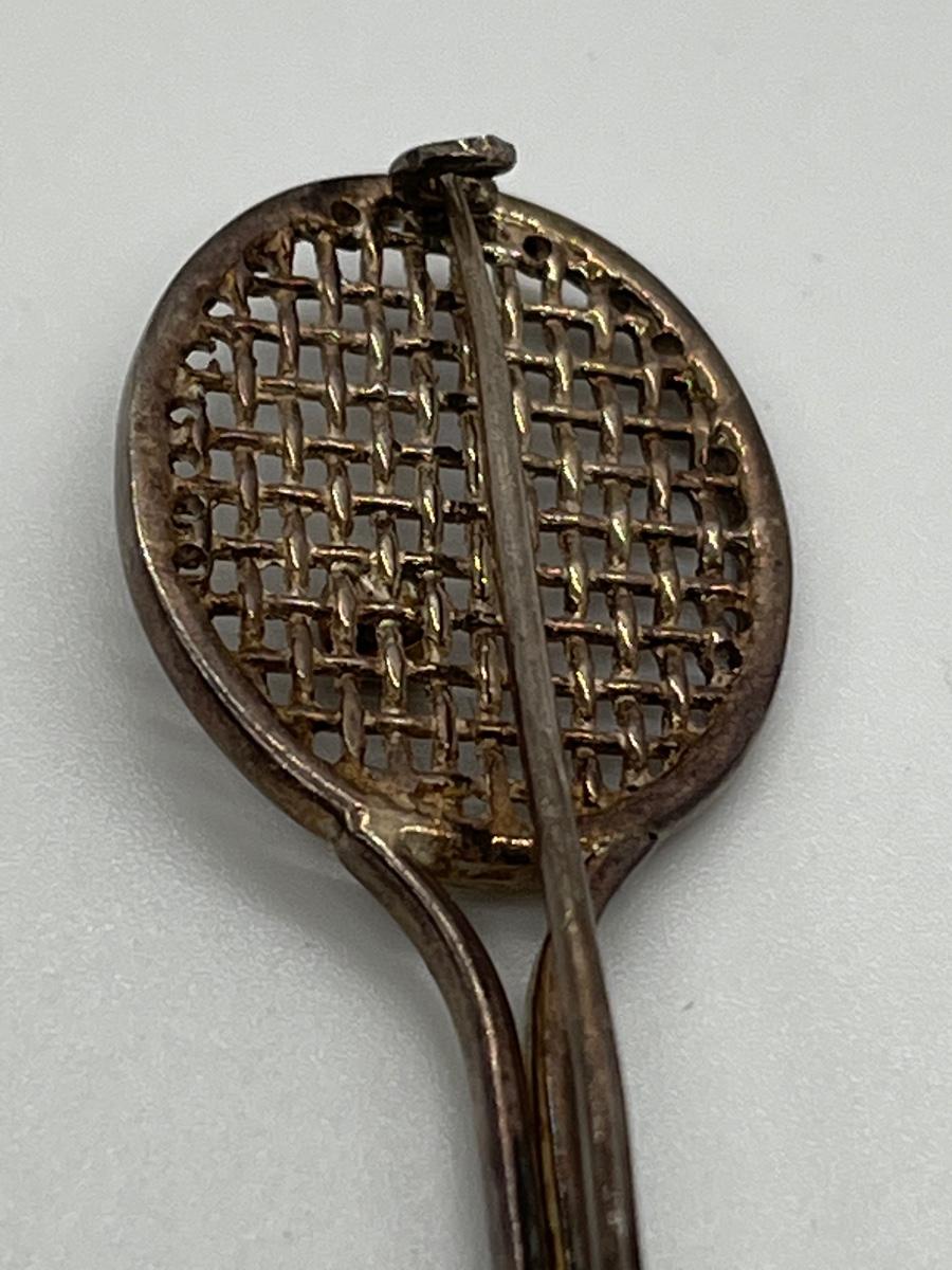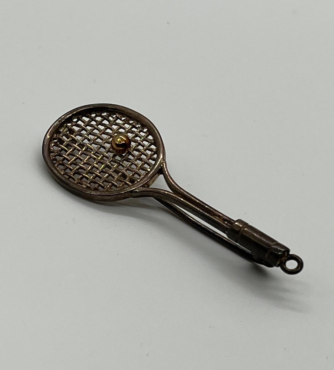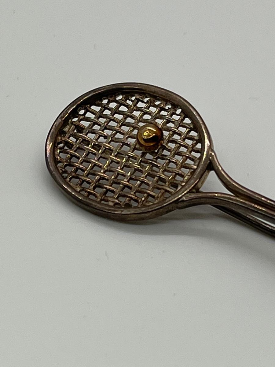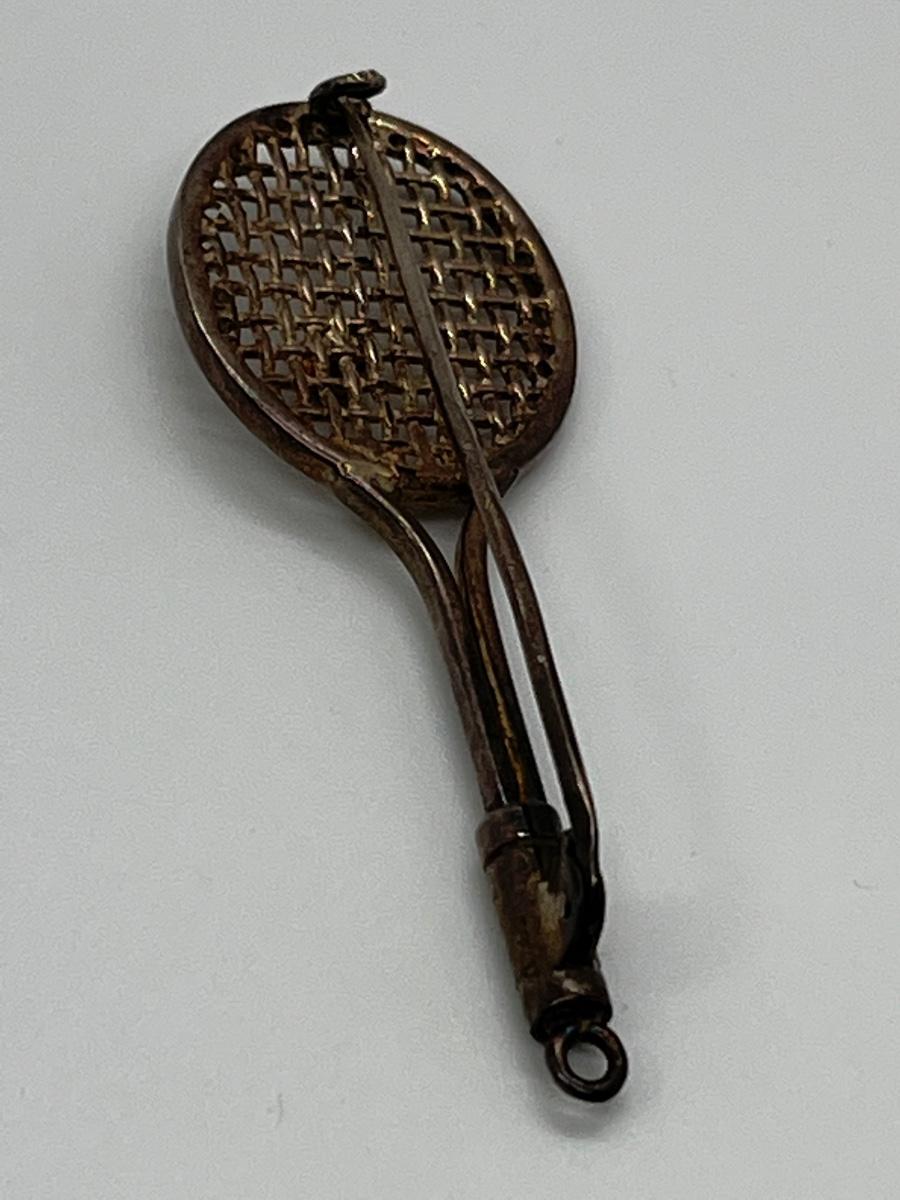 LOTJ166: Sterling Silver Vintage Tennis Racket Brooch with Gold Vermeil Ball Clean it to a silver shine or wear with Vintage Patina