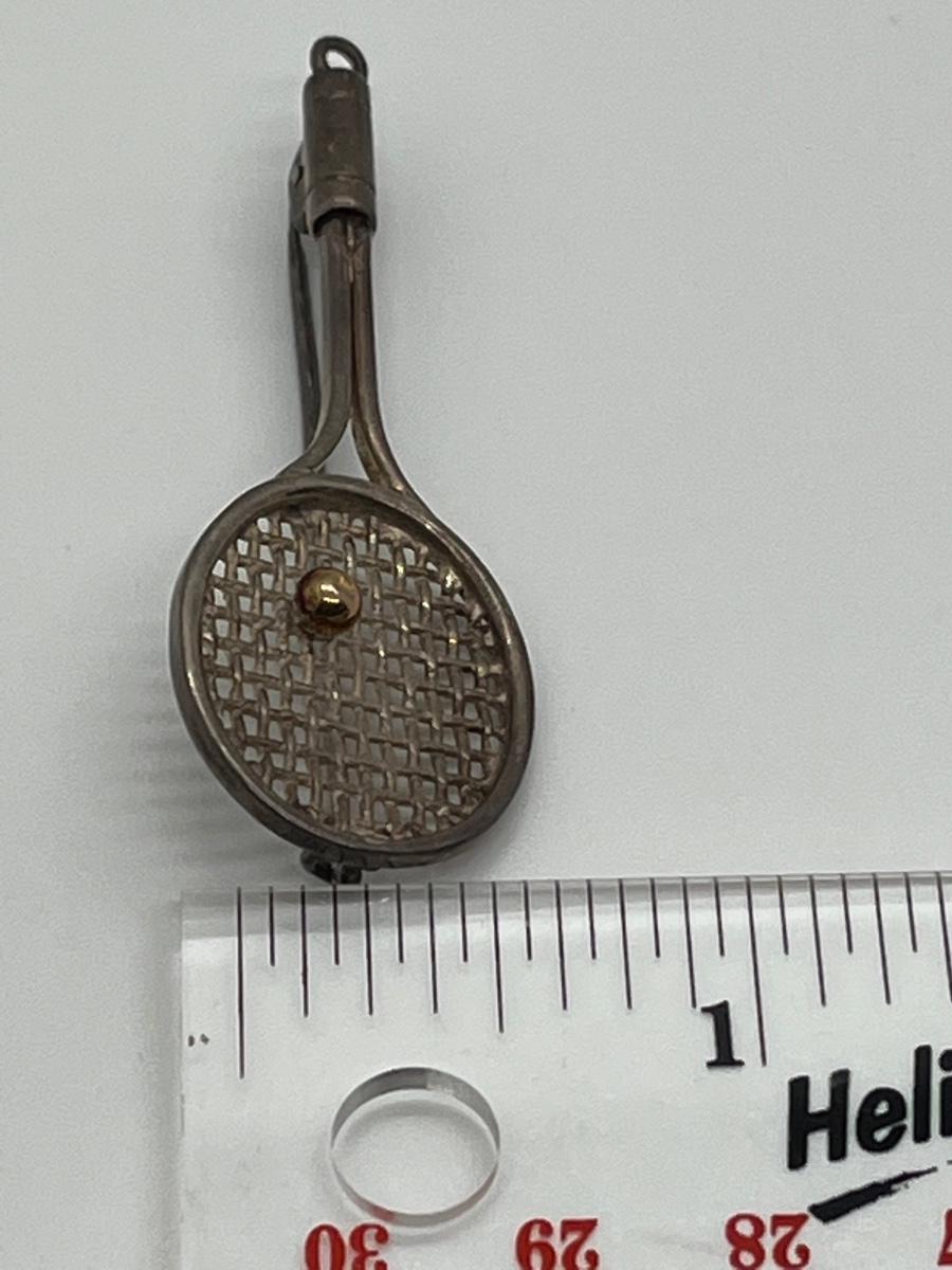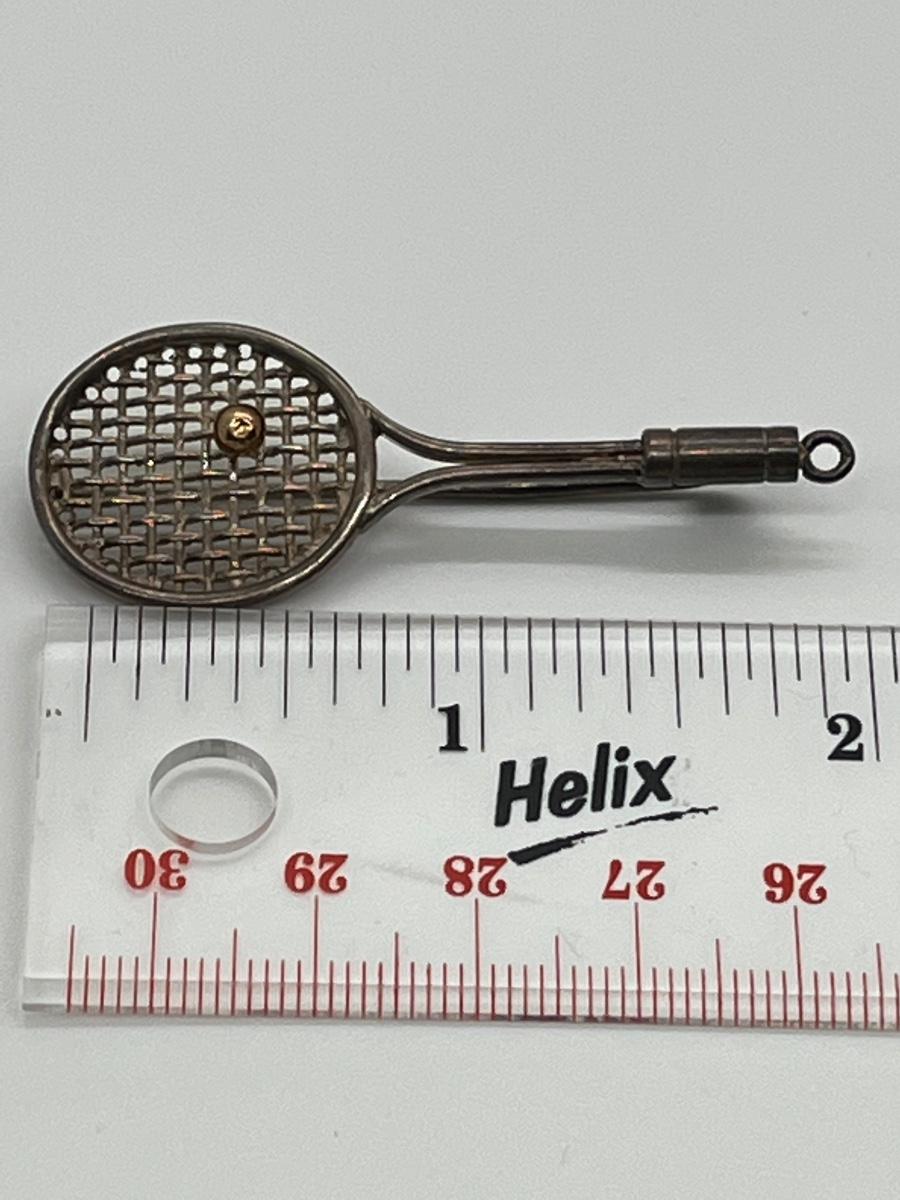 Sterling Silver Vintage Tennis Racket Brooch with Gold Vermeil Ball. The pictures show condition, measurements if taken, and what is included in the lot. All items unless noted, are pre-owned and may or may not have been worn. Unless noted in the pictures or description, there are no boxes for the jewelry. Shipping will be offered at the actual shipping cost to your zip-code plus $5.00 for packing and handling. We can do combined shipping. Items over $50.00 will have an added insurance charge, and will be signature required for delivery at the buyers expense. All lots have a Buyers Premium of 15%. For a shipping quote, please email with zip code and items (lot) numbers. Treasure Me Estate Sales offers shipping as a courtesy and in doing so, reserves the right to choose the shipping supplies including whether not to send in an envelope or box to protect the integrity of the item. When the auction closes, and all items have sold, you will receive an invoice with all of your winning items. If you need shipping, and there is not a shipping charge on the invoice, please email for a quote and new invoice will be sent with shipping charges and pay at that time. Paying through PayPal helps so we can generate a label with tracking, but is not required. Thank you and please email with any questions.