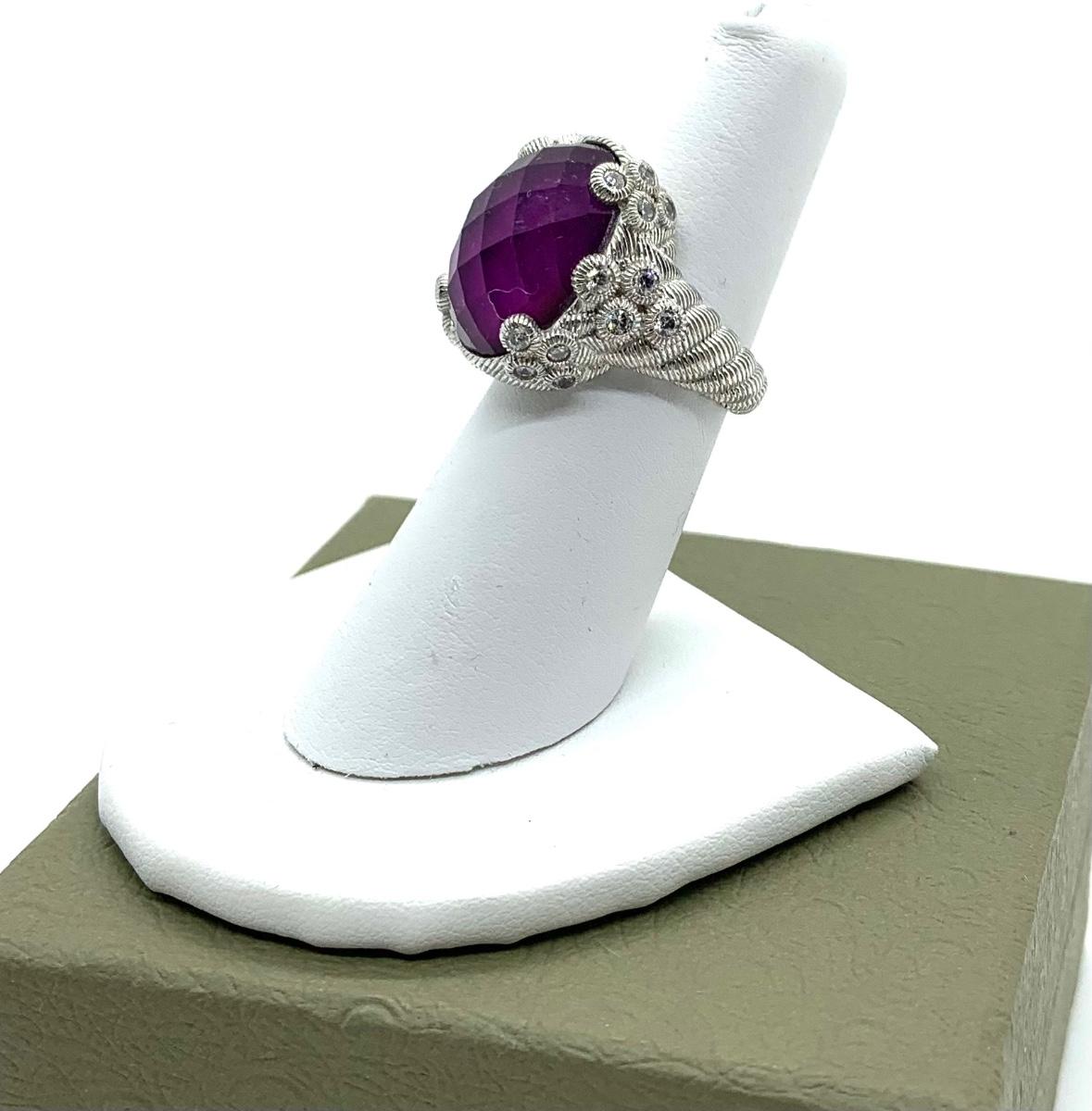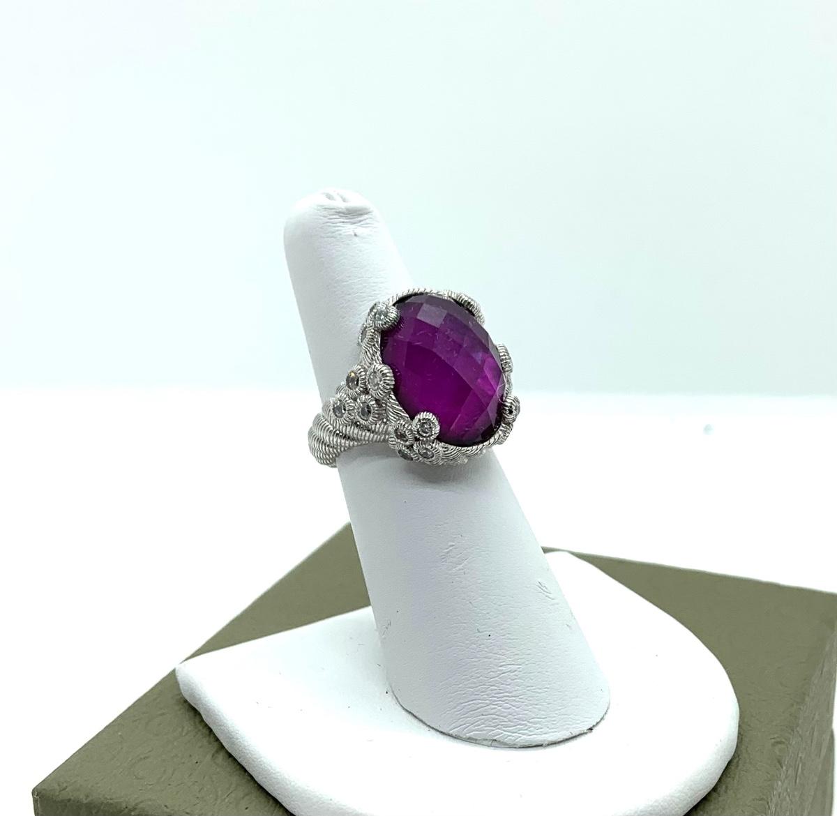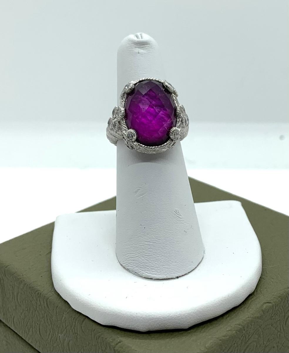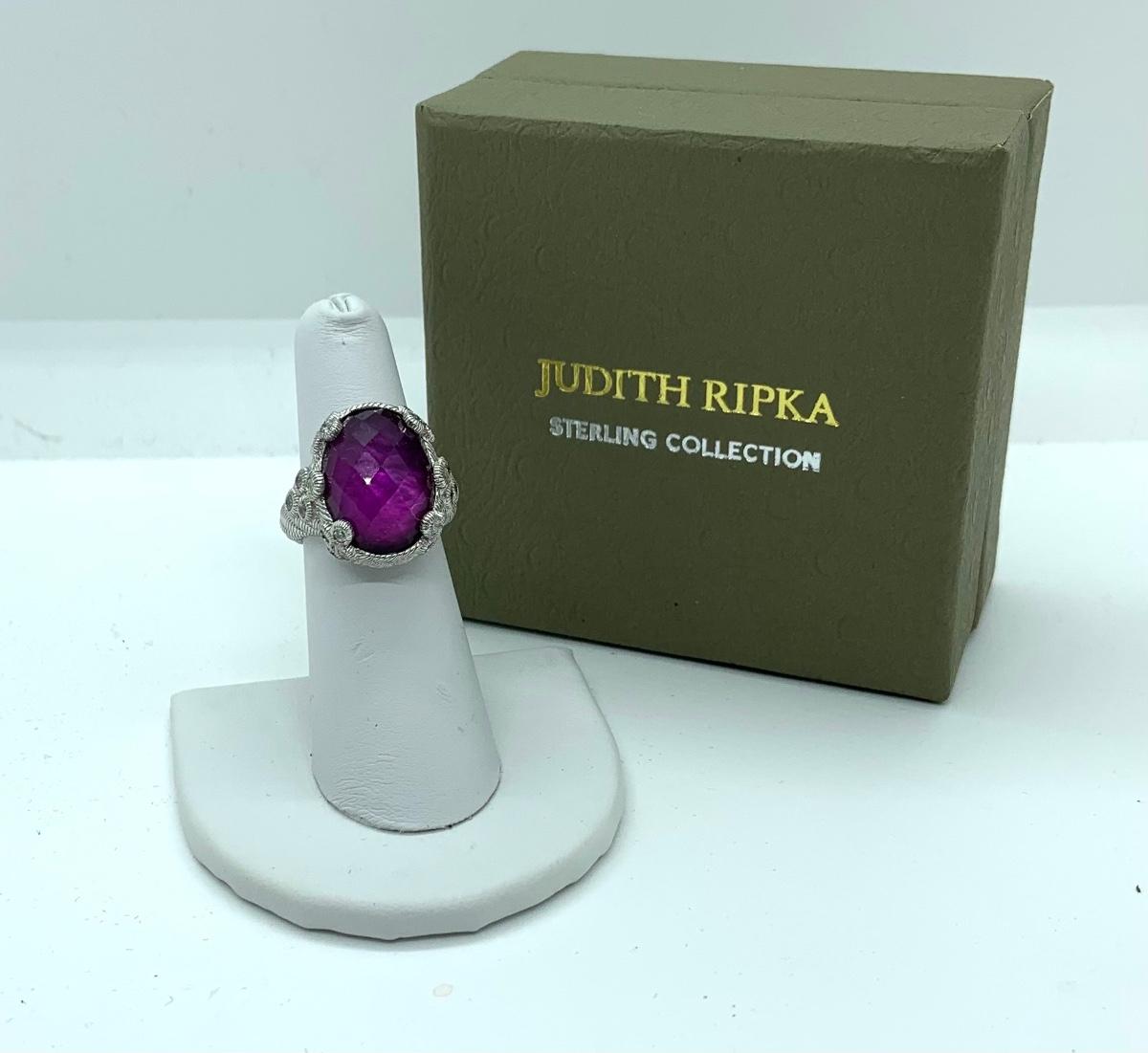 LOTJ170: New in box Judith Ripka Sterling Silver Diamonique and Rasberry Gem Doublet Ring sz. 6