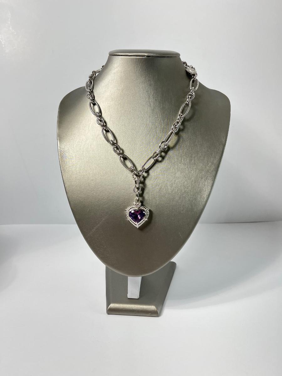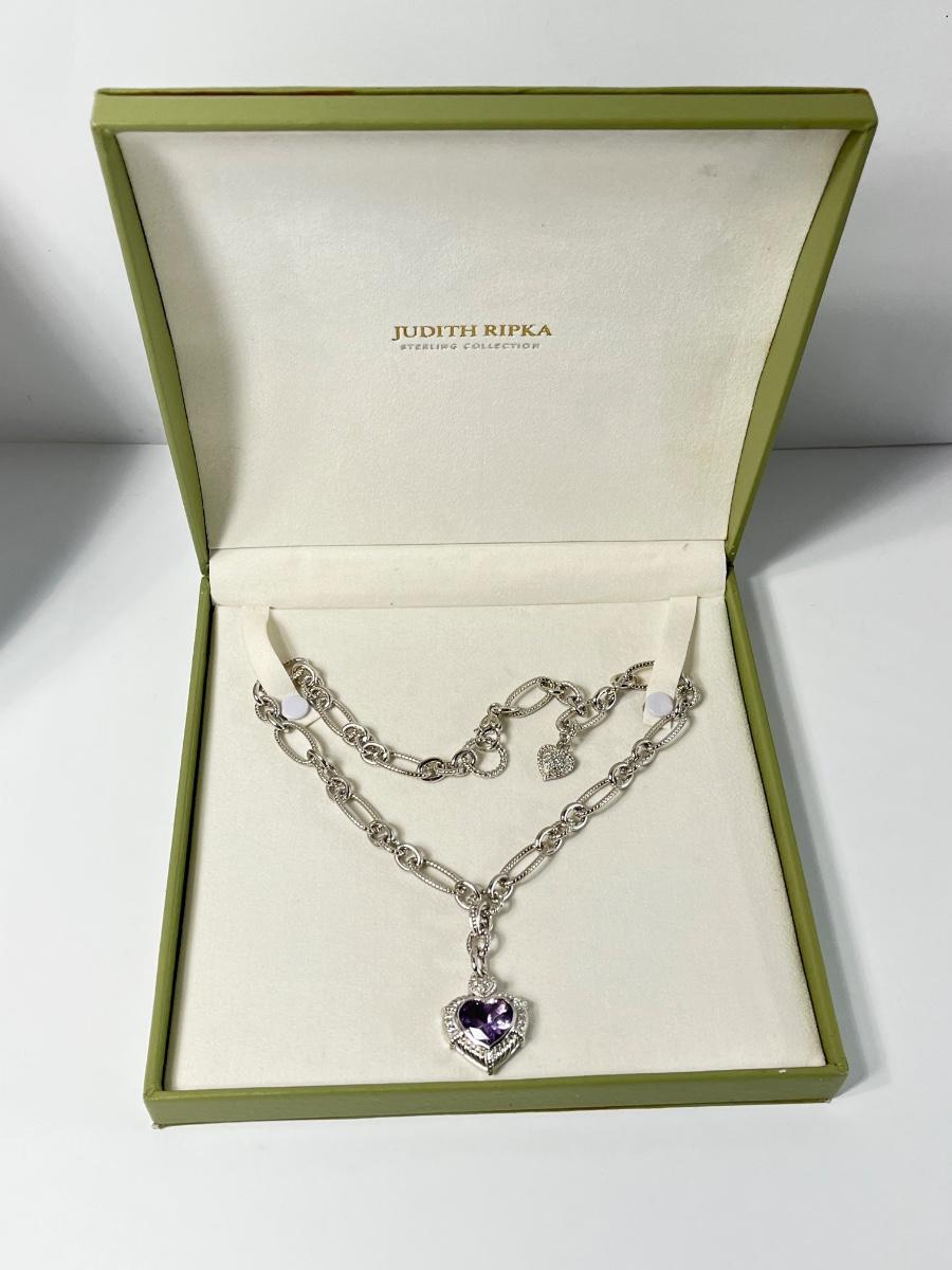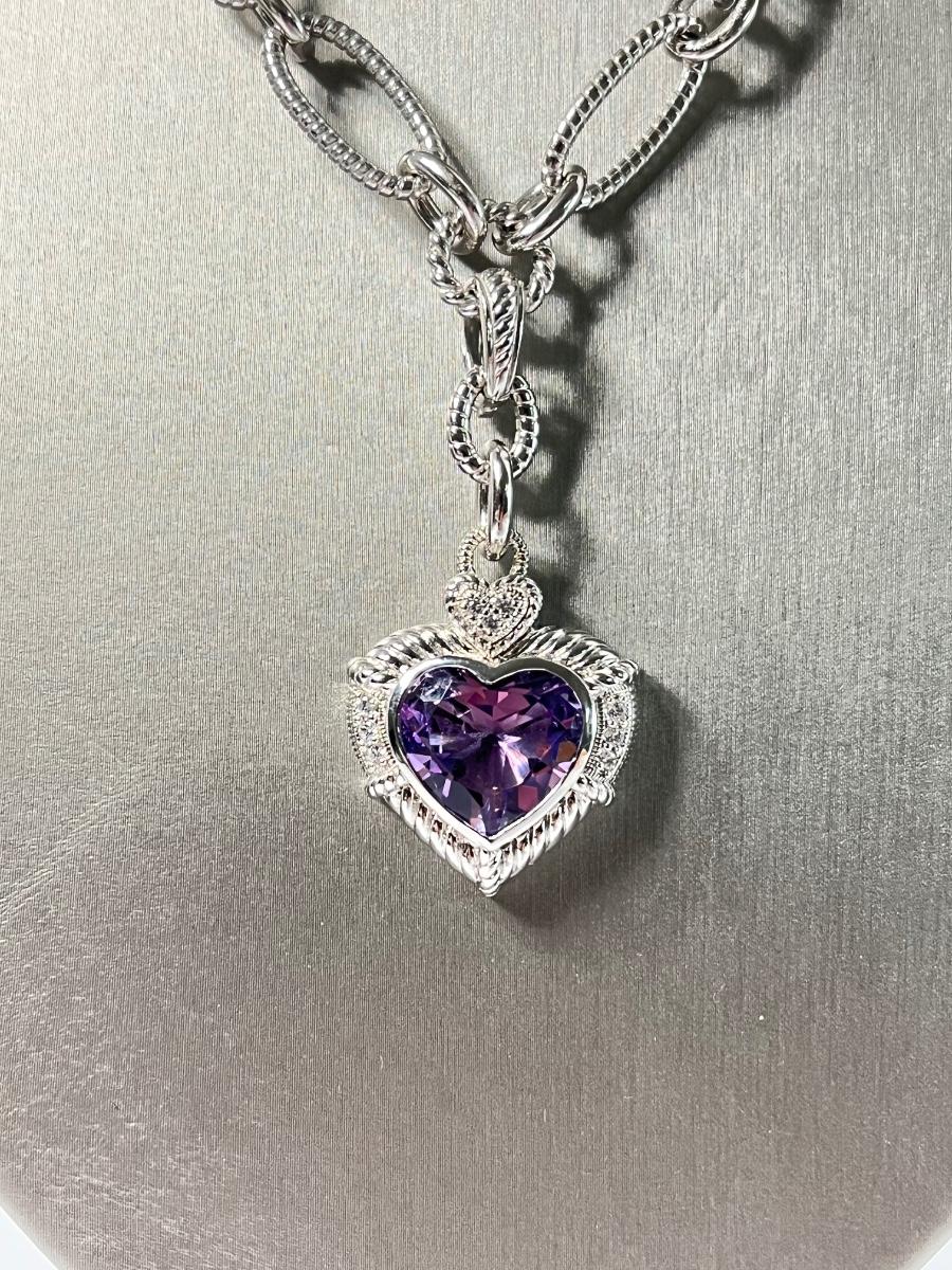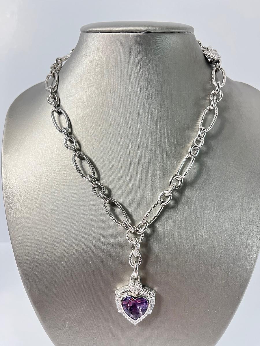 LOTJ180: New in box Judith Ripka 7.00ct Amethyst Sterling Heart Enhancer w/18" Sterling Chain