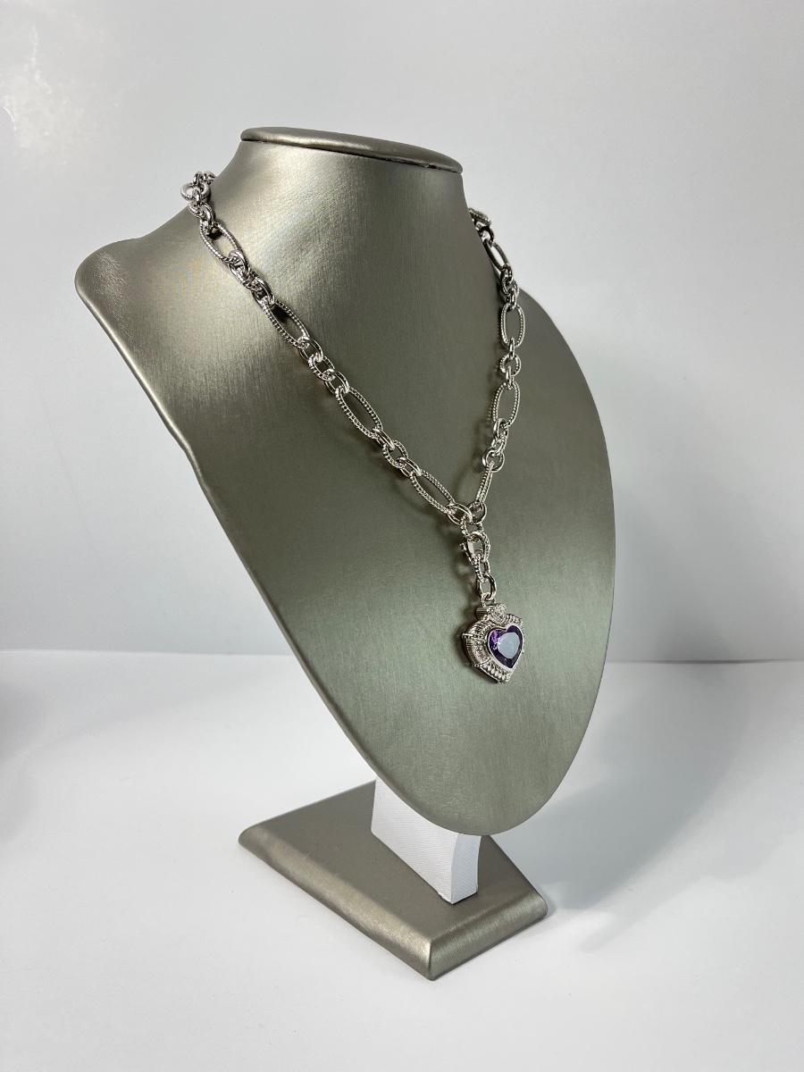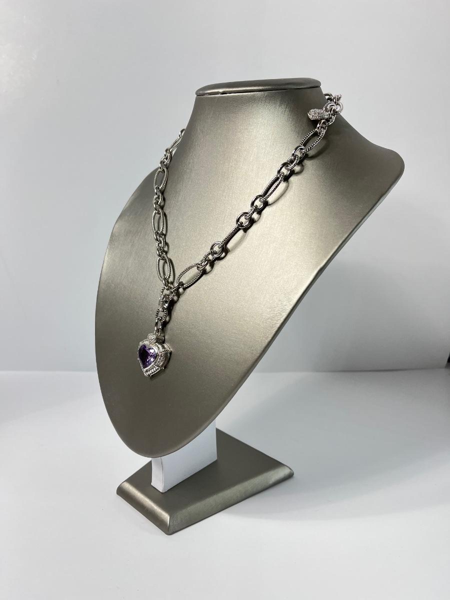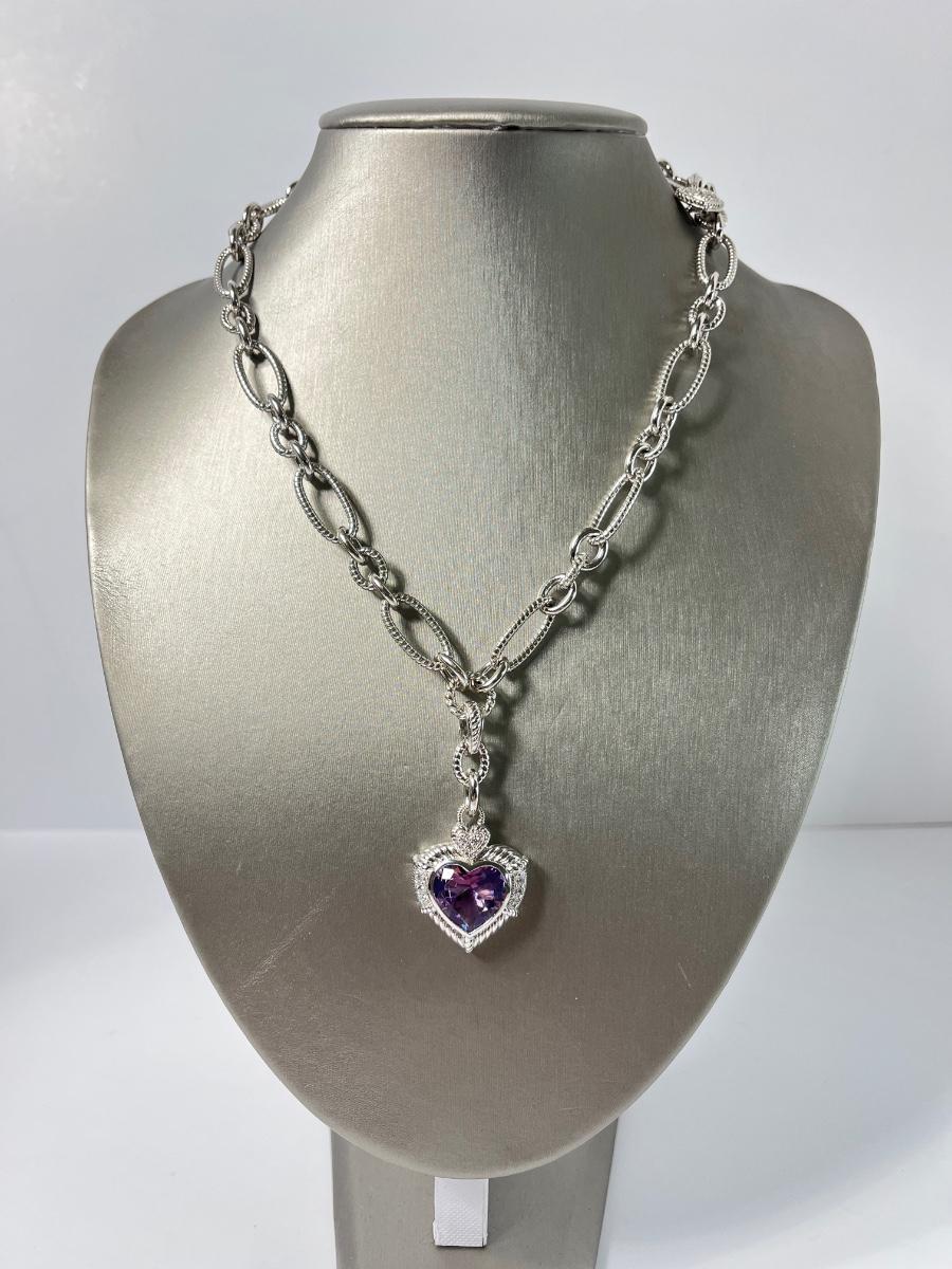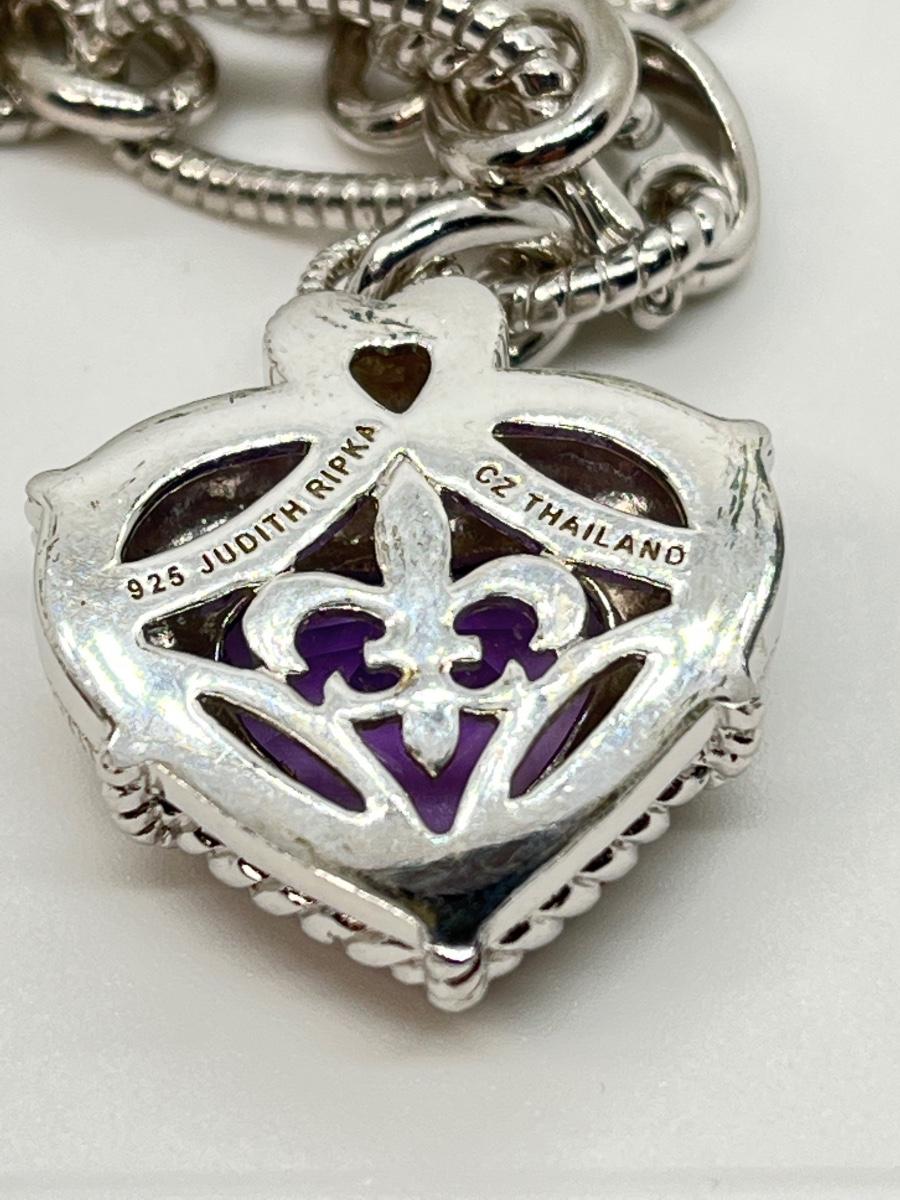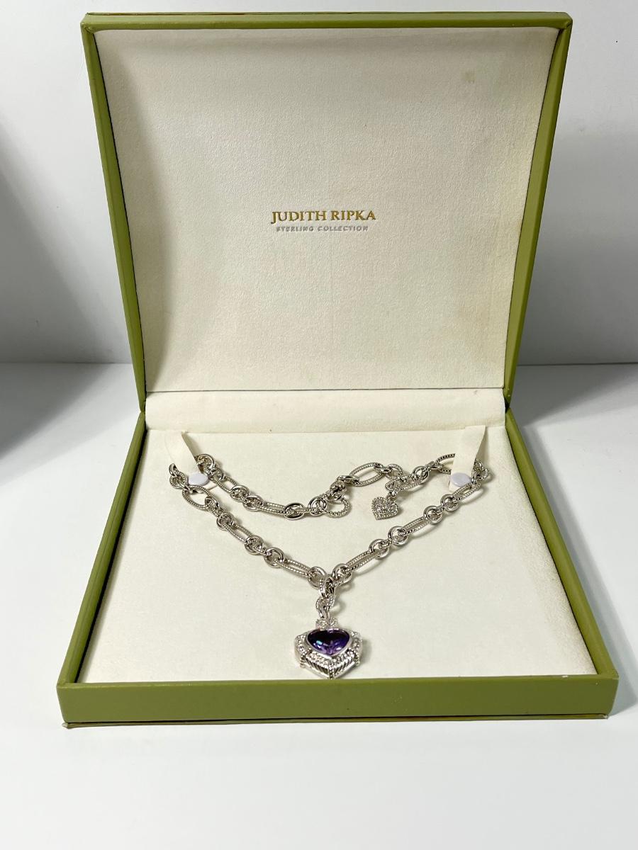 LOTJ180: New in box Judith Ripka 7.00ct Amethyst Sterling Heart Enhancer w/18" Sterling Chain