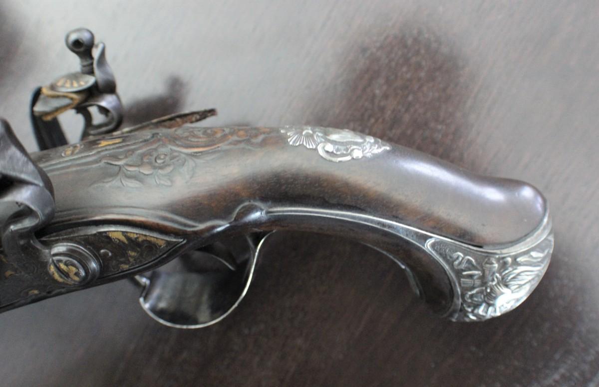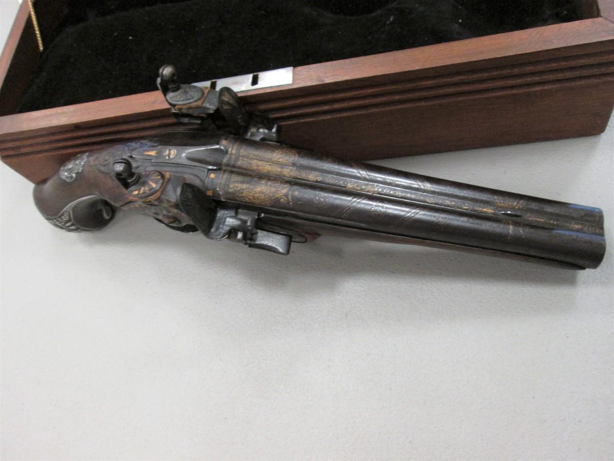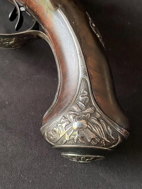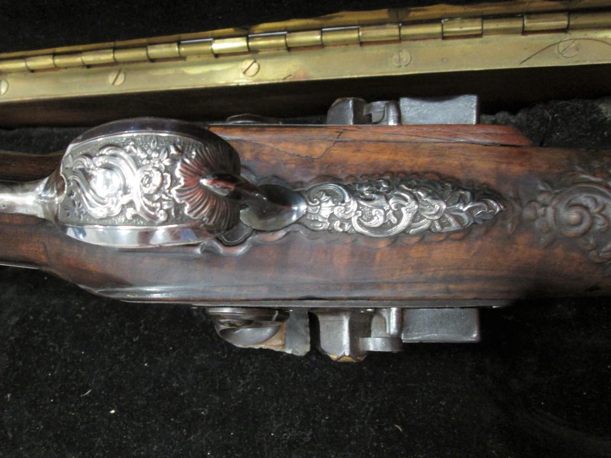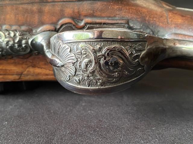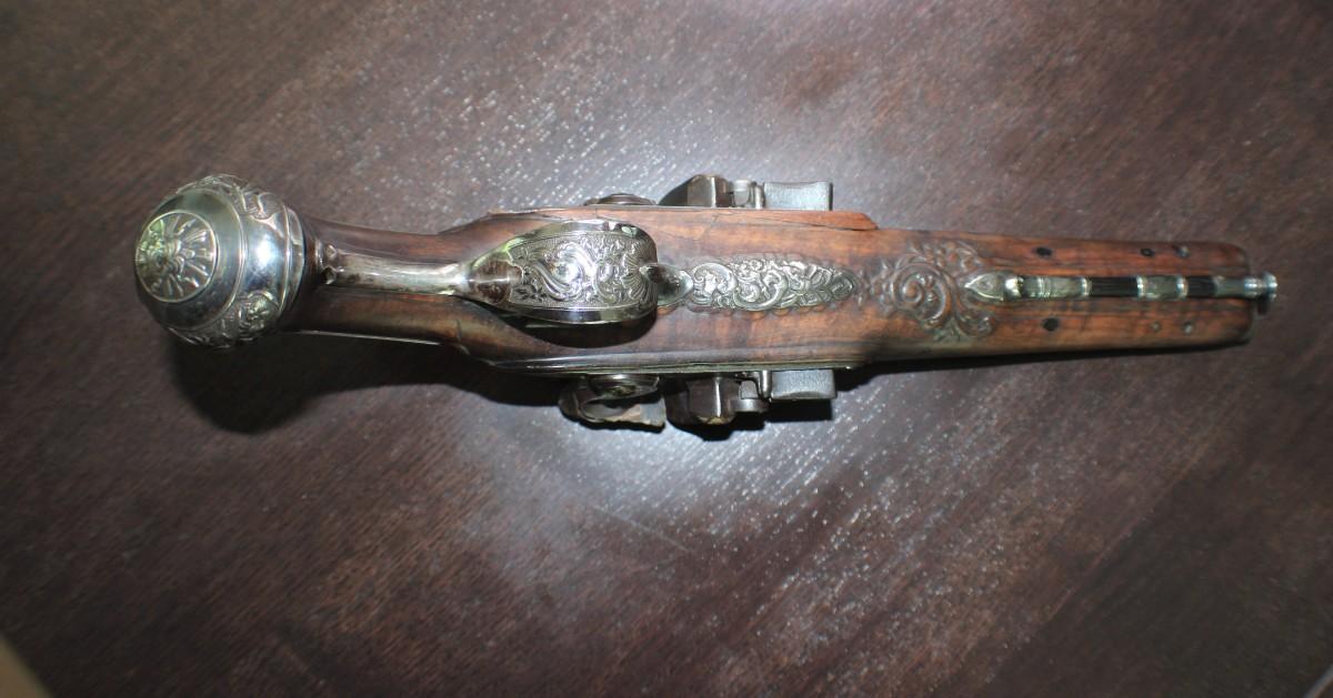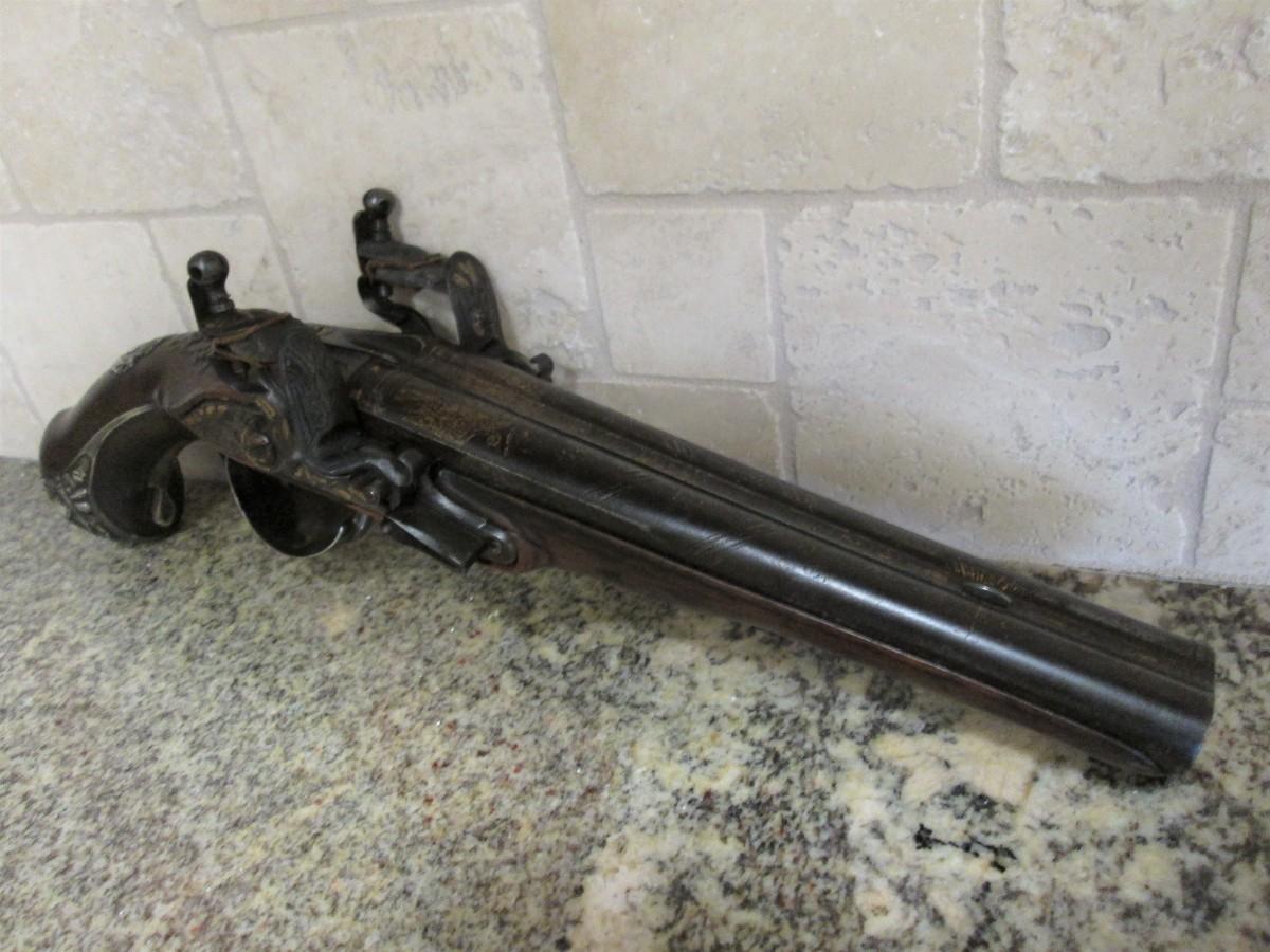 Double barrel smoothbore pistol with approximate bore diameters of 14.50mm measured with precision caliper. Signed on the lock plate "Thiolliere of St. Etienne". Stock believed to be walnut. Solid Sterling trigger guard, pipes, scroll and pommel. This flintlock pistol was minimally restored 45 years ago according to included letter. According to our research only, there are less that five pistols similar to this that are known to exist in the United States. Our research as an auction company uncovered anecdotes that some may have been used by officers during the French and Indian War.