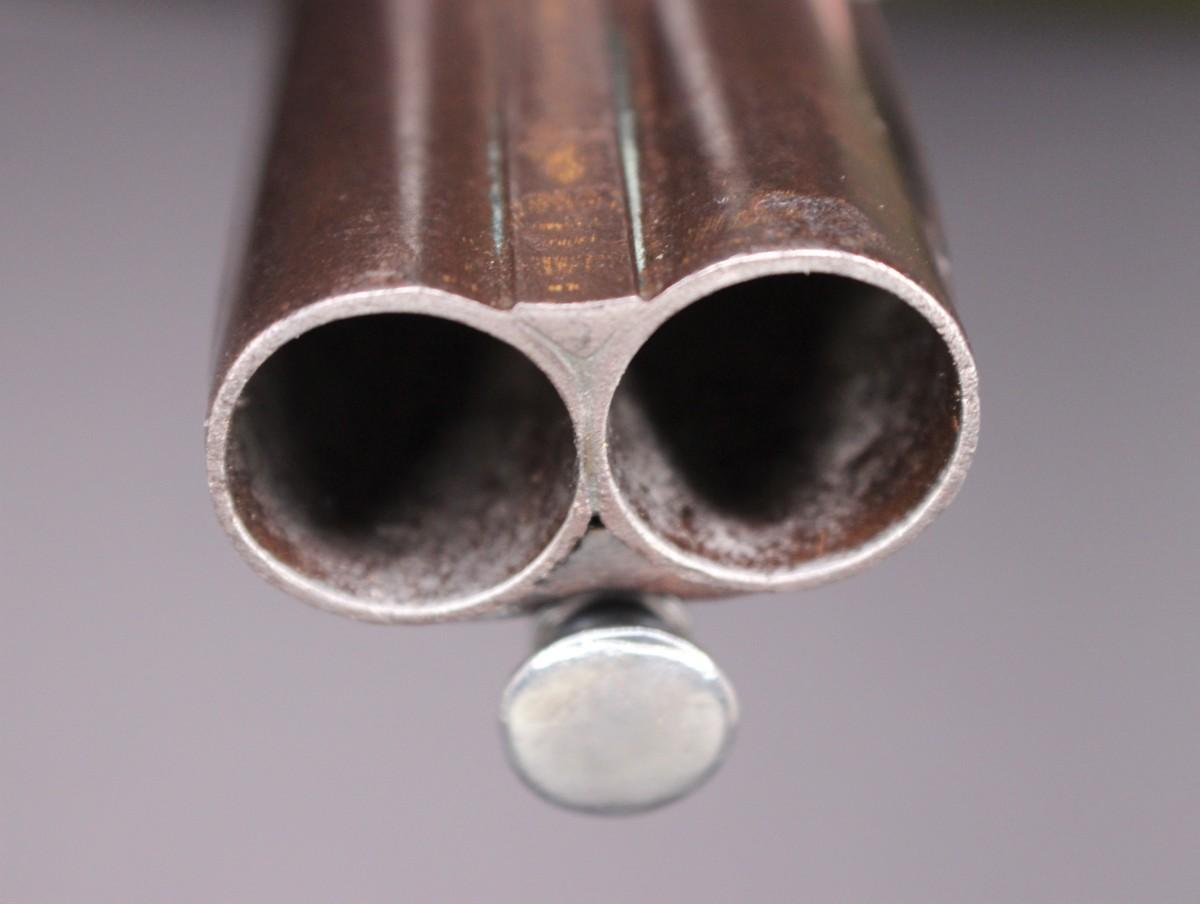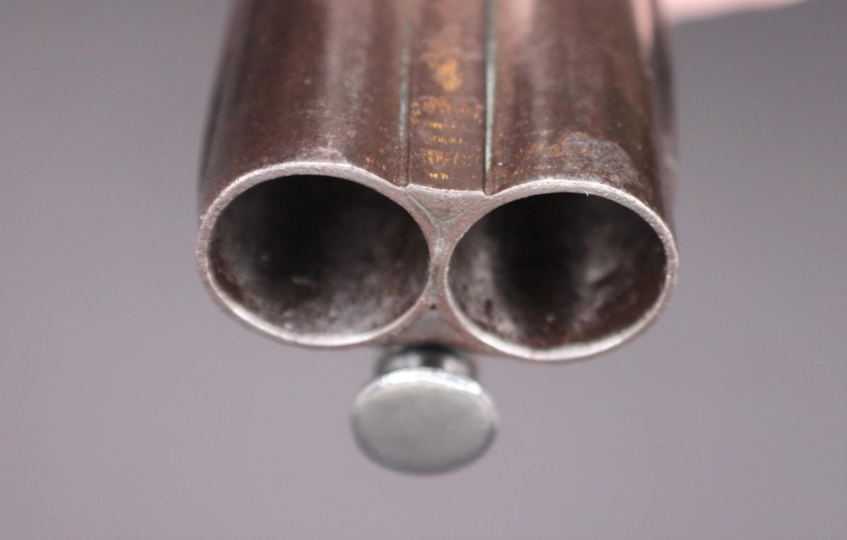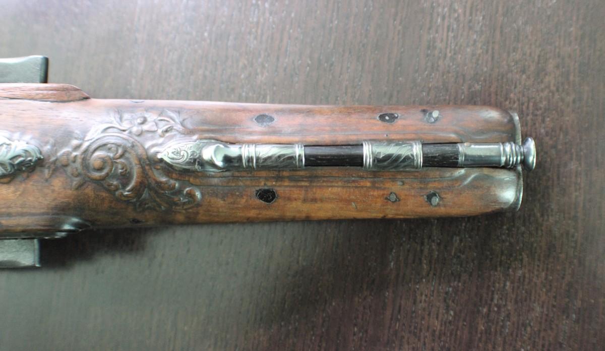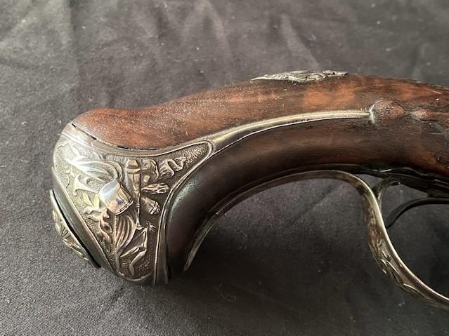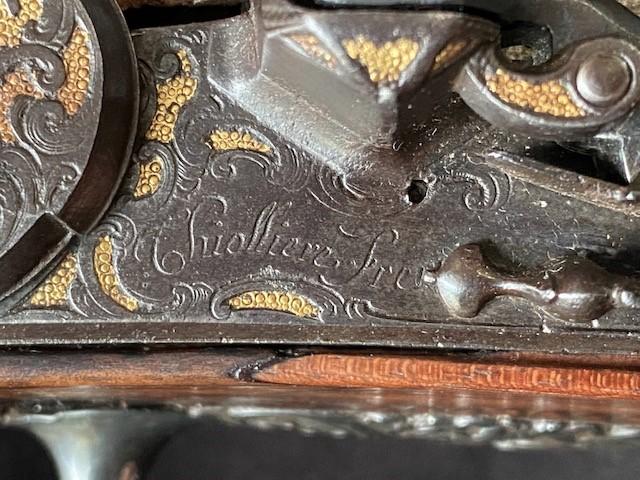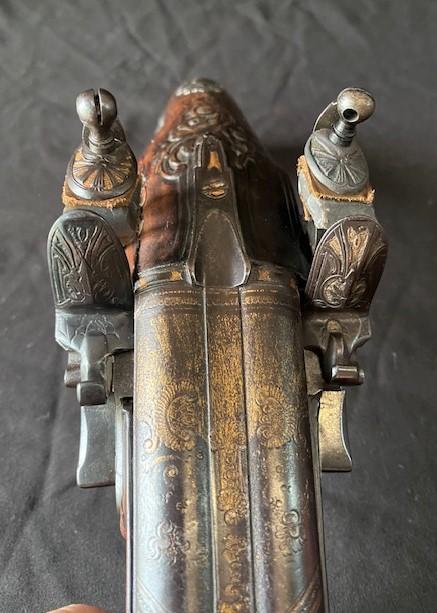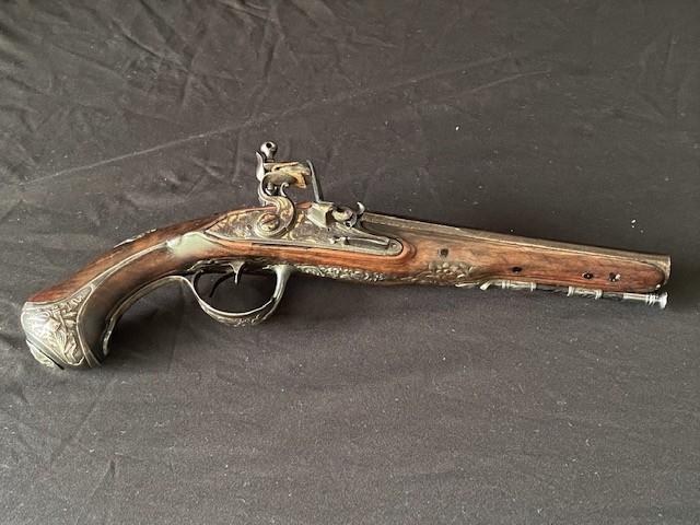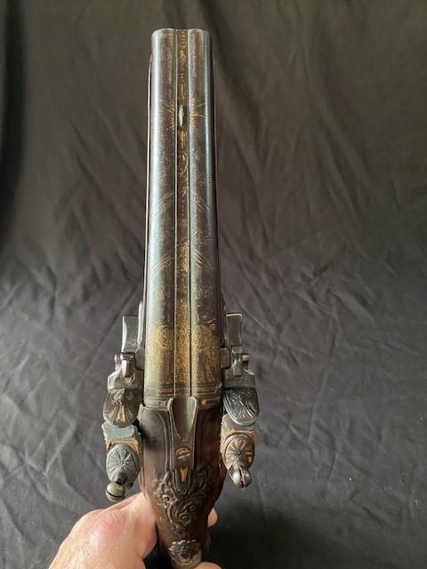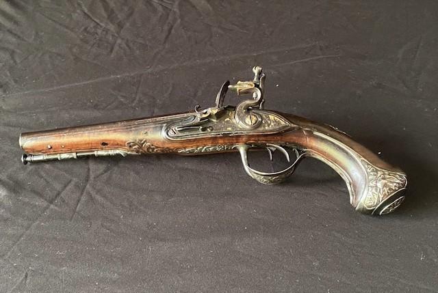 Double barrel smoothbore pistol with approximate bore diameters of 14.50mm measured with precision caliper. Signed on the lock plate "Thiolliere of St. Etienne". Stock believed to be walnut. Solid Sterling trigger guard, pipes, scroll and pommel. This flintlock pistol was minimally restored 45 years ago according to included letter. According to our research only, there are less that five pistols similar to this that are known to exist in the United States. Our research as an auction company uncovered anecdotes that some may have been used by officers during the French and Indian War.