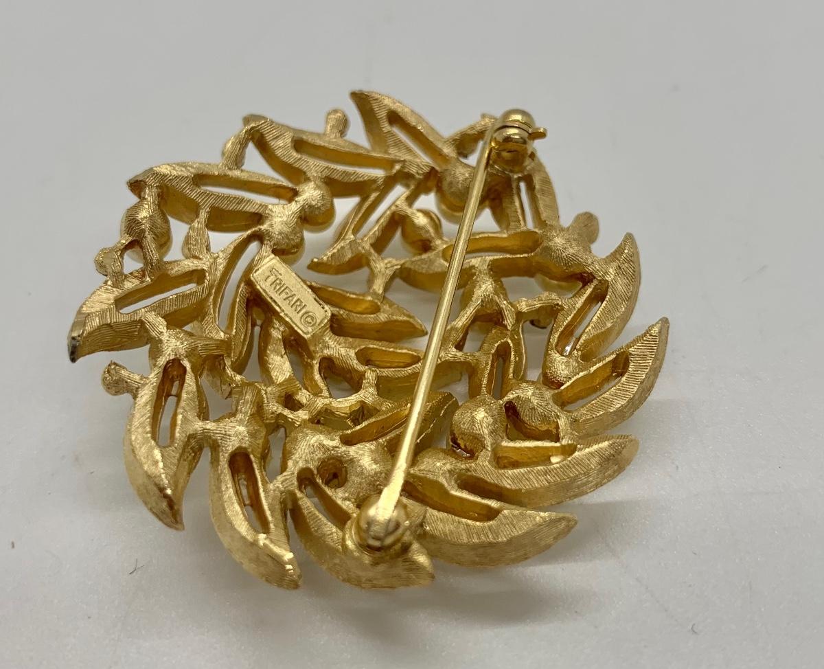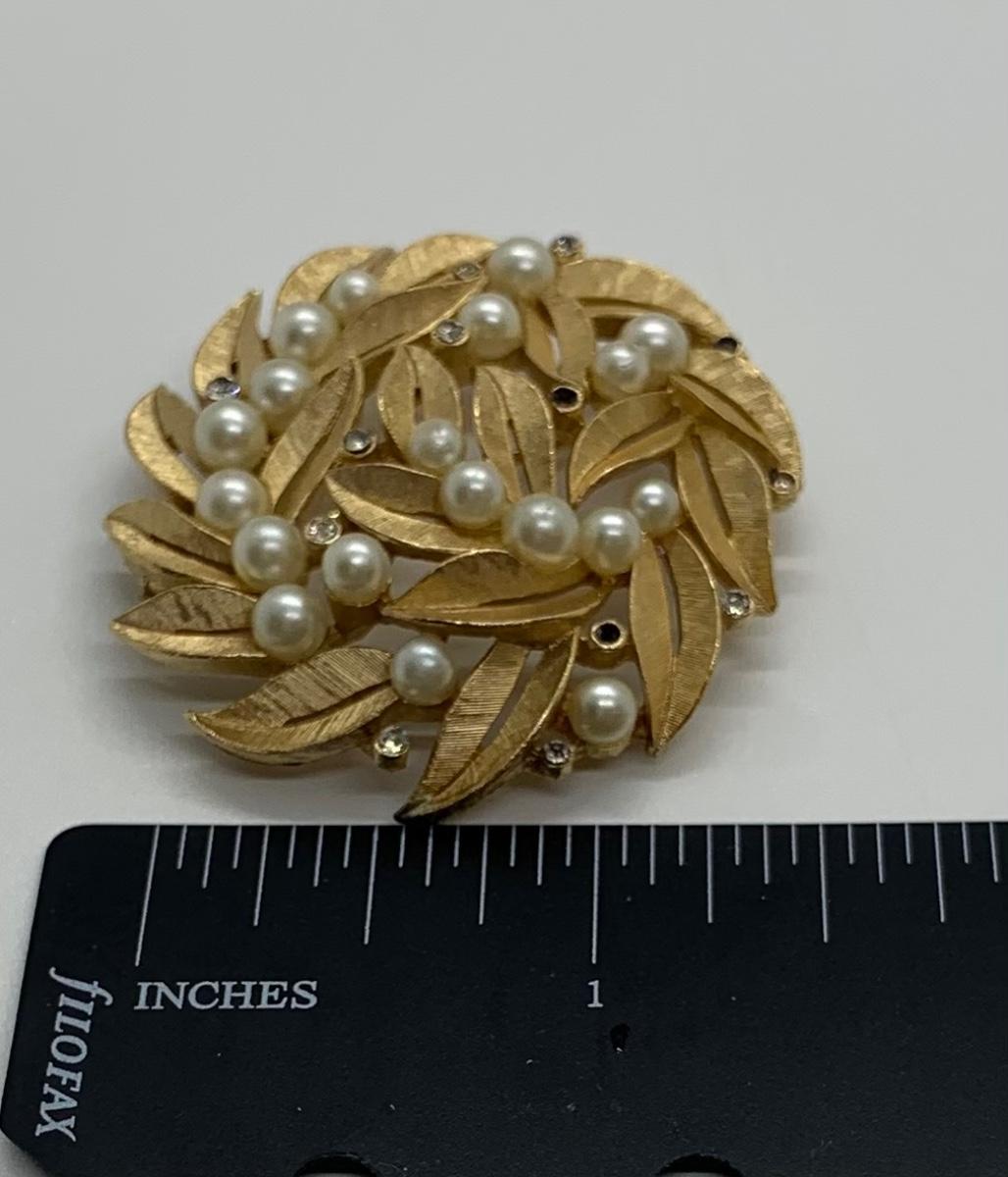 LOTJ38: Two Vintage Goldtone Brooches: The Giovanni Rose and Vintage "Crown" Trifari circular leaf and  faux pearl