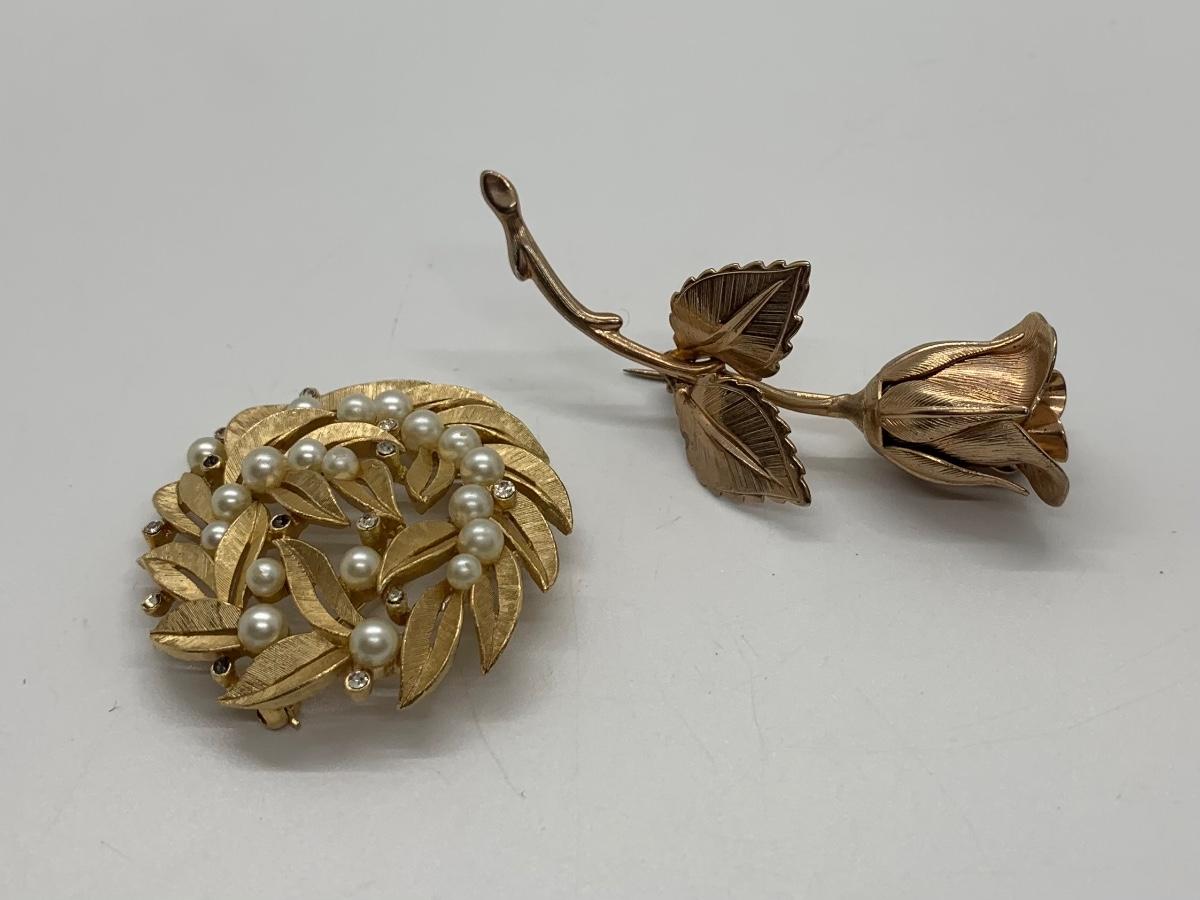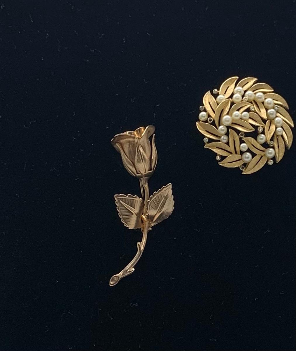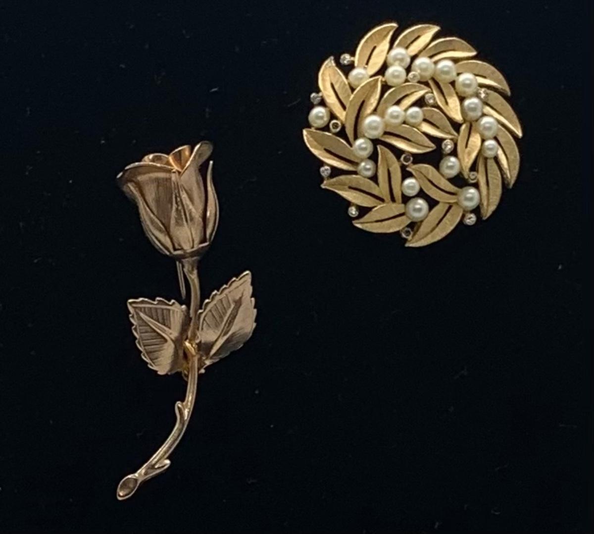 LOTJ38: Two Vintage Goldtone Brooches: The Giovanni Rose and Vintage "Crown" Trifari circular leaf and faux pearl
