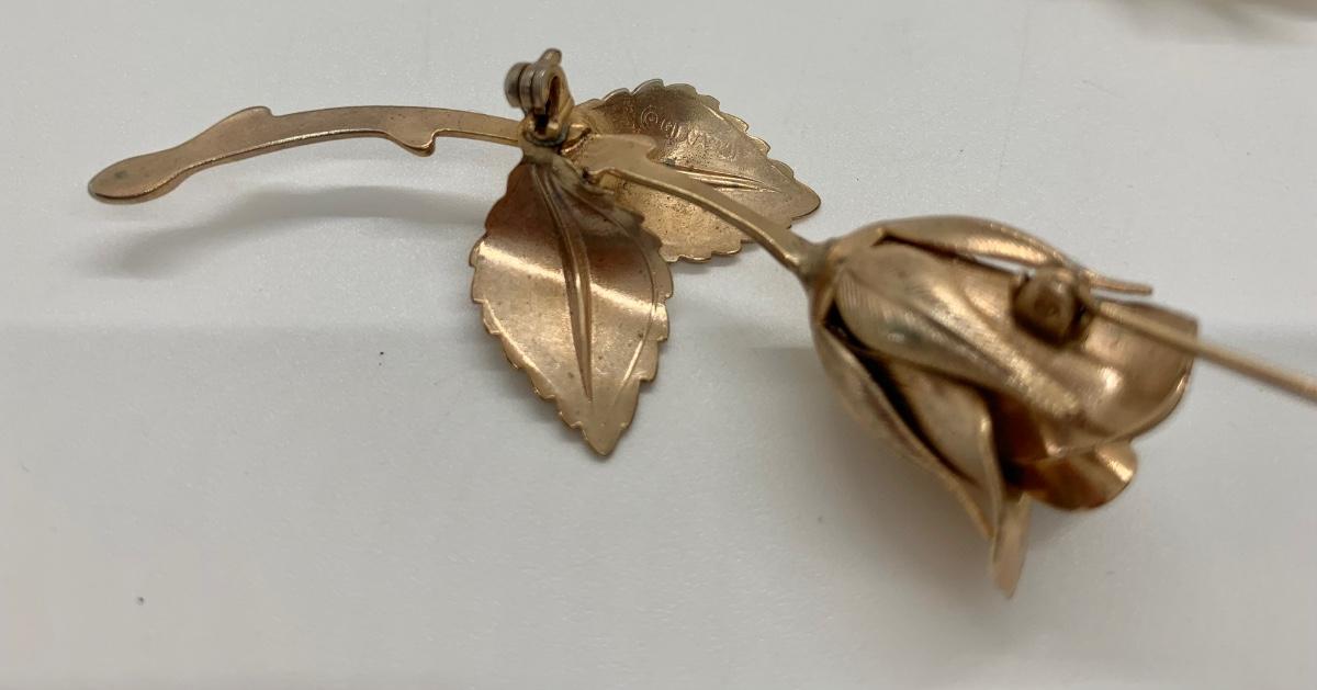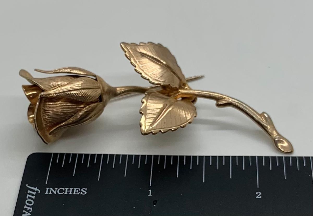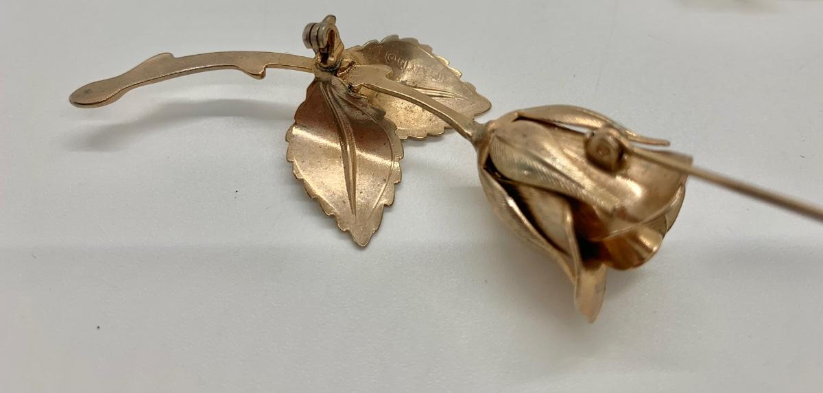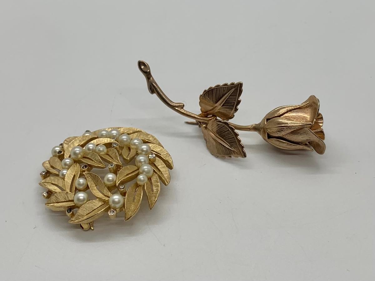 LOTJ38: Two Vintage Goldtone Brooches: The Giovanni Rose and Vintage "Crown" Trifari circular leaf and faux pearl