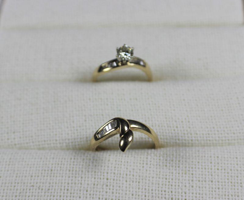 Total "Diamond" weight = .50carats. At least 19 baguette diamonds between both pieces. Ring size 6. Gemoro Ultra Tester 3 used to confirm "Diamonds"