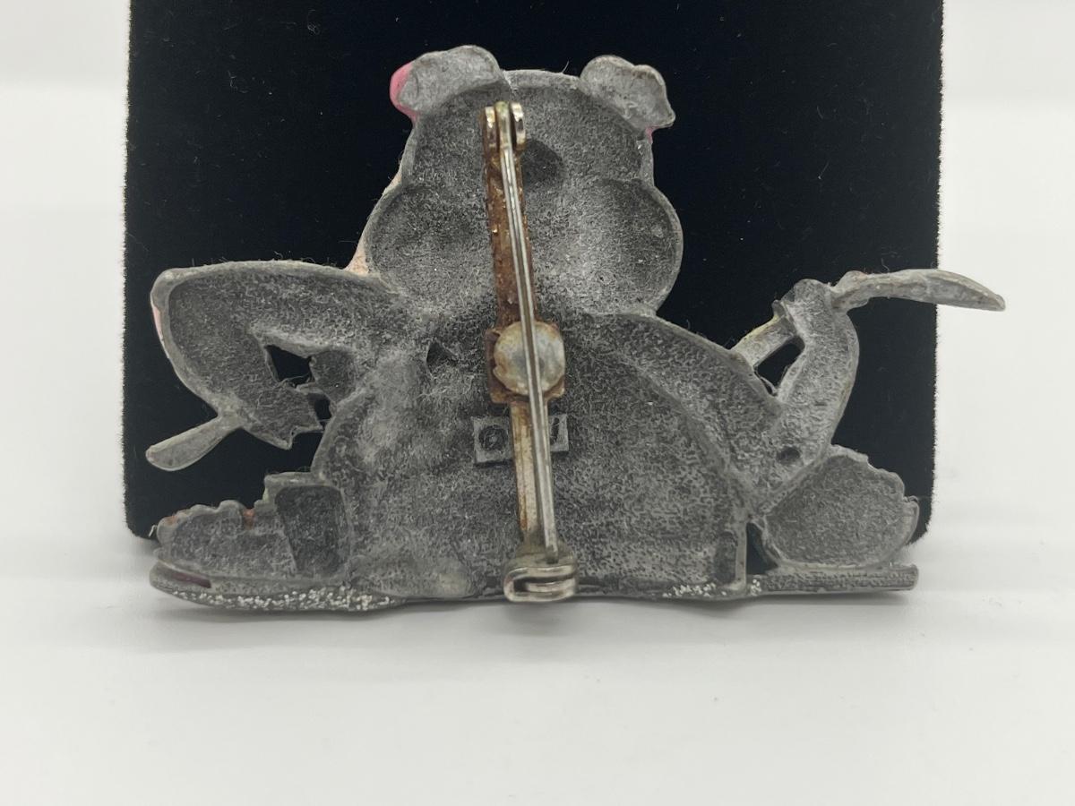 JJ Signed Enamel Feasting Pig Brooch. The pictures show condition, measurements if taken, and what is included in the lot. All items unless noted, are pre-owned and may or may not have been worn. Unless noted in the pictures or description, there are no boxes for the jewelry. Shipping will be offered at the actual shipping cost to your zip-code plus $5.00 for packing and handling. We can do combined shipping. Items over $50.00 will have an added insurance charge, and will be signature required for delivery at the buyers expense. All lots have a Buyers Premium of 15%. For a shipping quote, please email with zip code and items (lot) numbers. Treasure Me Estate Sales offers shipping as a courtesy and in doing so, reserves the right to choose the shipping supplies including whether not to send in an envelope or box to protect the integrity of the item. When the auction closes, and all items have sold, you will receive an invoice with all of your winning items. If you need shipping, and there is not a shipping charge on the invoice, please email for a quote and new invoice will be sent with shipping charges and pay at that time. Paying through PayPal helps so we can generate a label with tracking, but is not required. Thank you and please email with any questions.