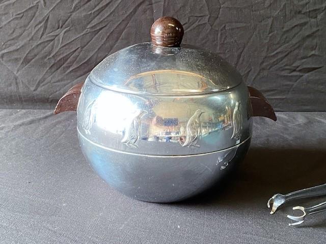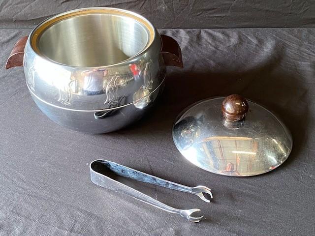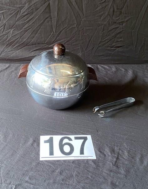 Hot/cold server. Has ice tongs. Estimated weight of lot: 3lbs. Measurement: 8"H x 10"diam