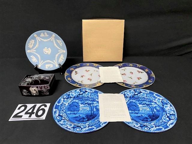 Includes: Abalone & lacquer jewelry box, Wedgewood plate & 4 tin plates (Metropolitan Museum of Art). Estimated weight of lot: 5lbs. Measurement: 9"diameter (Wedgewood Plate)
