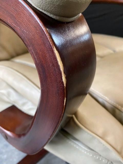 No obvious signs of damage to leather. Some minor paint loss on right arm (pictured).