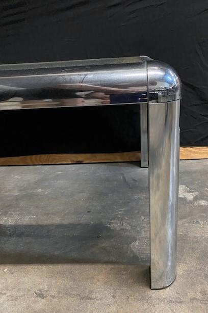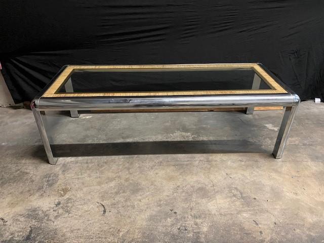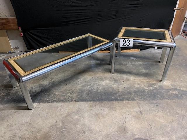 No chrome loss to note. Glass tops are clear from cracks or significant scratching. Measurement: 52"L x 21"W x 14.5"H (coffee table) | 28"L x 22"W x 20"H (end table)