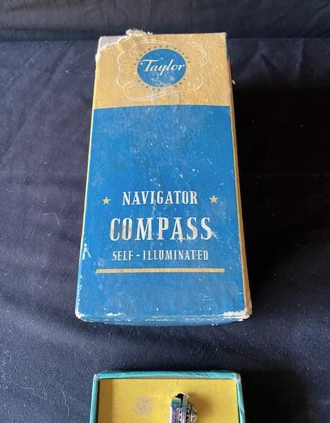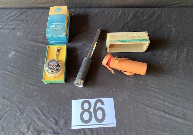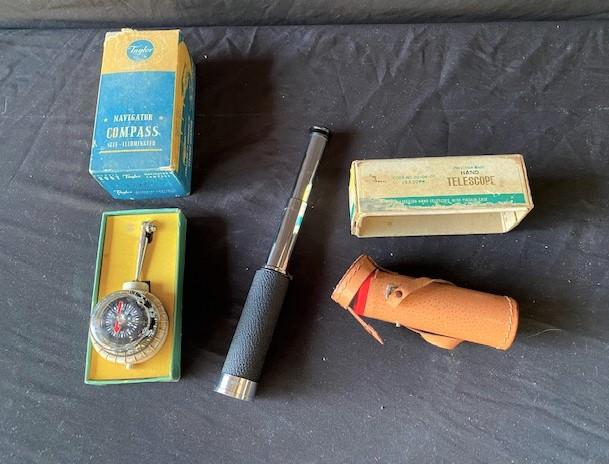 Includes: vintage compass (vintage navigator) & hand telescope. Estimated weight of lot: 5lbs. Measurement: 6 1/4"L x 3"W x 2 1/2"D (largest item)