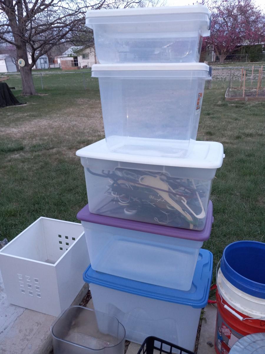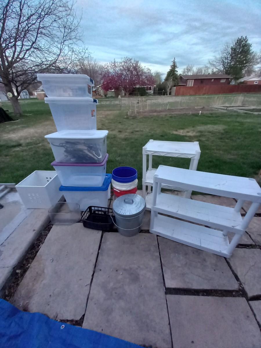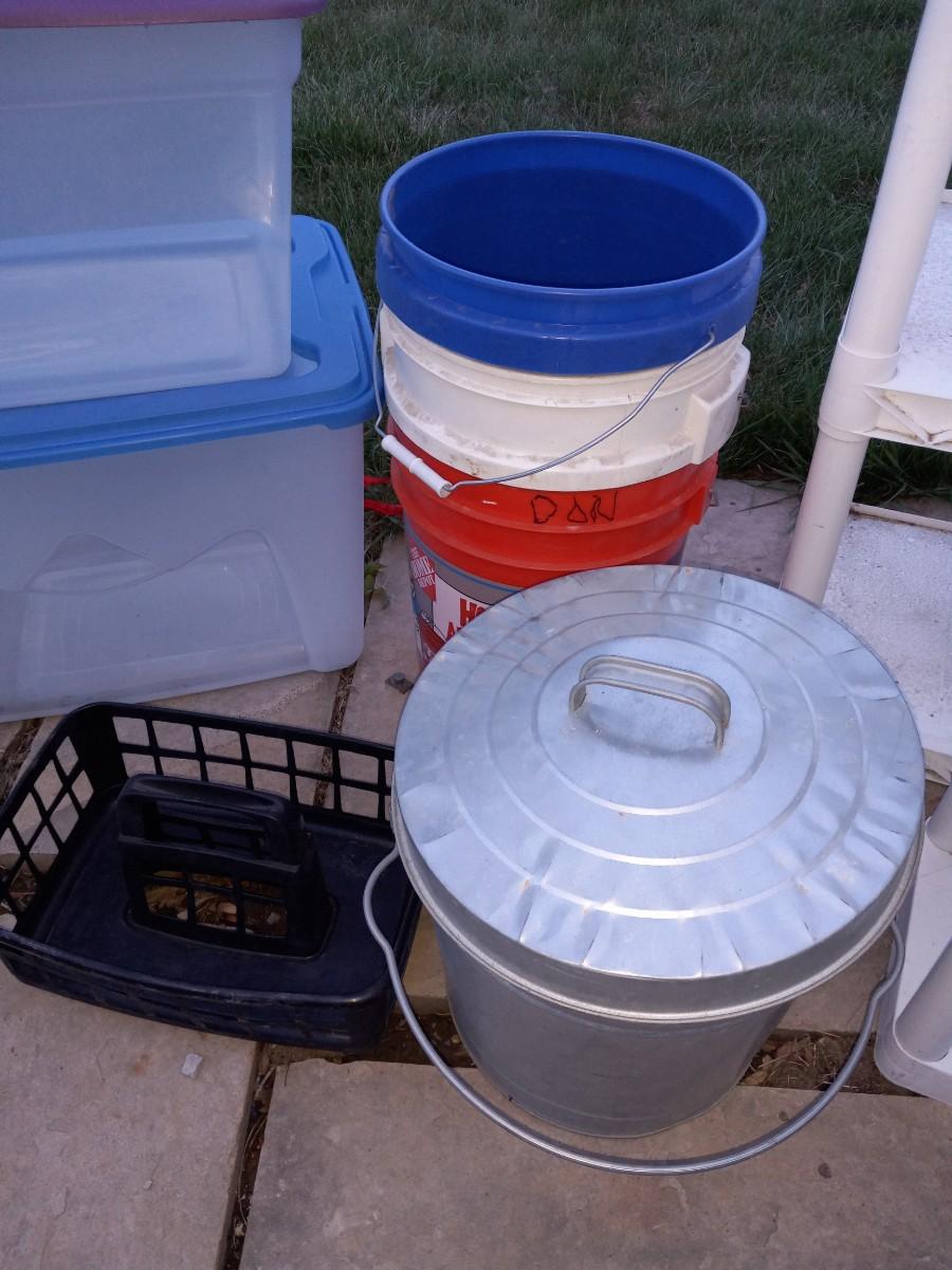 STORAGE CONTAINERS, PLASTIC SHELVES, GALVANIZED TRASH CAN AND 5 GALLON BUCKETS